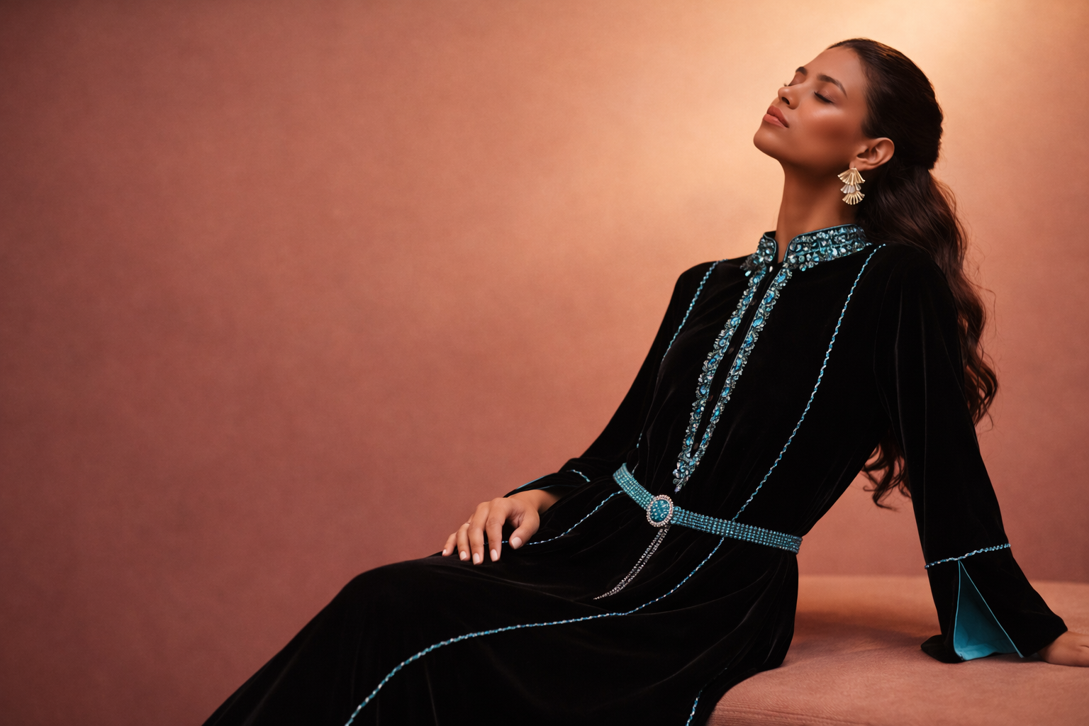Sky Blue Embroidered Kaftan with Tulle Trim