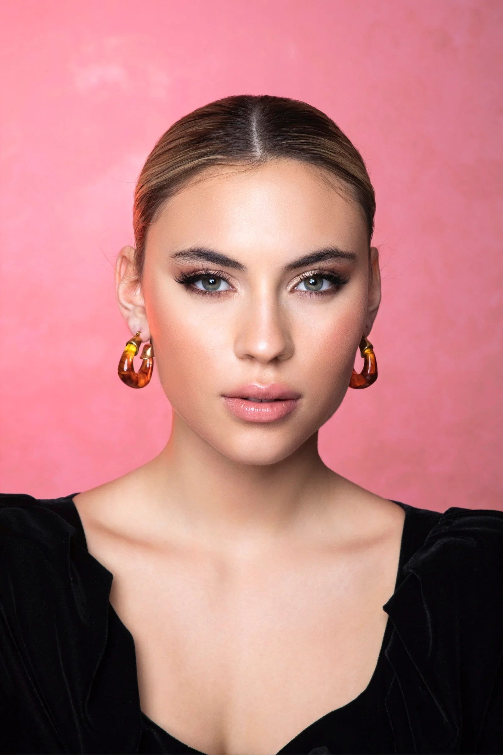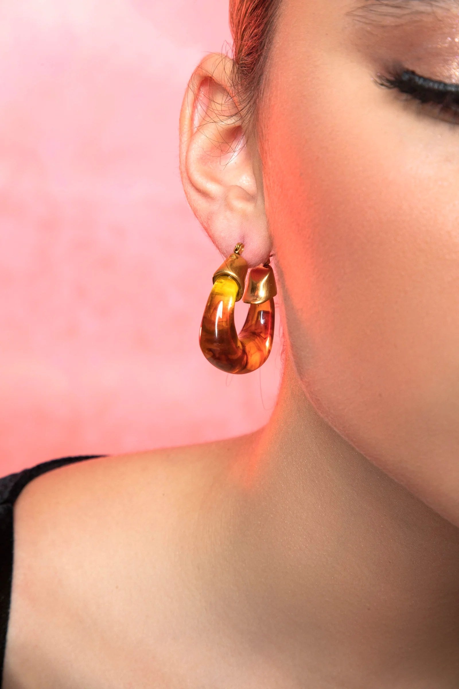This earring showcases a warm-toned marble hoop with swirling shades of amber, honey, and caramel. The natural marbled pattern gives it depth and character, while the gold-toned cap adds a sleek, modern touch. With its softly curved and slightly irregular form, the piece strikes a perfect balance between earthy elegance and bold sophistication.