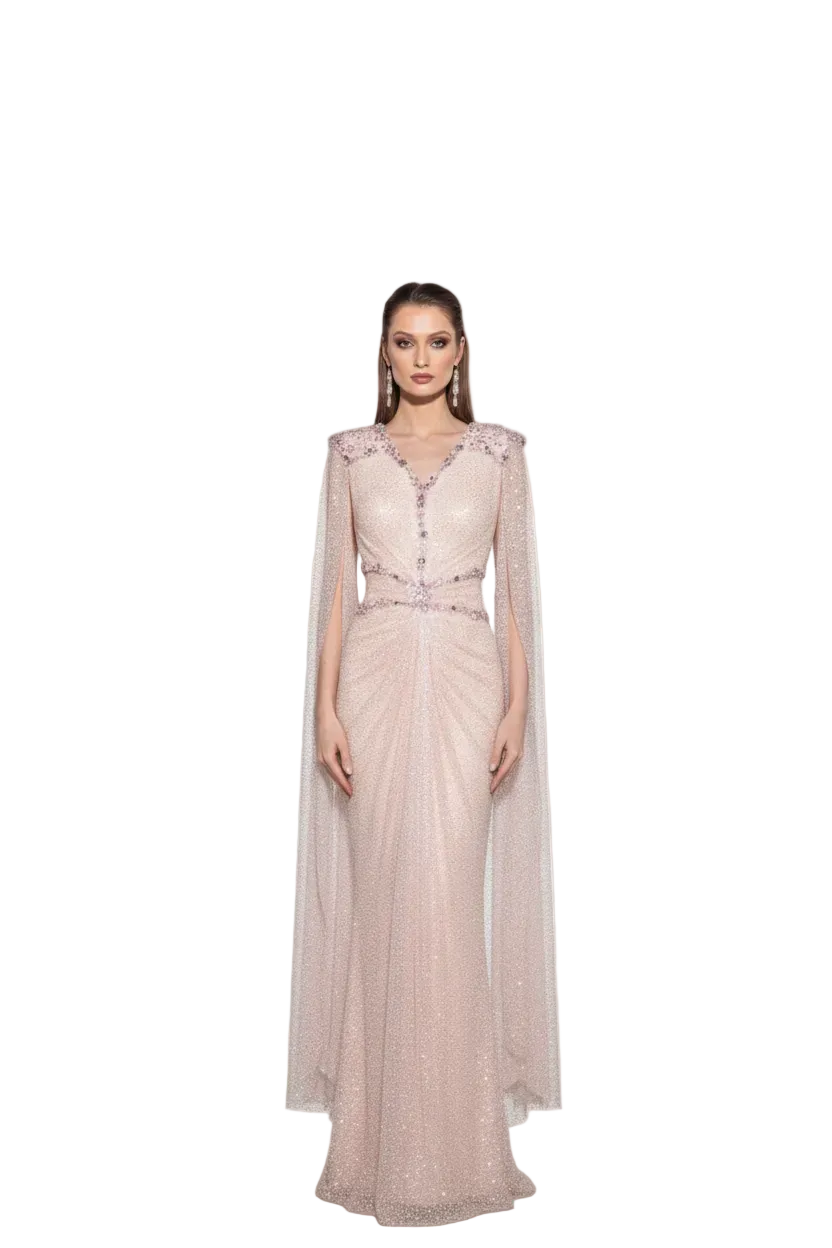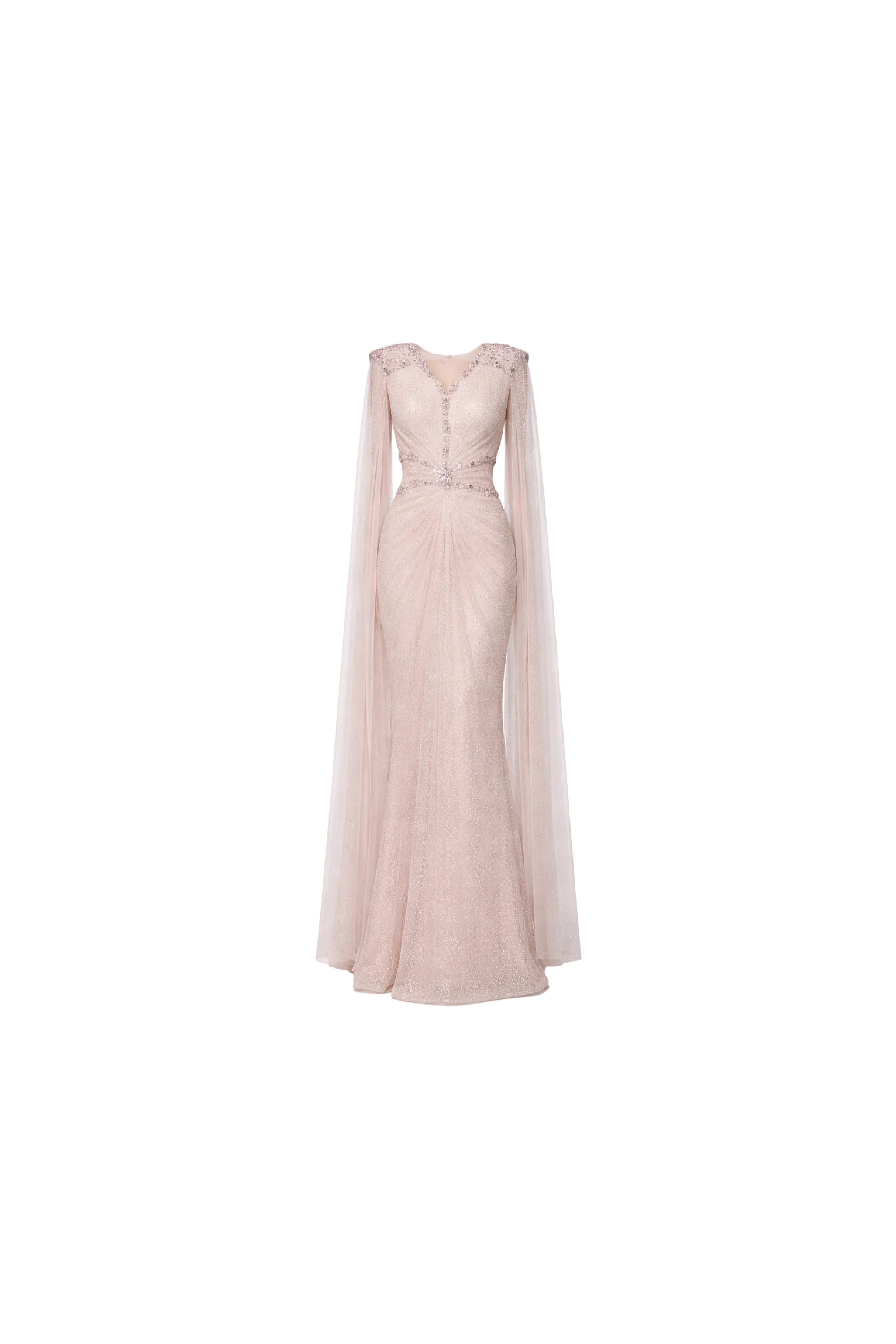 its delicately beaded cape elevate women feminine energy and adds a luxurious touch to the piece.