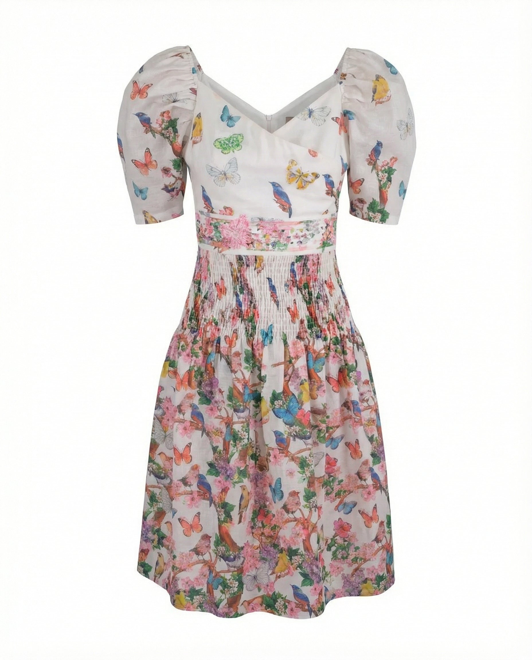 Birds Silk Dress with Banded Waist