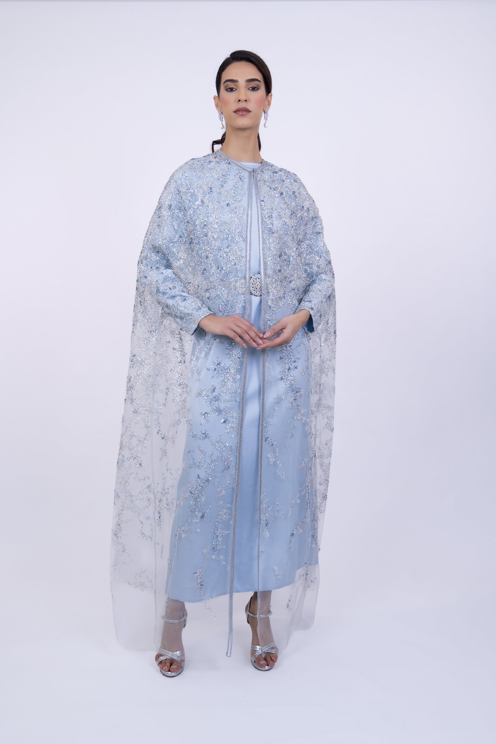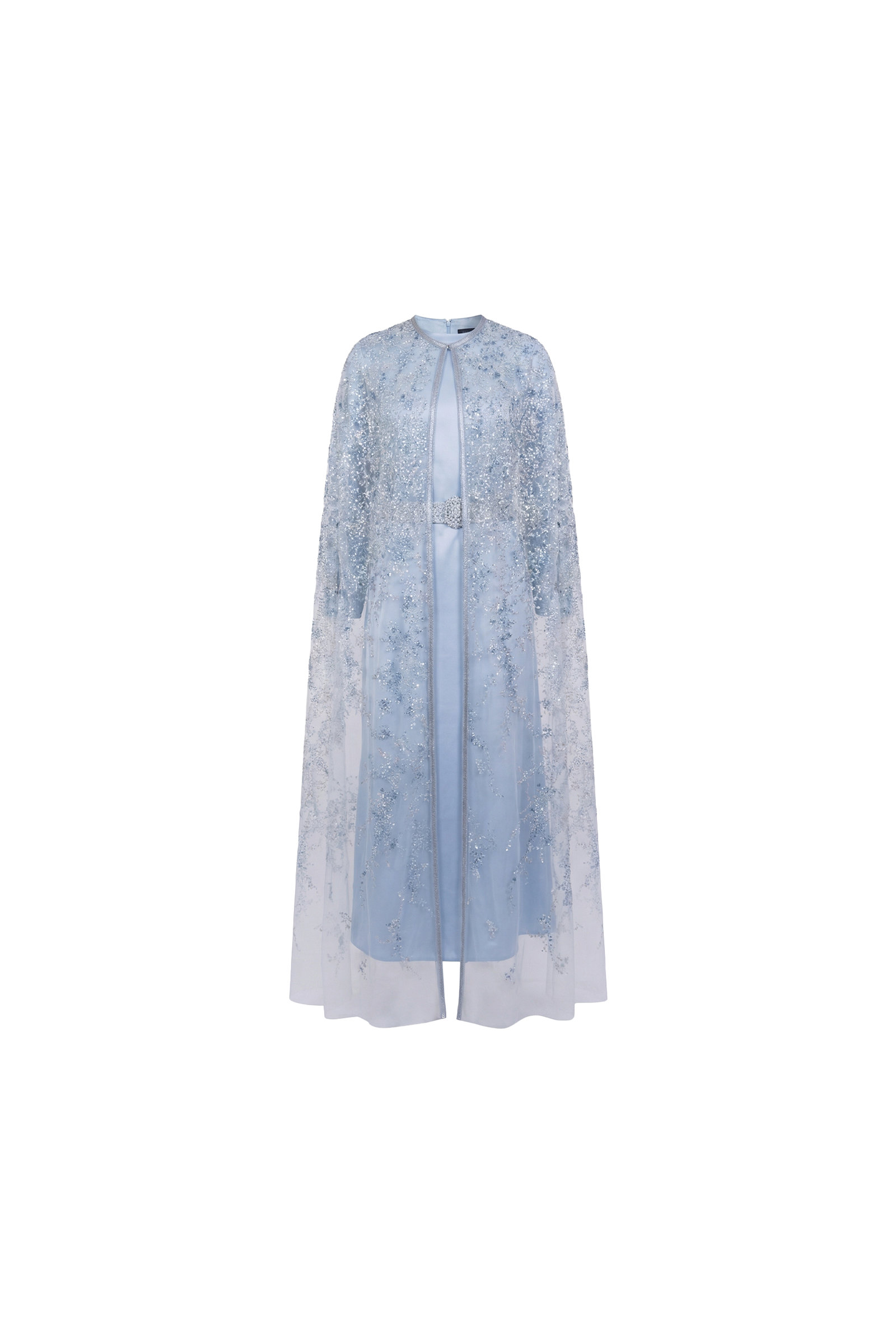 A luminous sky-blue design featuring a fluid satin under dress layered beneath a delicately embroidered sheer cape.