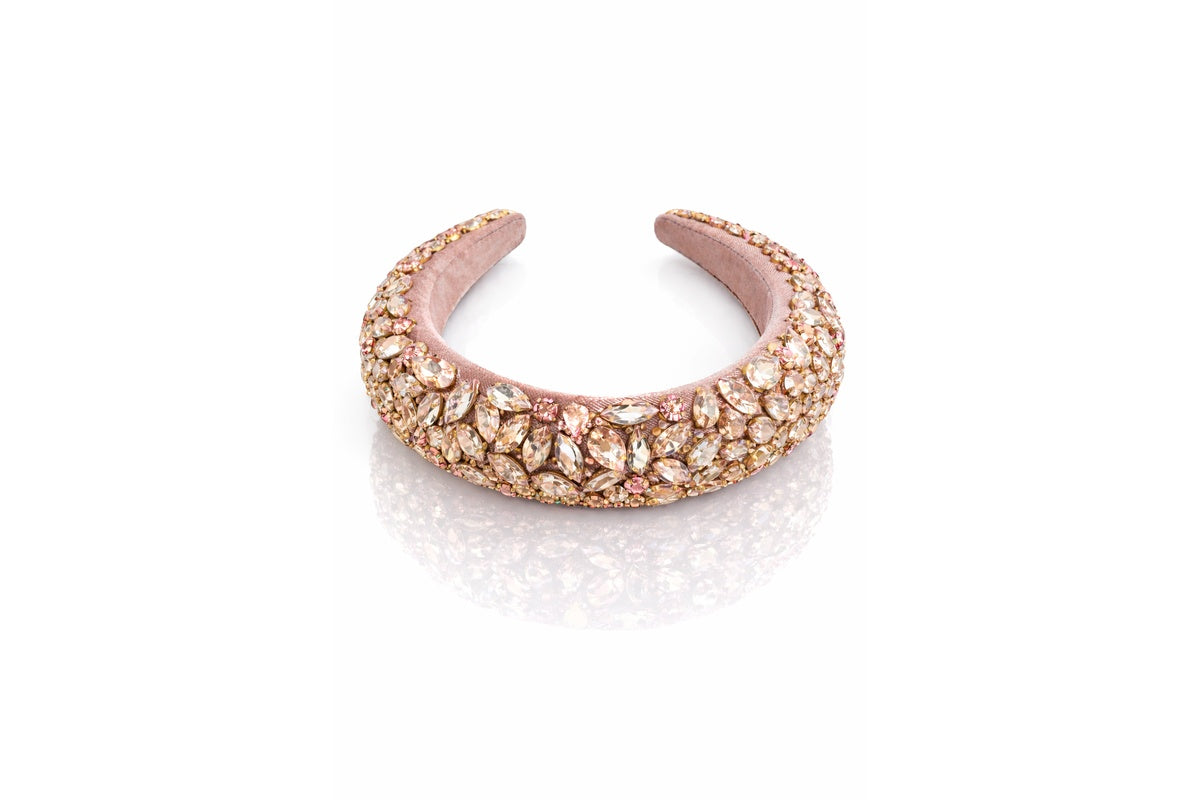 A soft blush velvet padded headband lavishly encrusted with champagne and rose-toned crystals, set in warm gold detailing. Radiating feminine elegance and refined sparkle, this statement piece adds a luminous couture touch to both evening and occasion styling.