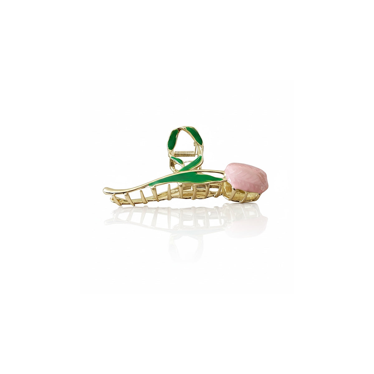 An elegant gold-tone hair clip inspired by a blooming tulip branch, featuring glossy green enamel leaves and a soft blush-pink tulip bud. The slender botanical silhouette creates a refined and feminine accessory with a delicate garden-inspired charm.