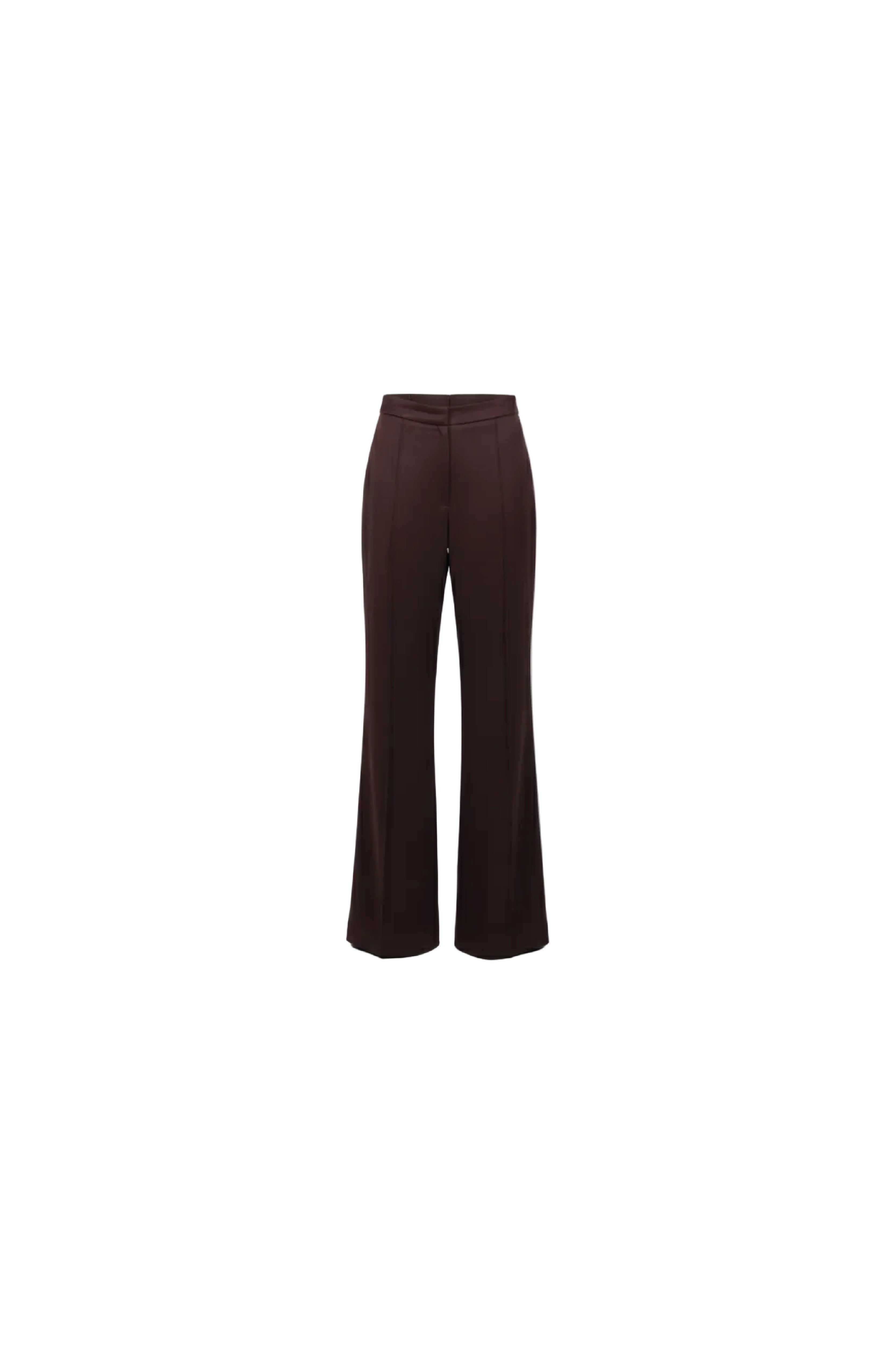 Tailored wide-leg joukh trousers in a rich chocolate-brown tone, designed with a clean front, soft drape, and elongating pressed crease. The fit is high-waisted with a smooth waistband, creating a refined, effortless silhouette.