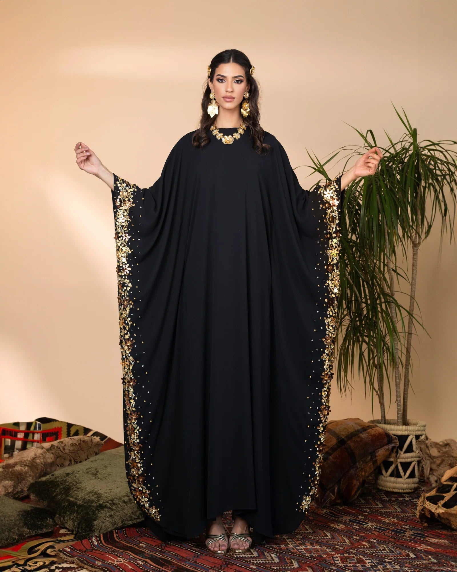 luxurious silk georgette abaya, designed for graceful elegance and refined modesty. Its flowing silhouette is adorned with intricate embellishments along the borders and sleeves, adding a subtle shimmer to its sophisticated drape. The lightweight fabric ensures effortless movement, making it a perfect choice for special occasions.