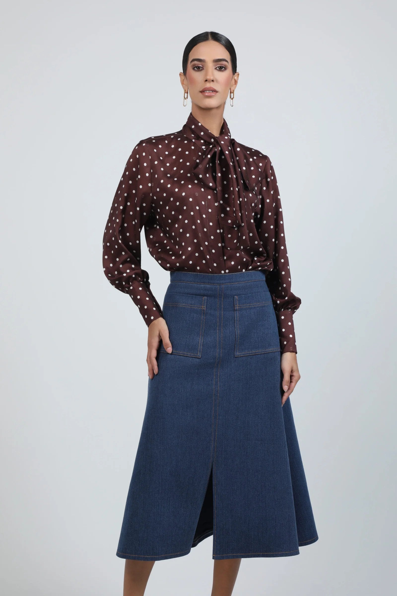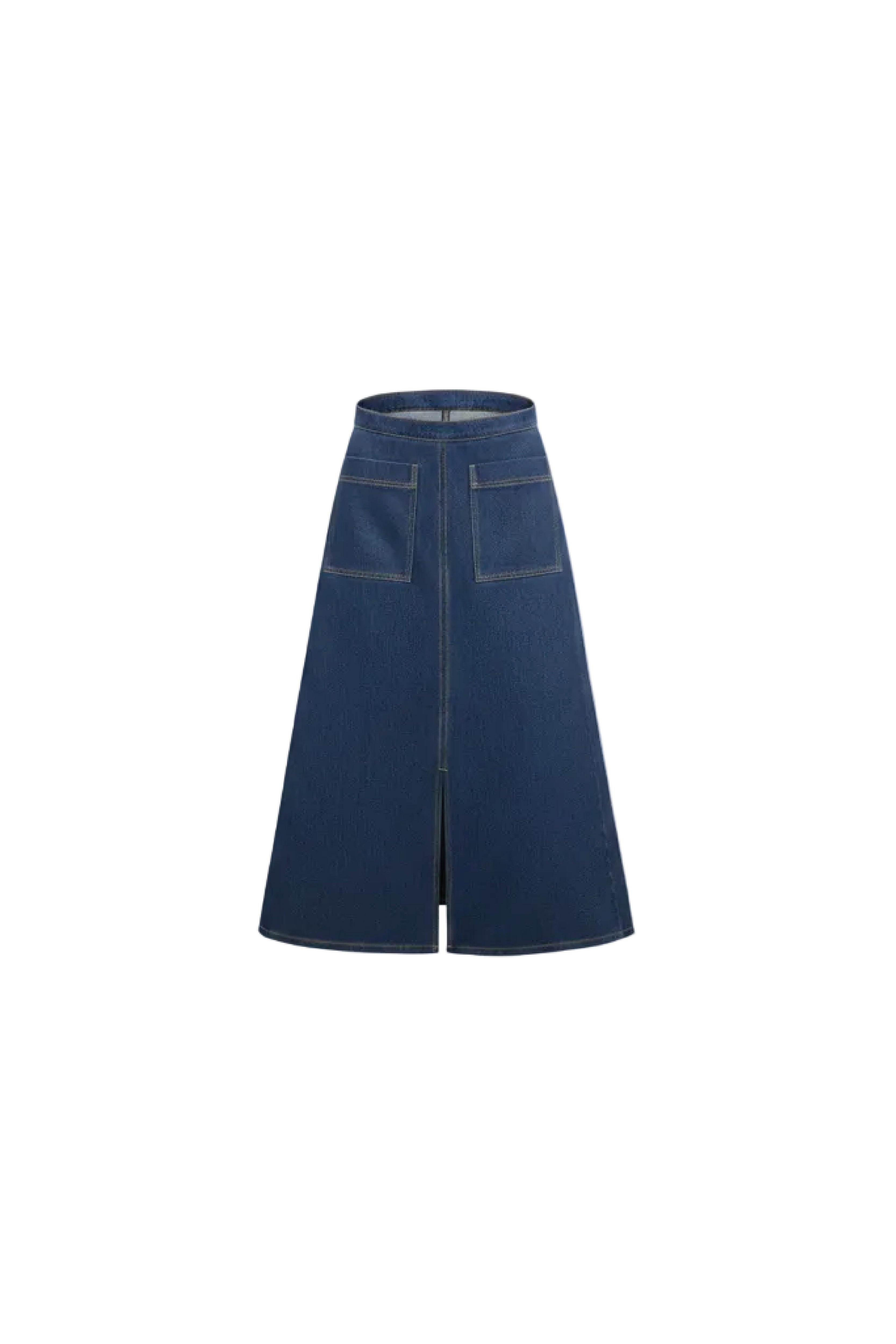 This piece is a structured A-line denim midi skirt designed with a clean, architectural silhouette. It features two front patch pockets and contrasting topstitching that defines the lines of the design. The skirt falls below the knee with a front center seam and subtle flare, giving it elegant movement while keeping a modern, tailored look. Perfectly balanced between casual and refined.