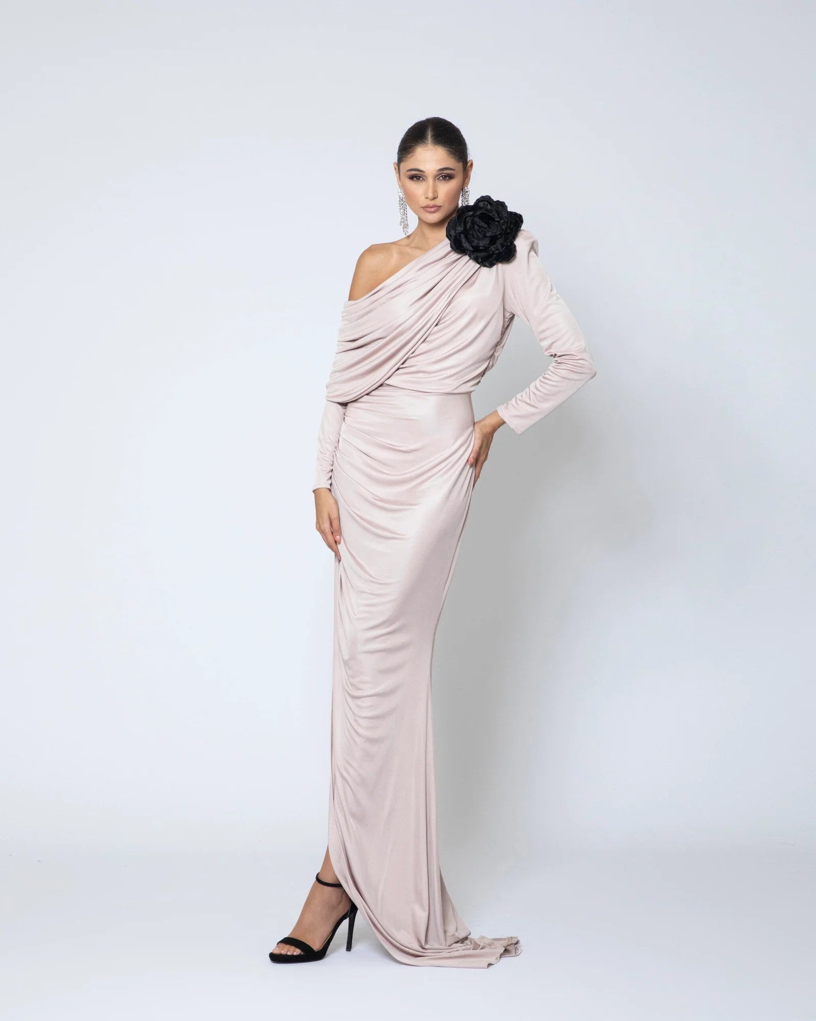 This dress is crafted from soft silk jersey in a light beige tone, offering a sleek and elegant drape. It features an asymmetrical off-shoulder design with gathered details, enhancing the fluidity of the fabric. A black floral embellishment on the shoulder adds a bold, contrasting element, elevating the look with sophistication. Perfect for evening events, this dress combines comfort with elegance, making a graceful statement.