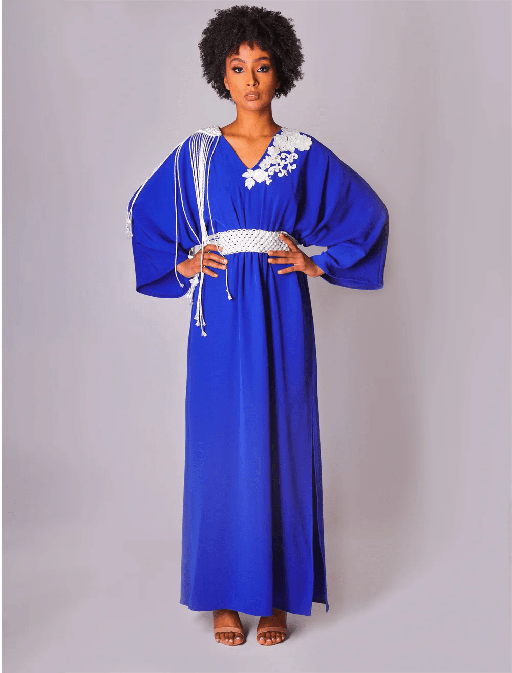 Our Handcrafted Blue Silk Crepe Macramé Dress epitomizes timeless elegance and sophisticated design. Crafted from the finest materials, it features intricate detailing that ensures you stand out at any event. Designed for comfort as well as style, the soft, flowing fabric drapes beautifully and is breathable, suitable for any season. Its classic blue color is universally flattering and versatile, perfect for dressing up with heels and jewelry or down with flats and a clutch. Maintain its quality with dry cleaning to preserve its beauty and intricate details over time. This dress is a timeless investment in style, offering confidence and compliments wherever you wear it.