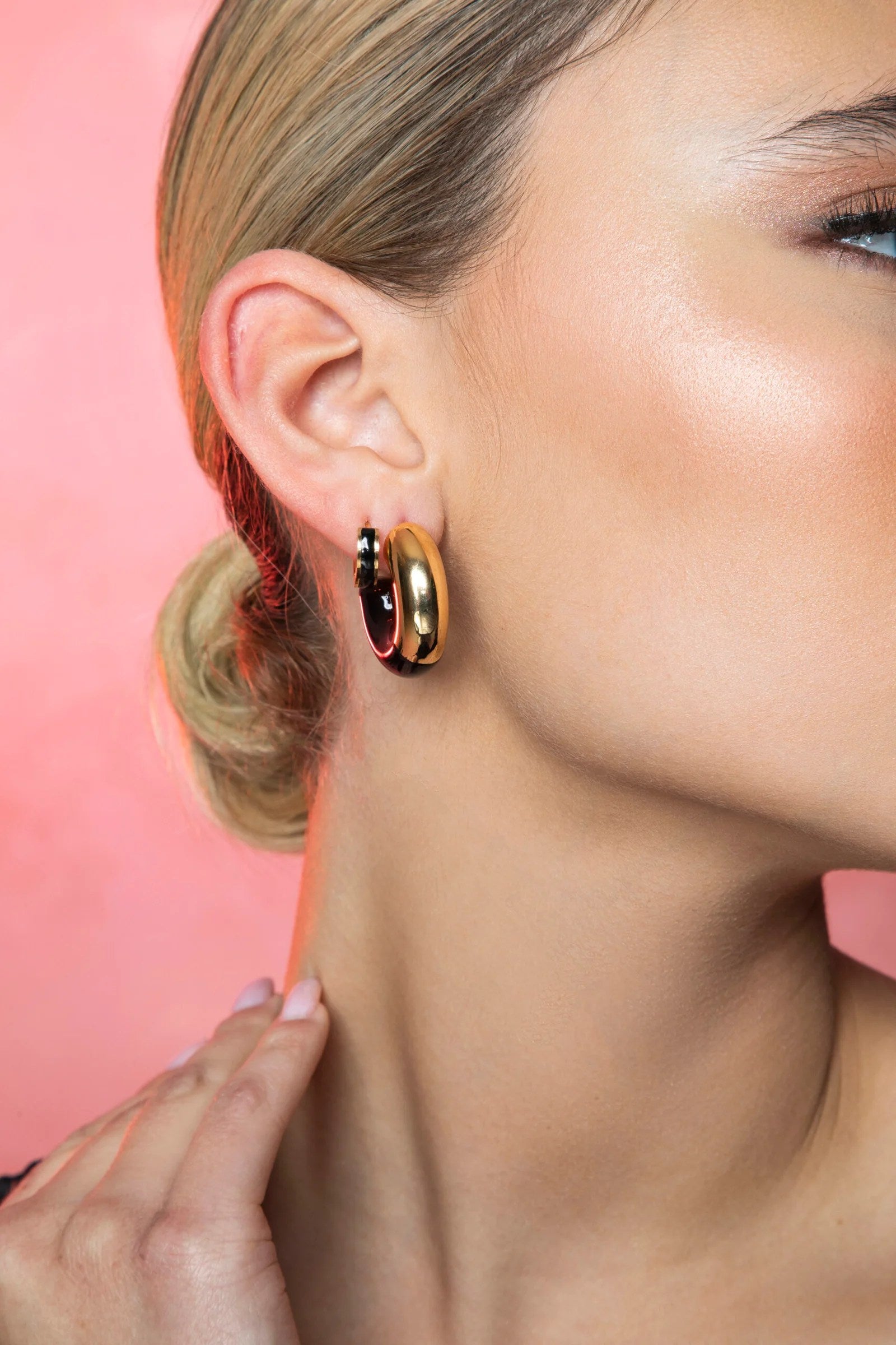 A sculptural earring featuring a stacked combination of glossy black and polished gold-tone loops. The contrasting tones offer a bold, modern edge while maintaining a refined and minimal aesthetic. Perfect for elevating everyday looks with a touch of artful design.