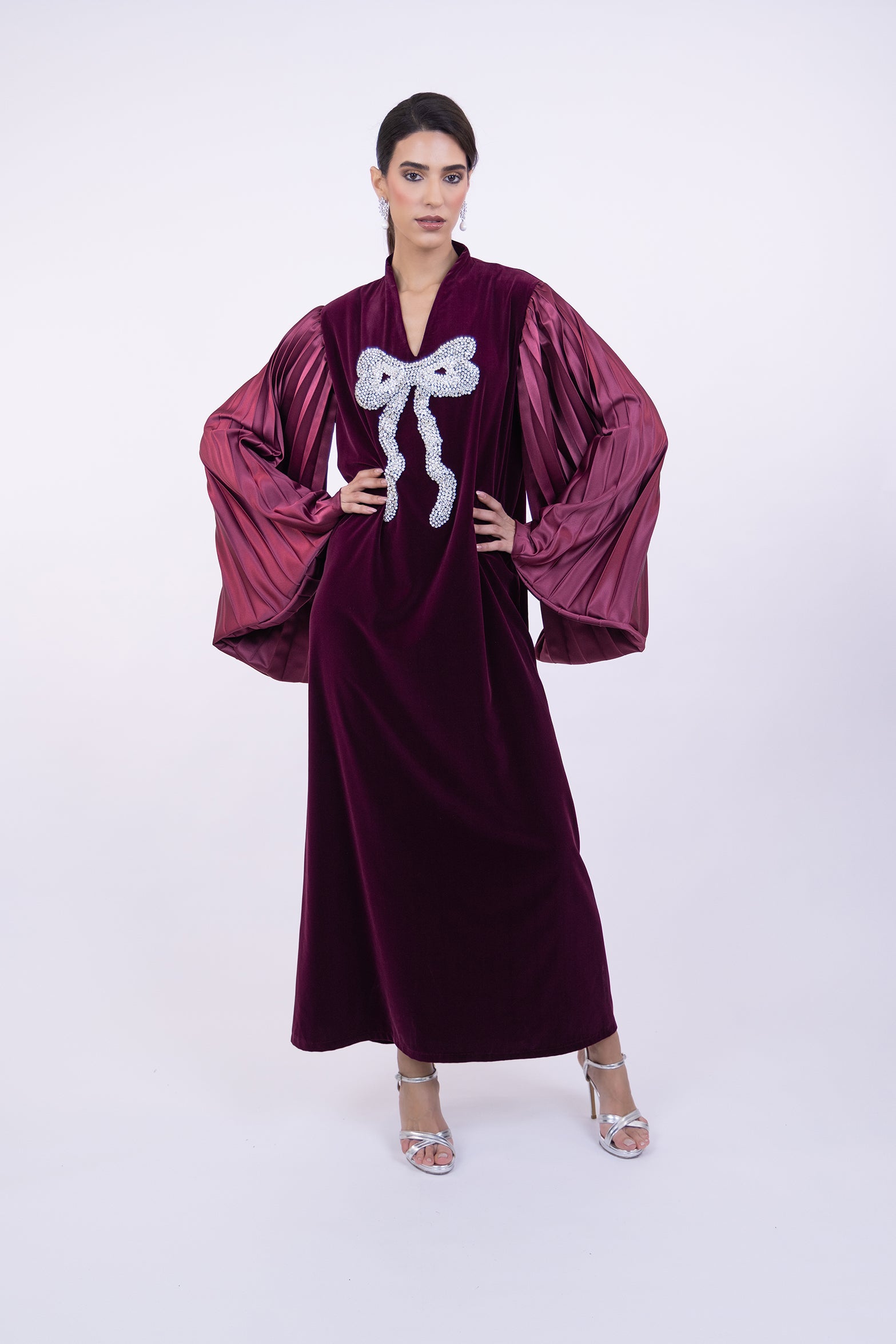 A refined velvet abaya designed with a sleek, elongated silhouette and dramatic razmir pleated sleeves that flow with every movement.