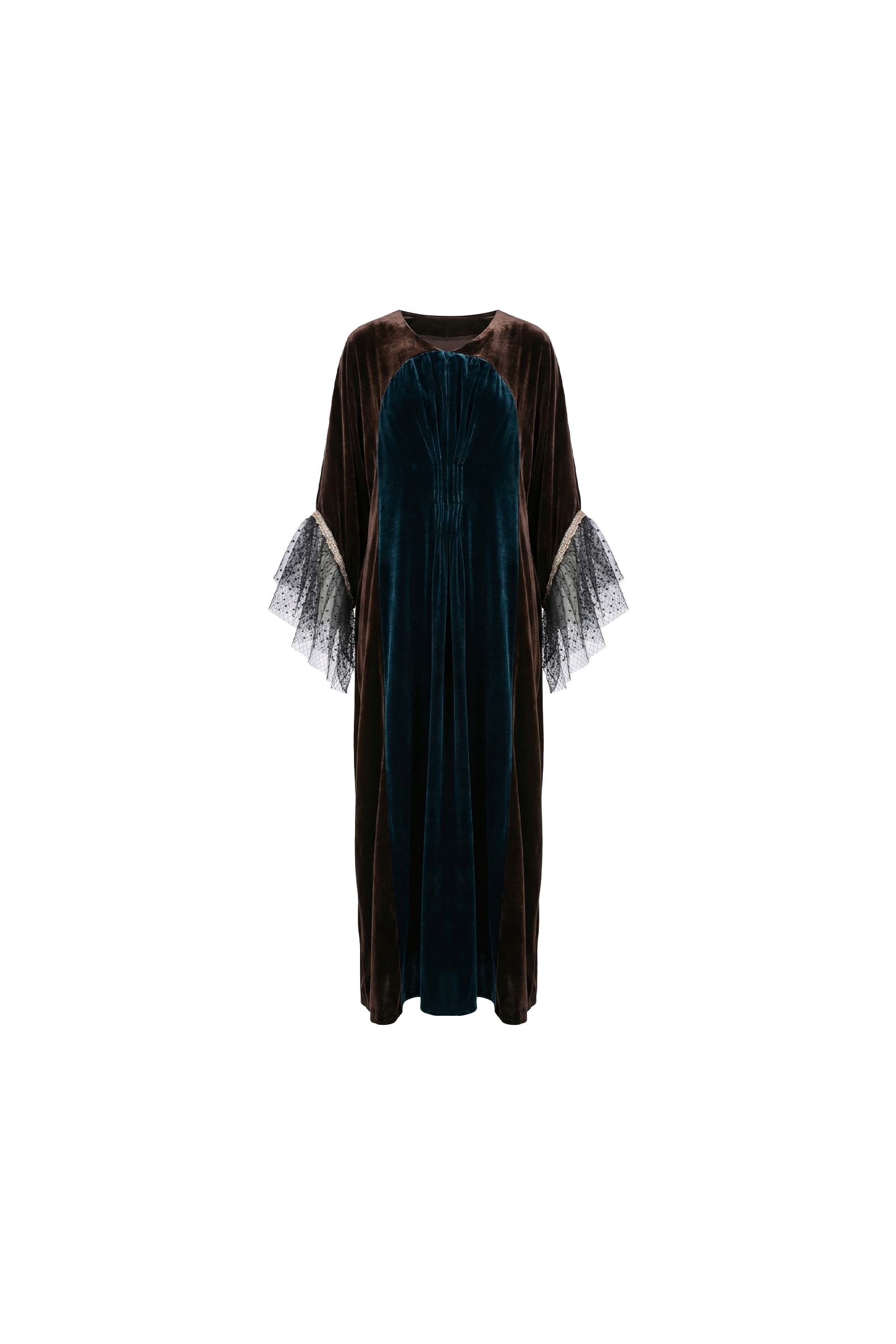 A sculptural velvet kaftan crafted in a striking dual-tone palette — deep teal velvet at the center framed by warm mocha velvet panels. The curved front construction creates a soft architectural silhouette, elongating the body with refined elegance.