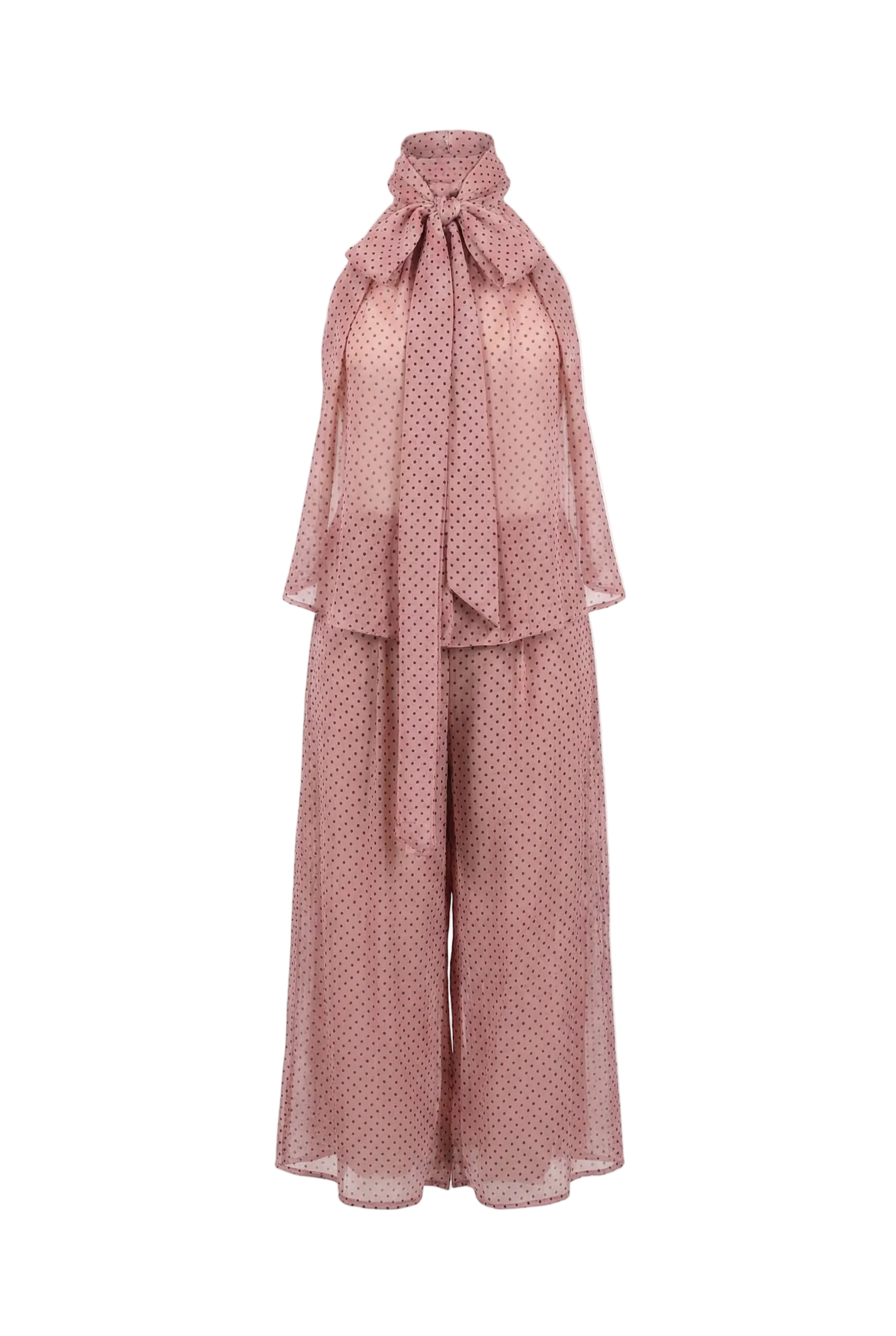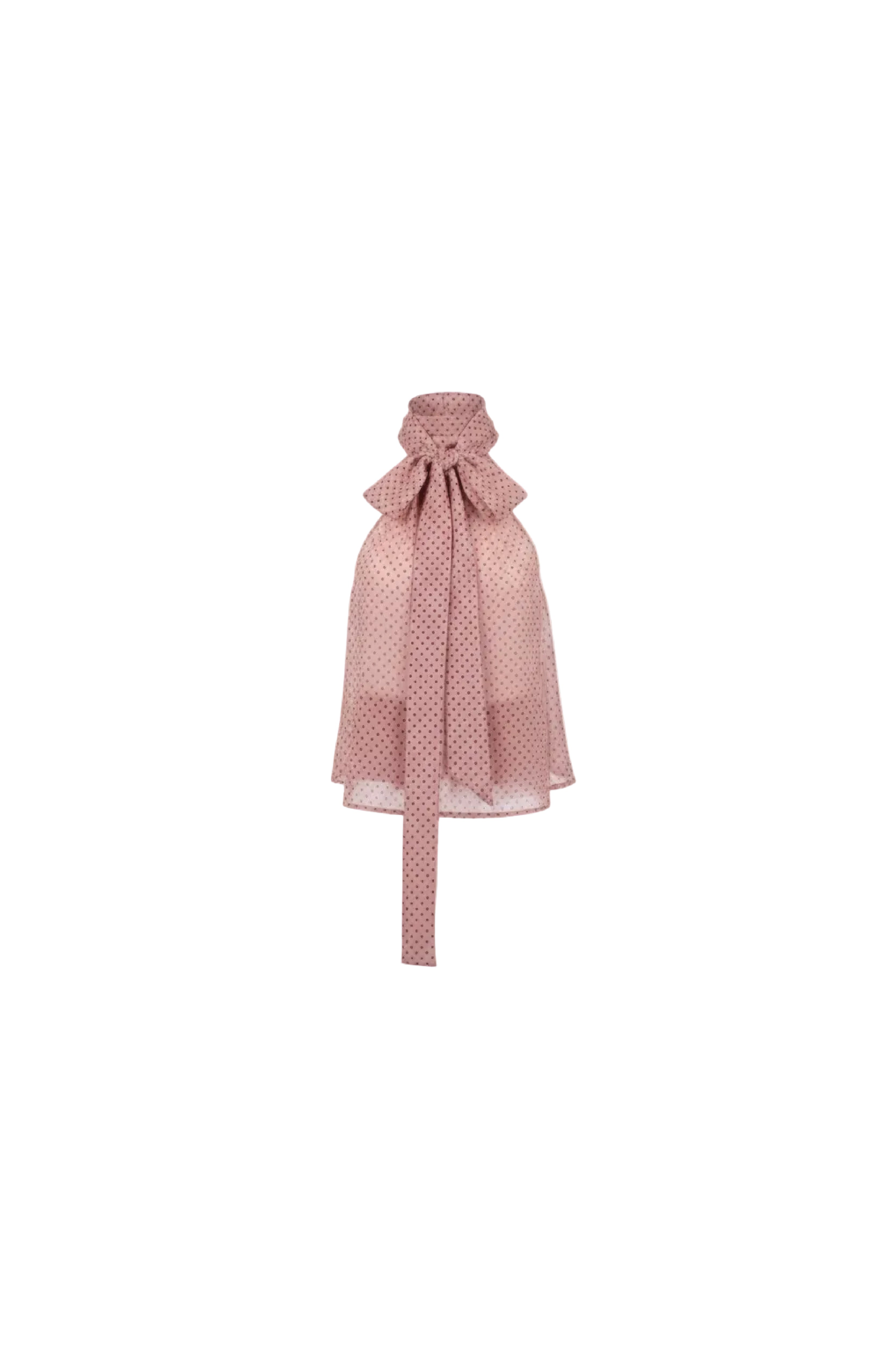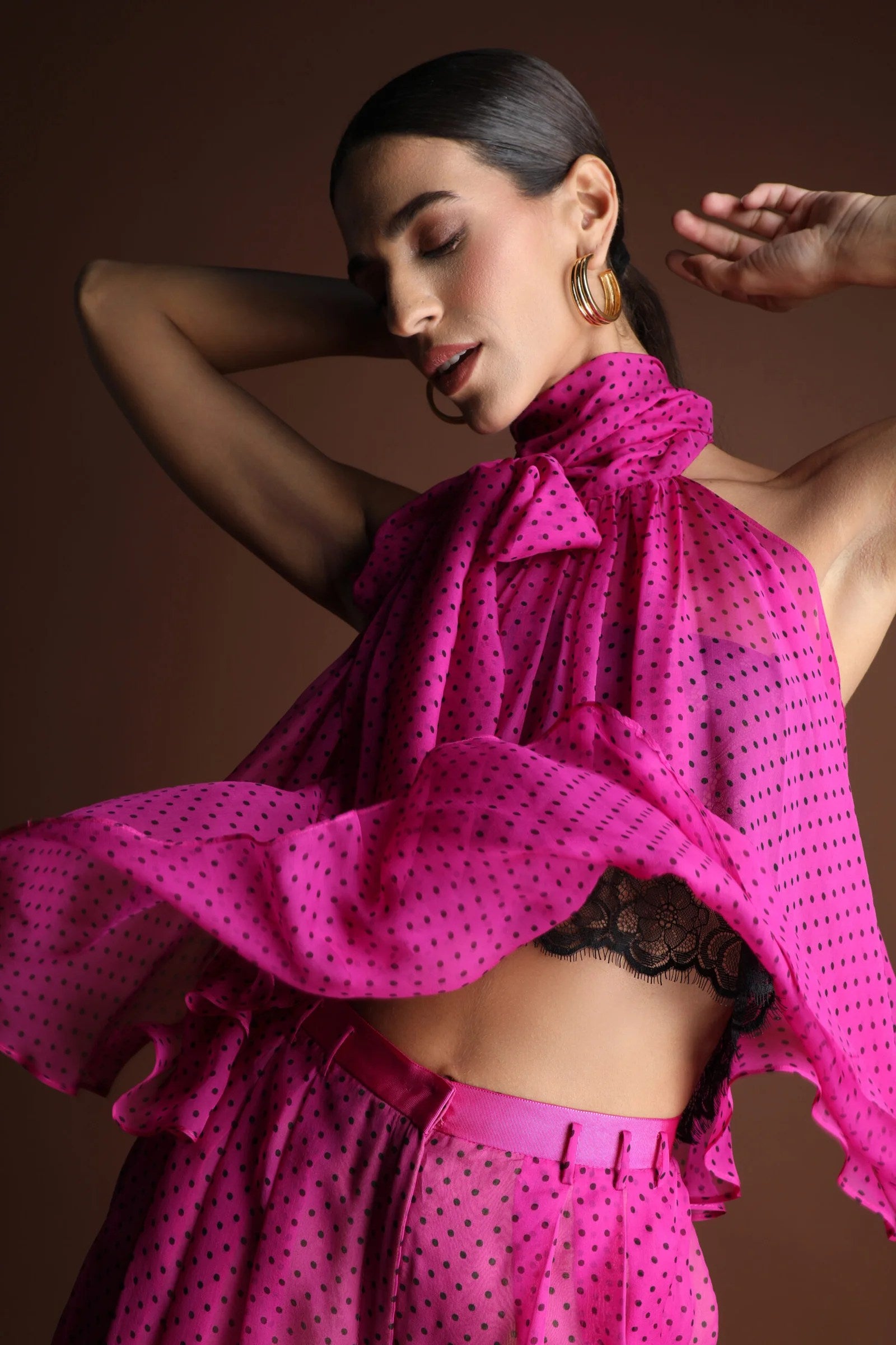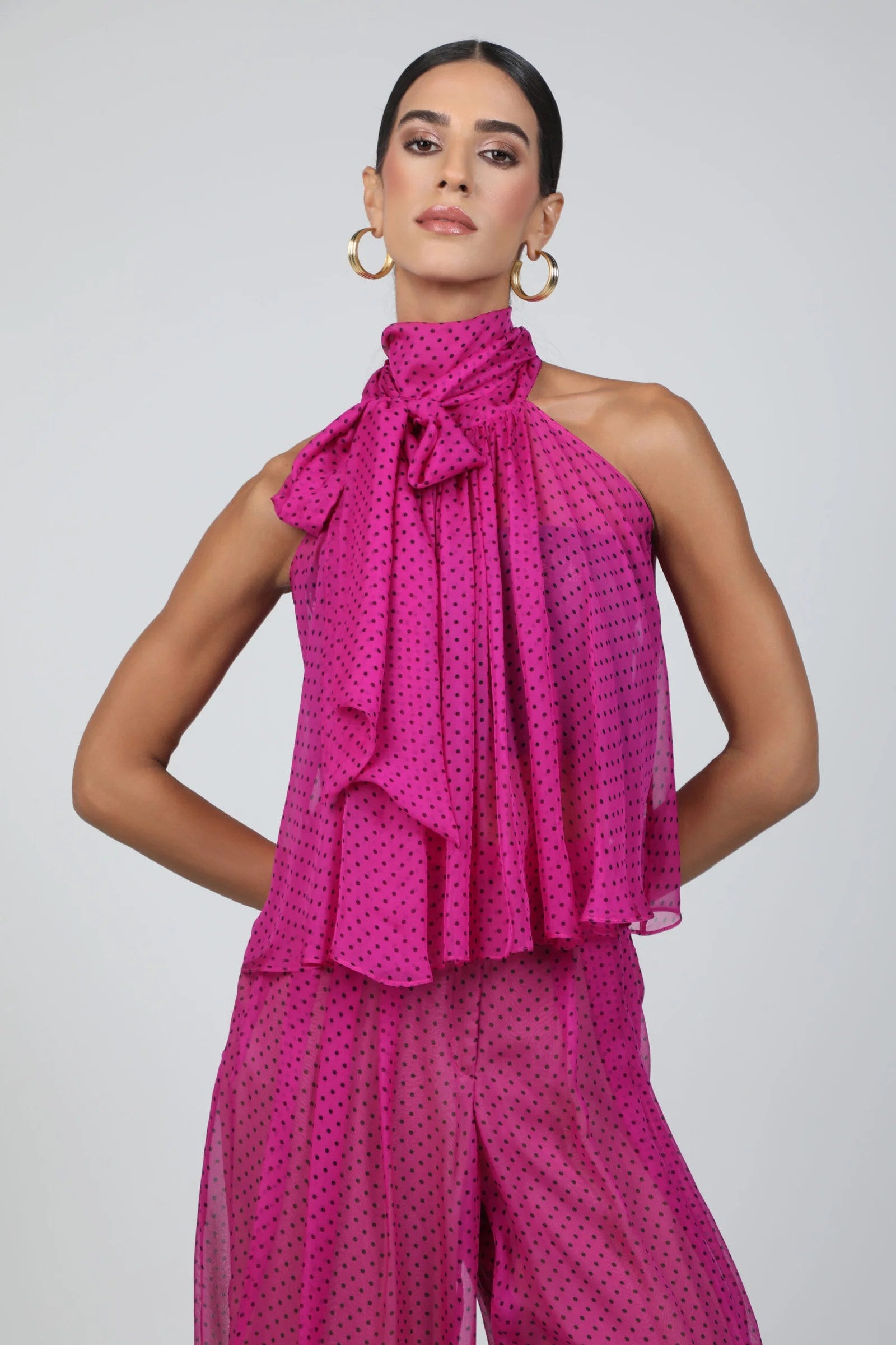 A sleeveless mousseline halter top, delicately printed with fine black dots. The airy fabric drapes fluidly around the neckline, finished with a romantic bow tie for an elegant yet effortless charm. Its semi-sheer texture and graceful movement bring light sophistication perfect for day-to-night refinement.