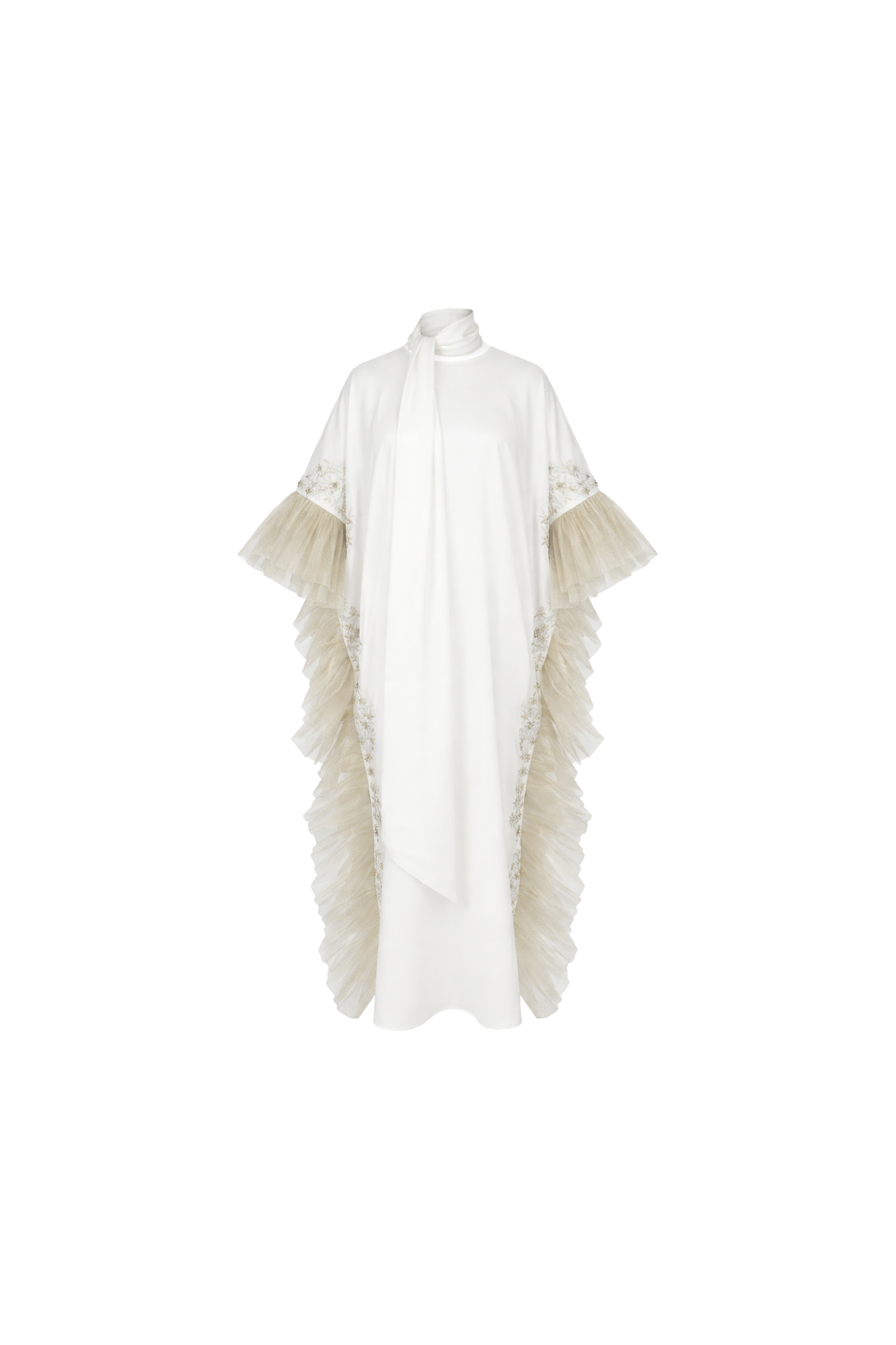 Delicate floral embroidery graces the sleeves and sides, while soft layered gold tulle ruffles cascade along the panels, adding movement and couture drama. Finished with an elegant satin neck tie, this piece blends purity with regal sophistication.