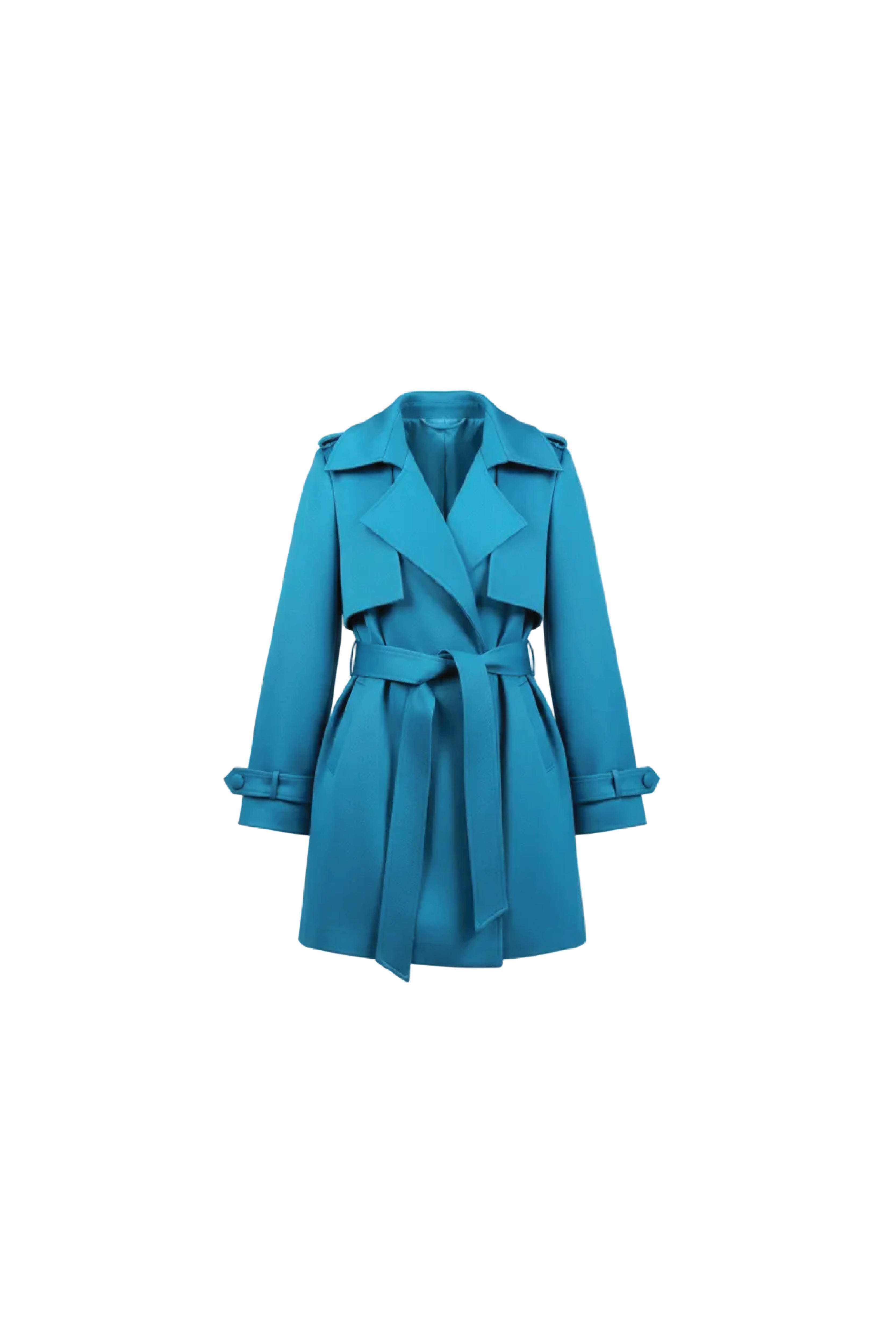 A structured short trench jacket in luminous teal, crafted from silk-blend fabric that drapes with fluid elegance. It features wide lapels, storm flaps, and adjustable cuff straps, with a tonal belt that defines the waist. The slightly cropped length modernizes the classic trench silhouette, giving it a contemporary and feminine edge. A versatile statement piece that transitions effortlessly from daytime sophistication to evening allure.