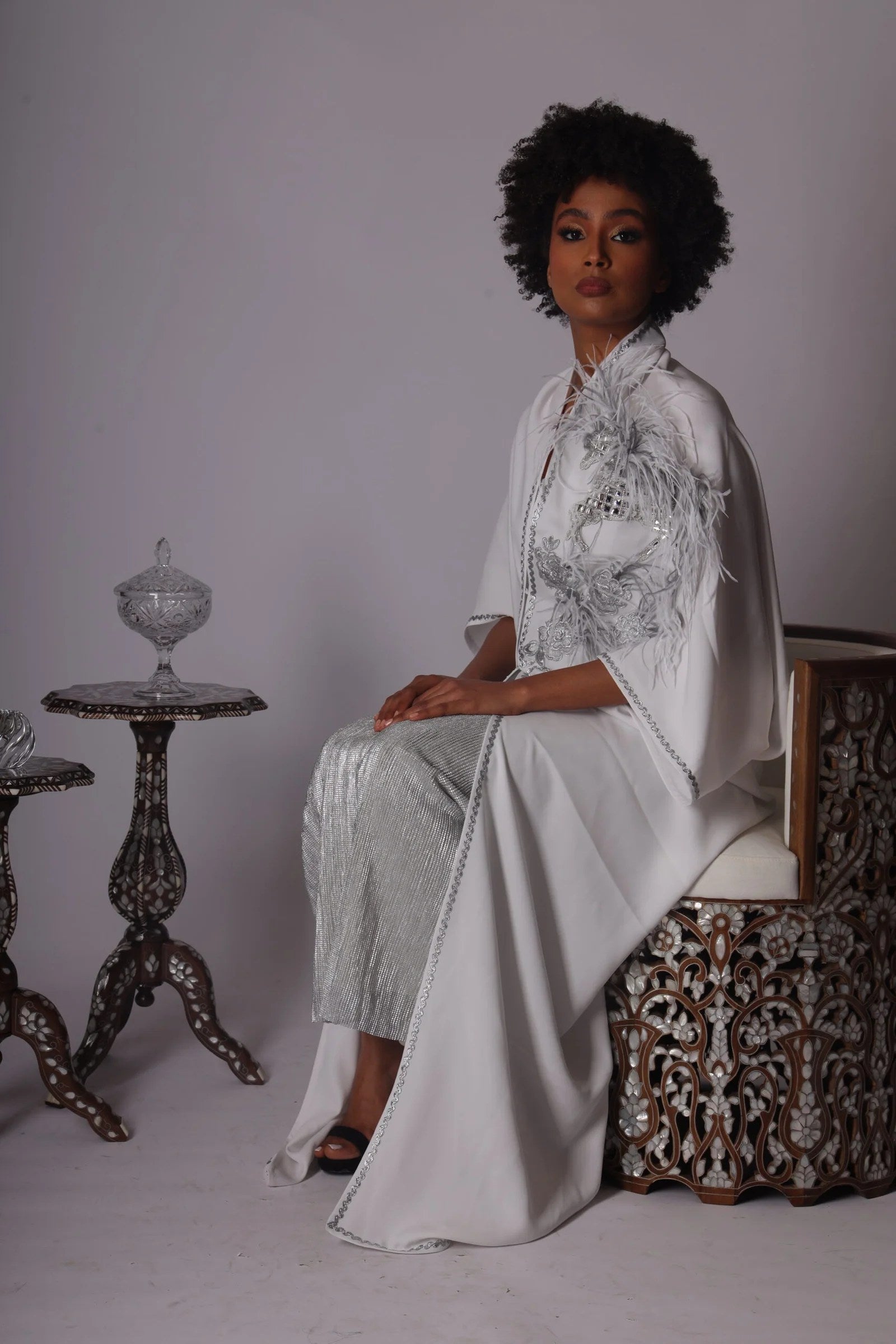 Our Chic White Silk Crepe Abaya epitomizes timeless elegance and sophisticated design. Crafted from the finest materials, it features intricate detailing that ensures you stand out at any event. Designed for comfort as well as style, the soft, flowing fabric drapes beautifully and is breathable, suitable for any season. Its classic white color is universally flattering and versatile, easily dressed up or down to suit any occasion. Maintain its quality with dry cleaning to preserve its beauty and intricate details over time. This abaya is a timeless investment in style, offering confidence and compliments wherever you wear it.