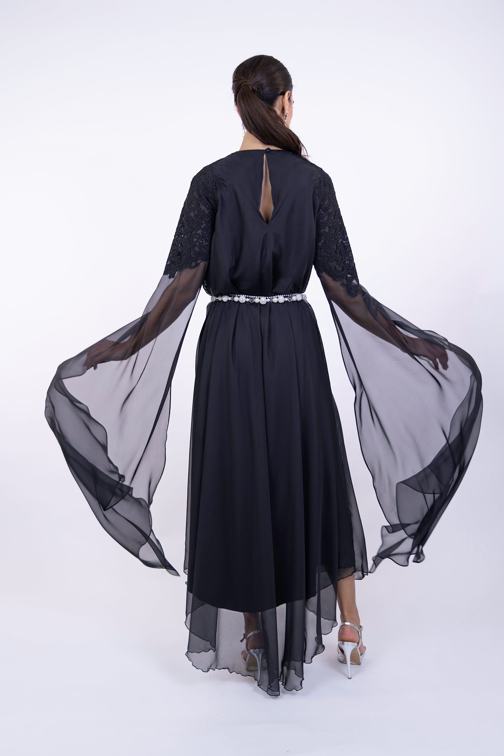 A flowing black mousseline abaya designed with airy, cascading sleeves that move with effortless grace.