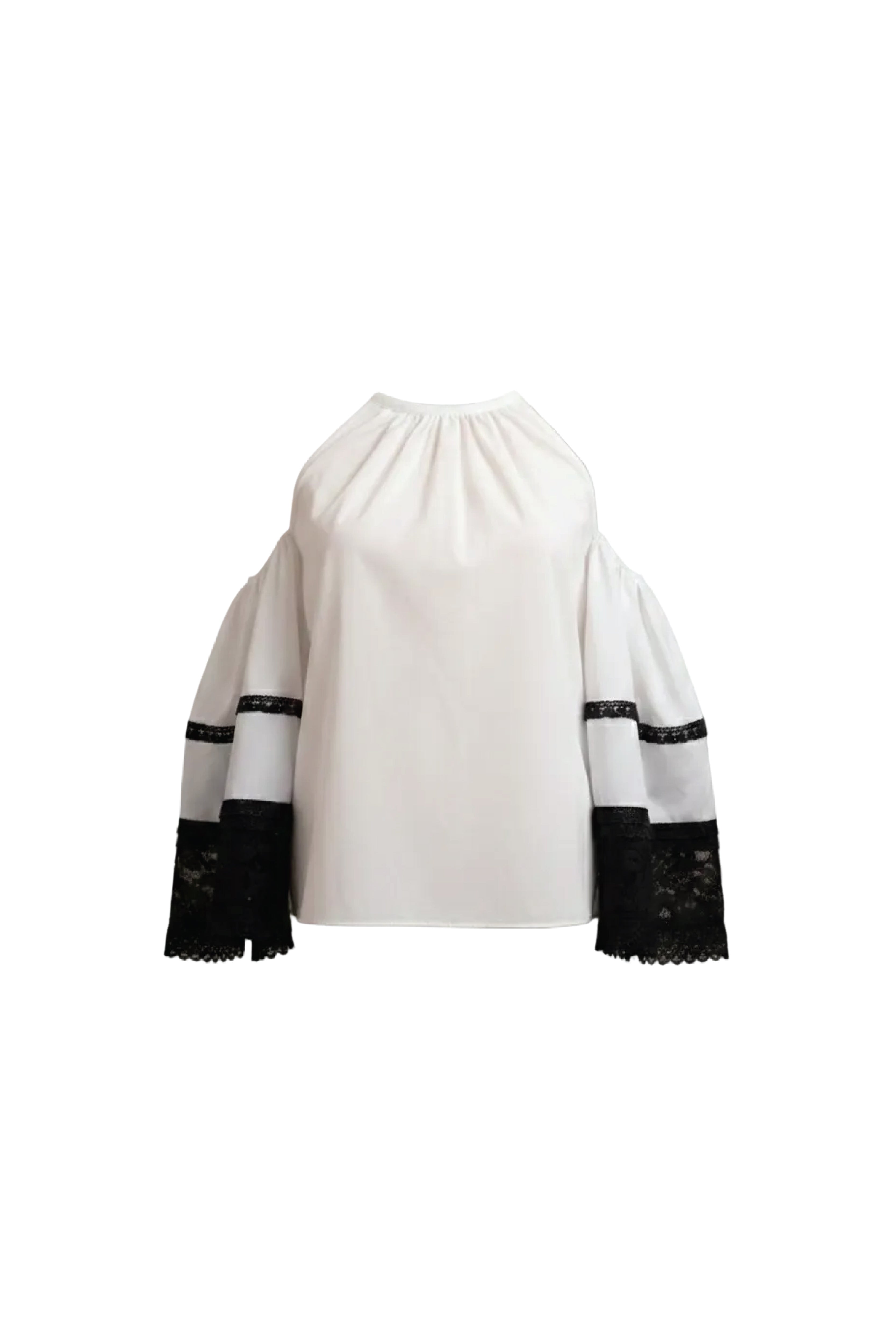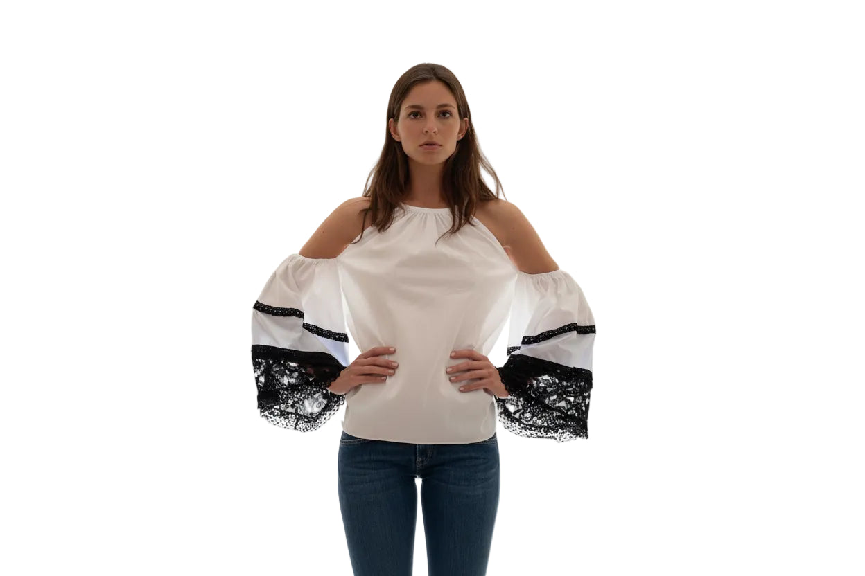 Crafted from a luxurious cotton textured fabric, this top features an alluring open shoulder design that adds a touch of contemporary flair to any ensemble. The addition of black lace detailing at the sleeves' end lends an elegant and sophisticated edge to the piece. Designed with the modern woman in mind, it prioritizes both style and comfort, ensuring a flattering fit and ease of movement. This top is not just a garment but a statement of empowerment, inspiring women to embrace their strength and confidence while feeling comfortably chic.