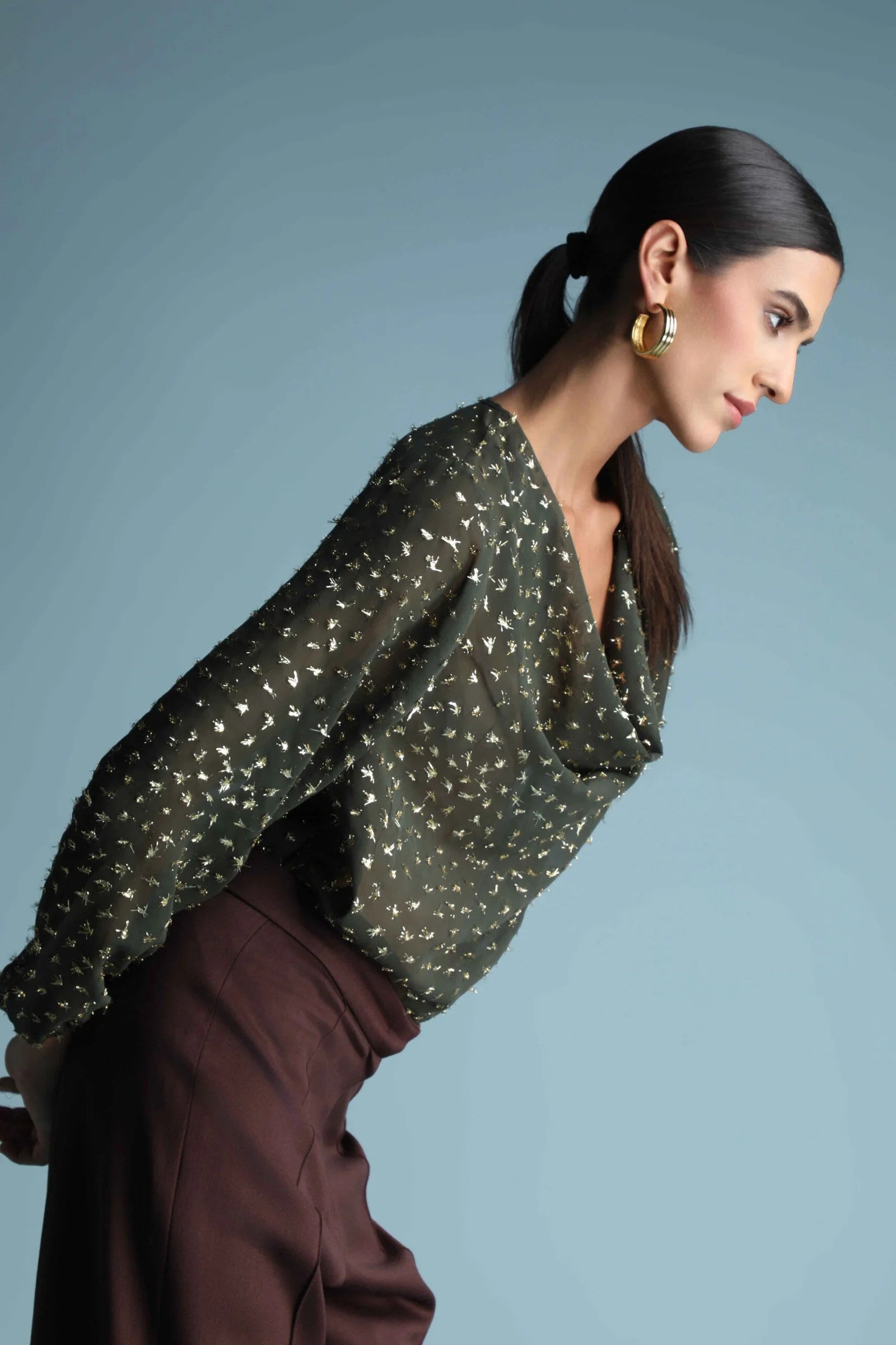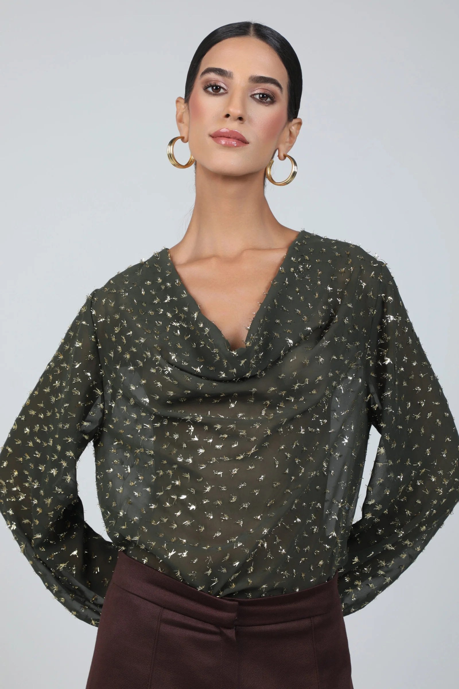 A draped sheer top crafted from lightweight chiffon, delicately embroidered with scattered metallic accents. Designed with a soft cowl neckline and relaxed long sleeves, it offers an elegant, effortless silhouette that pairs beautifully with tailored trousers or evening skirts.