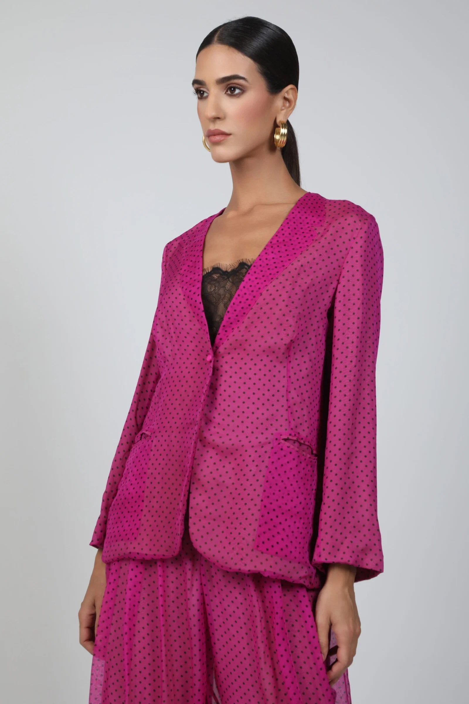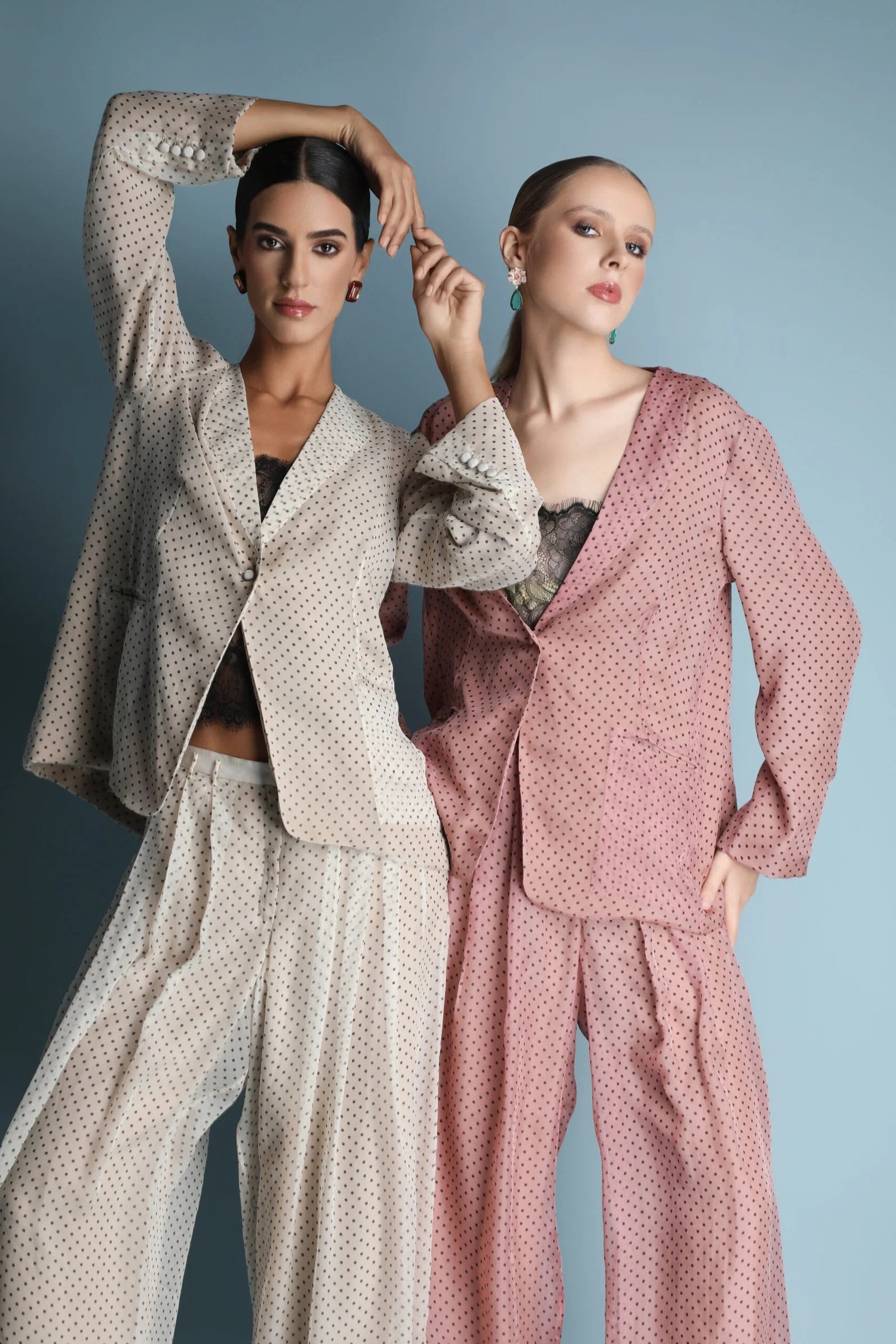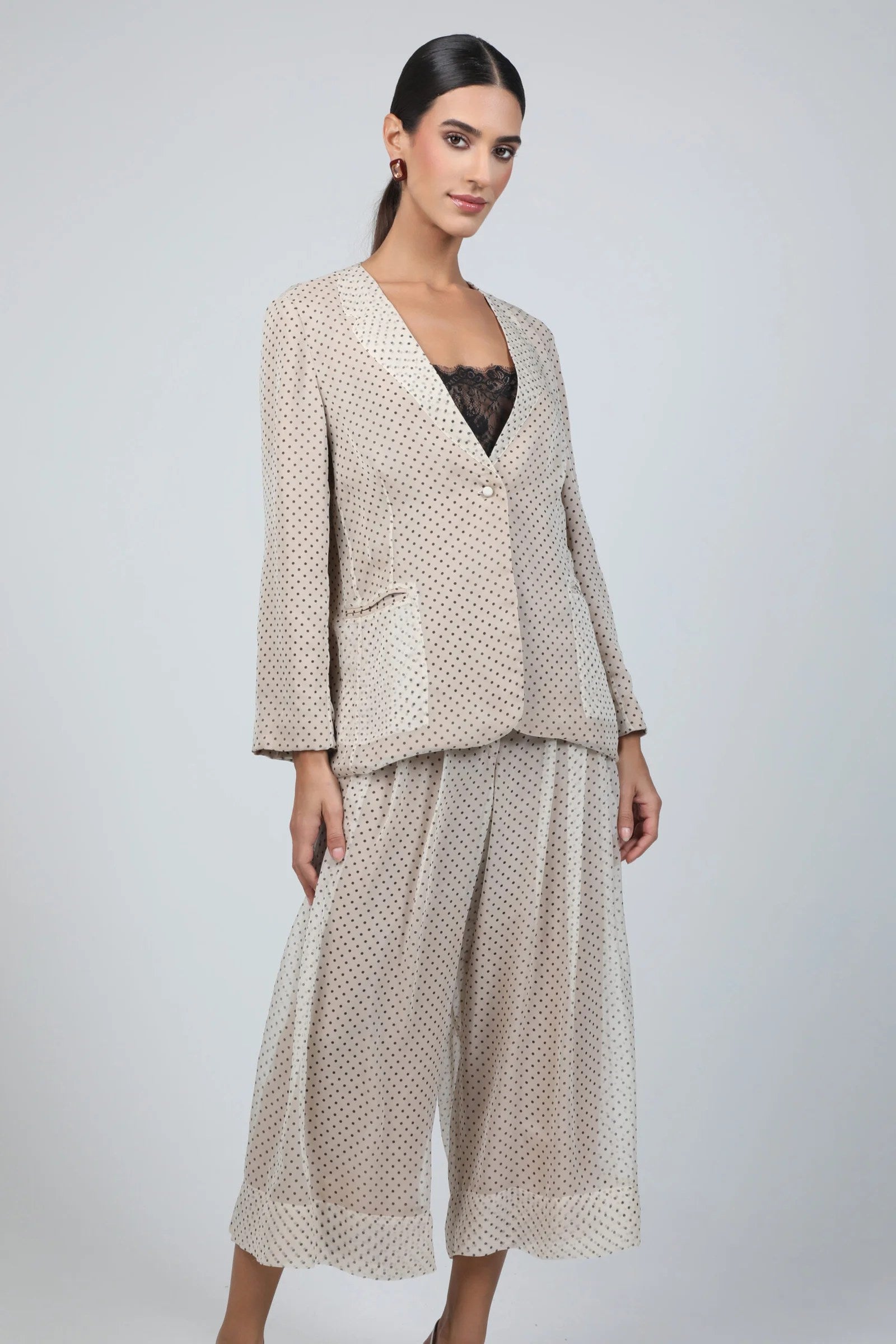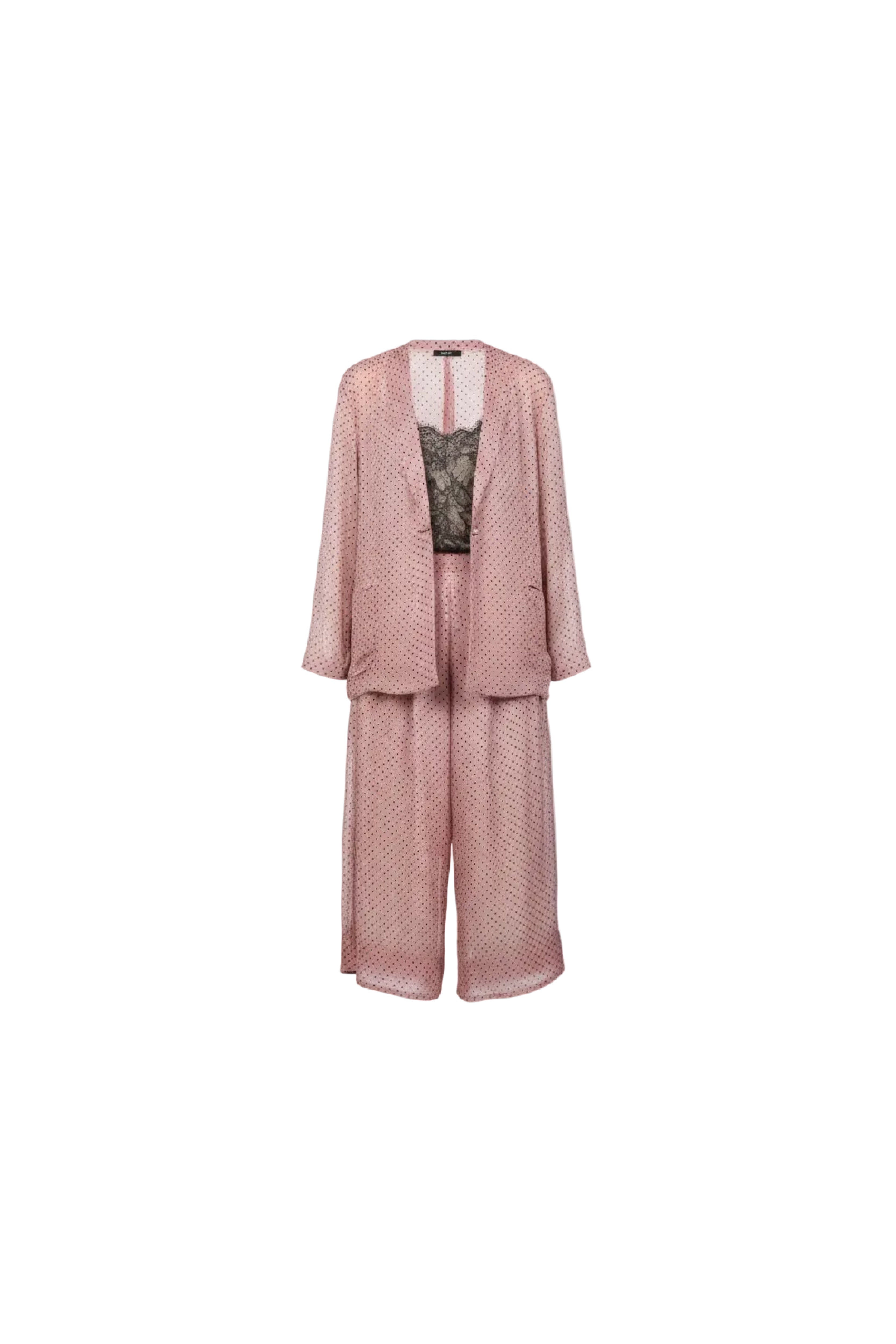 An elegant mousseline two-piece set featuring a fluid, dotted pattern that brings lightness and movement to every gesture. The relaxed tailored jacket with soft shoulders and covered buttons pairs seamlessly with wide, flowing trousers for effortless sophistication. Available in soft beige, dusty rose, and vibrant fuchsia, this set captures a refined femininity—delicate, modern, and timelessly chic.