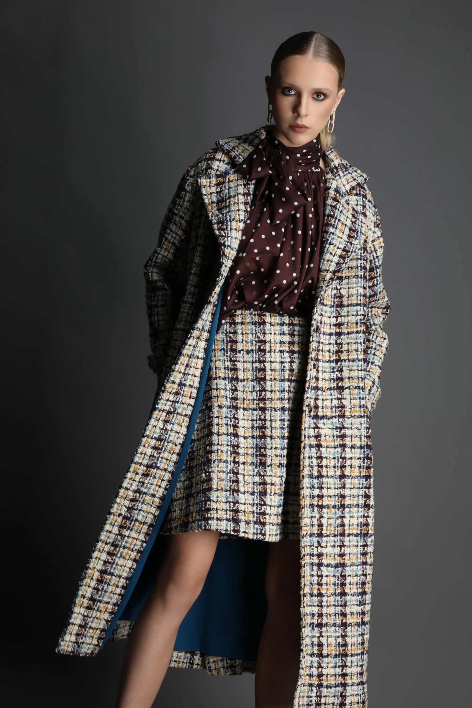 A refined long tweed coat featuring a rich, textured weave in neutral and warm tones. The silhouette is structured yet elegant, opening to reveal a striking petrol-blue satin lining that adds depth, sophistication, and a subtle modern contrast.