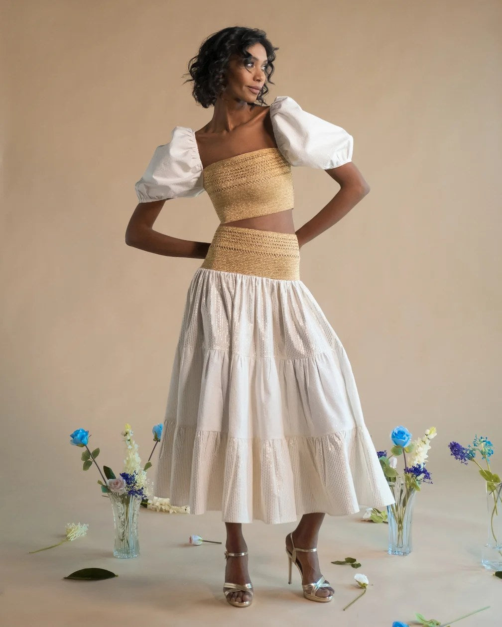 This set of top with puff Sleeves Skirts with fake ruffles fit design to be fitted at the bust and waist for a modern look.