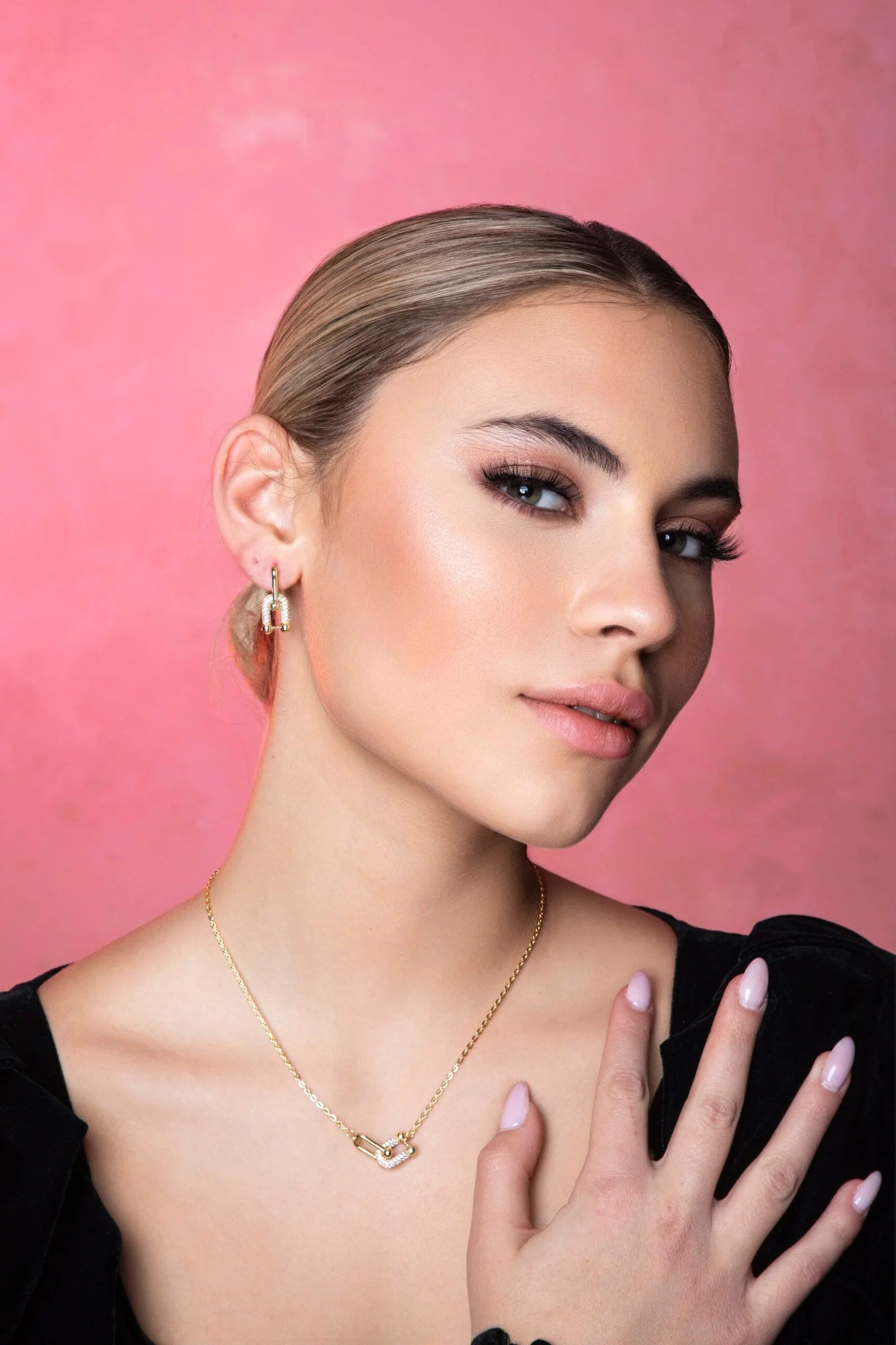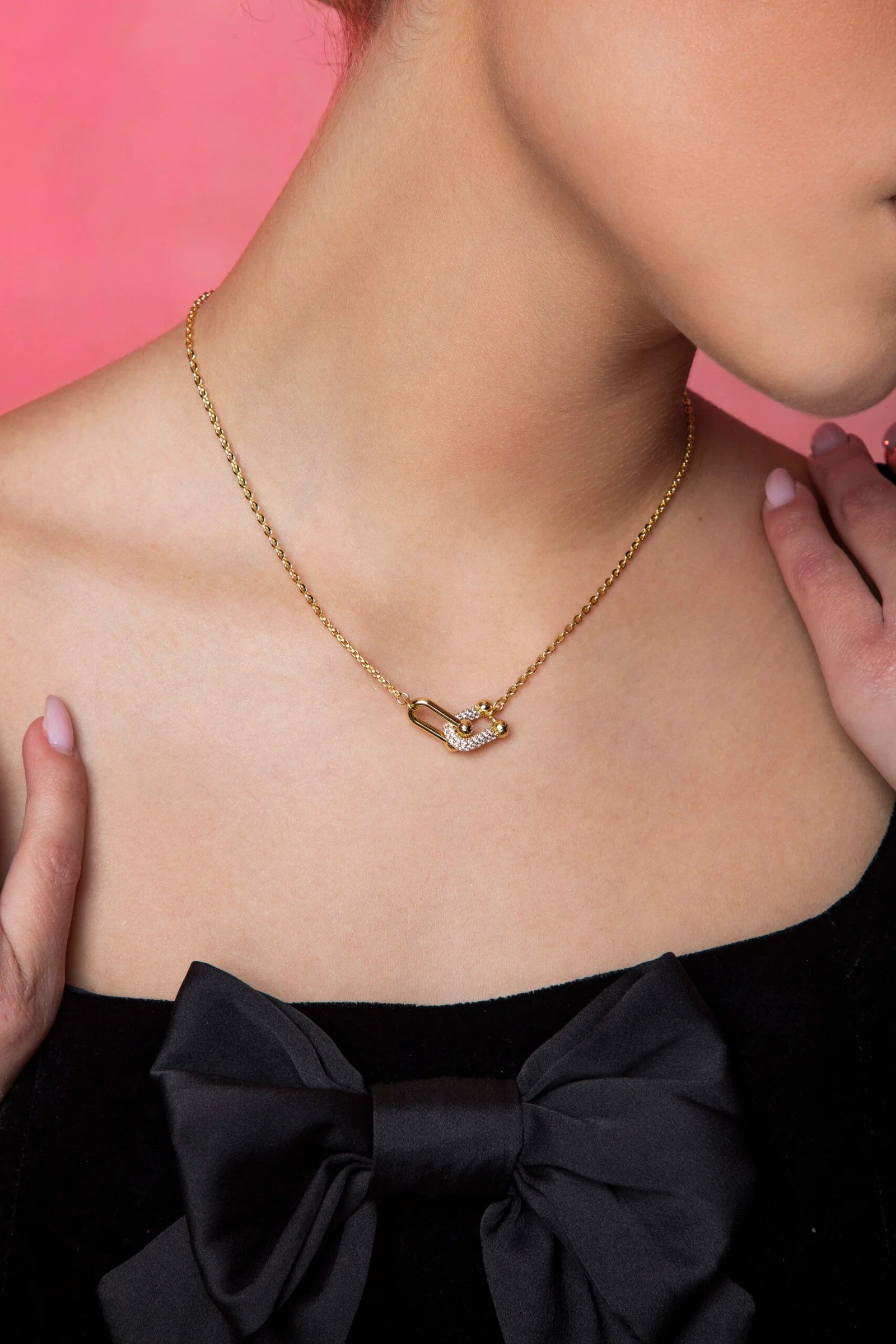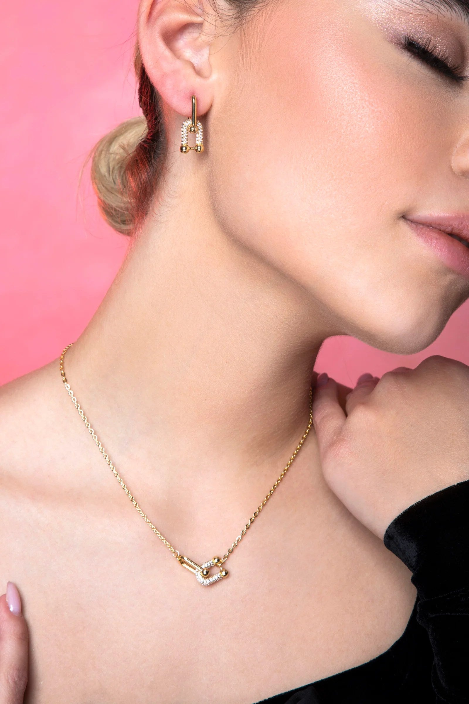 This elegant set features a delicate balance of sparkle and modern form. The necklace is designed with a fine gold chain and a sleek, interlocked pendant—one smooth gold link paired with a pavé crystal-encrusted piece, creating subtle brilliance. The matching earrings mirror this aesthetic, with petite U-shaped hoops entirely adorned in crystals and finished with polished gold ends for a chic, contemporary look. Minimal yet luxurious, this set is perfect for everyday elegance or thoughtful gifting.