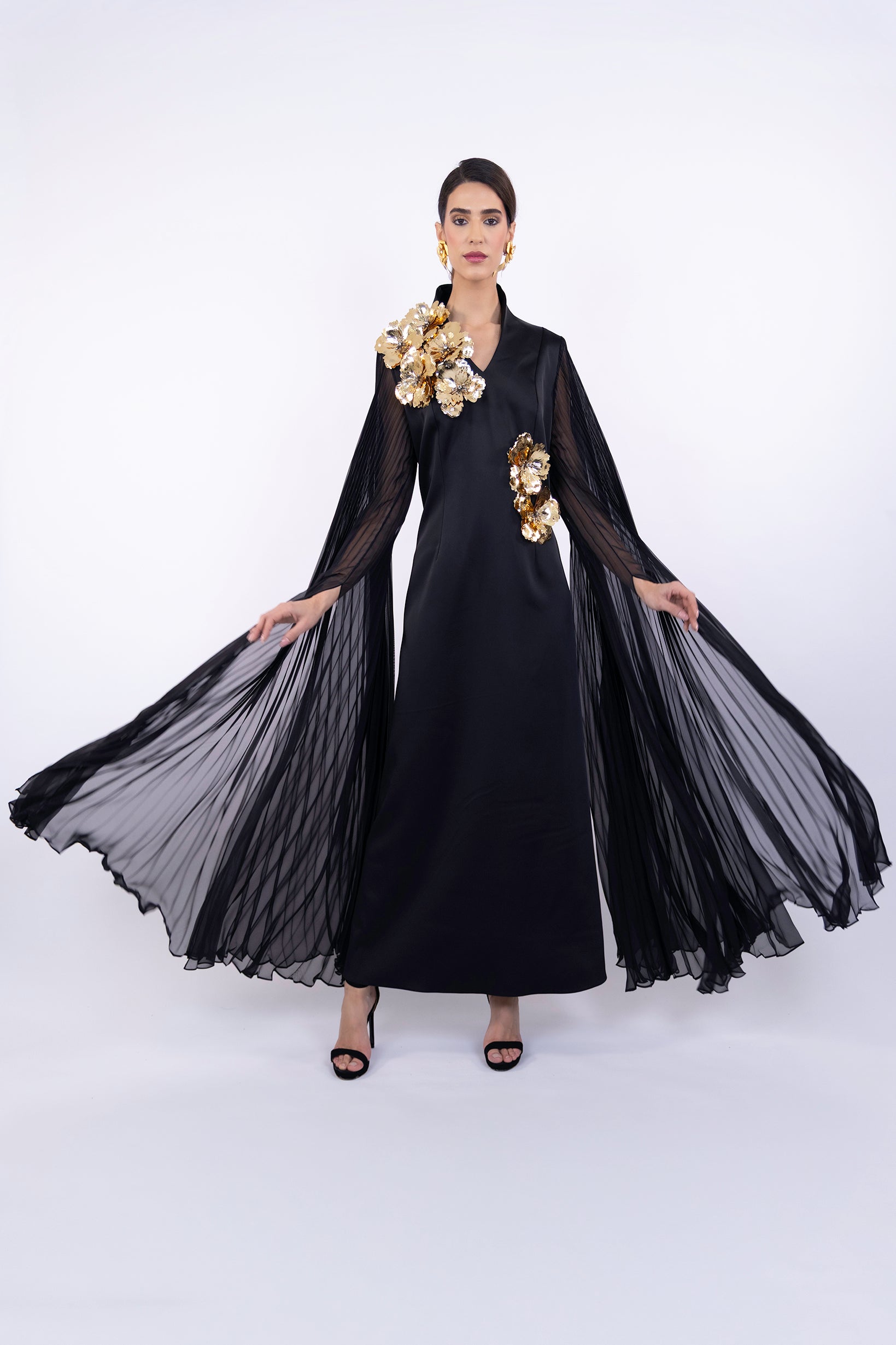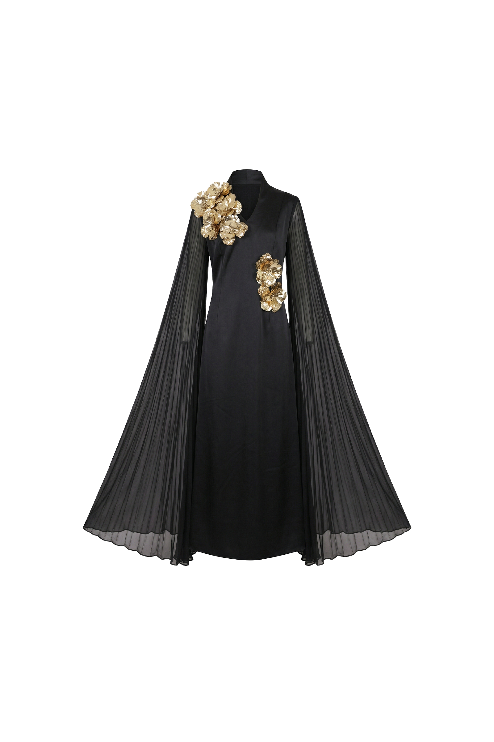 The body is crafted in smooth Razmir fabric, while dramatic mousselline pleissé sleeves cascade with airy movement, creating a striking contrast of structure and lightness. Handcrafted gold floral appliqués add a couture focal point, elevating the design into a bold statement of modern royalty.
