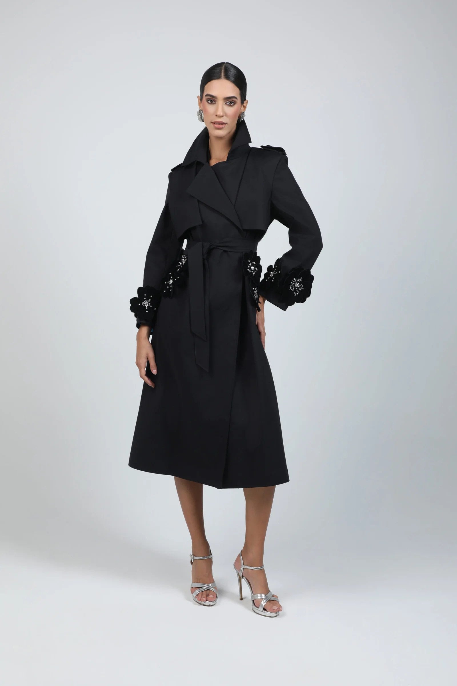 A tailored long trench coat crafted from luxurious black crepe, designed with a sculpted silhouette that moves fluidly with every step. The piece features an exaggerated collar, structured shoulders, and floral embellishments delicately hand-applied on the cuffs and hips, adding a touch of couture detailing. Its inner lining, in a vivid turquoise satin, offers a bold and modern contrast—revealed beautifully in motion for an unexpected flash of color and sophistication.