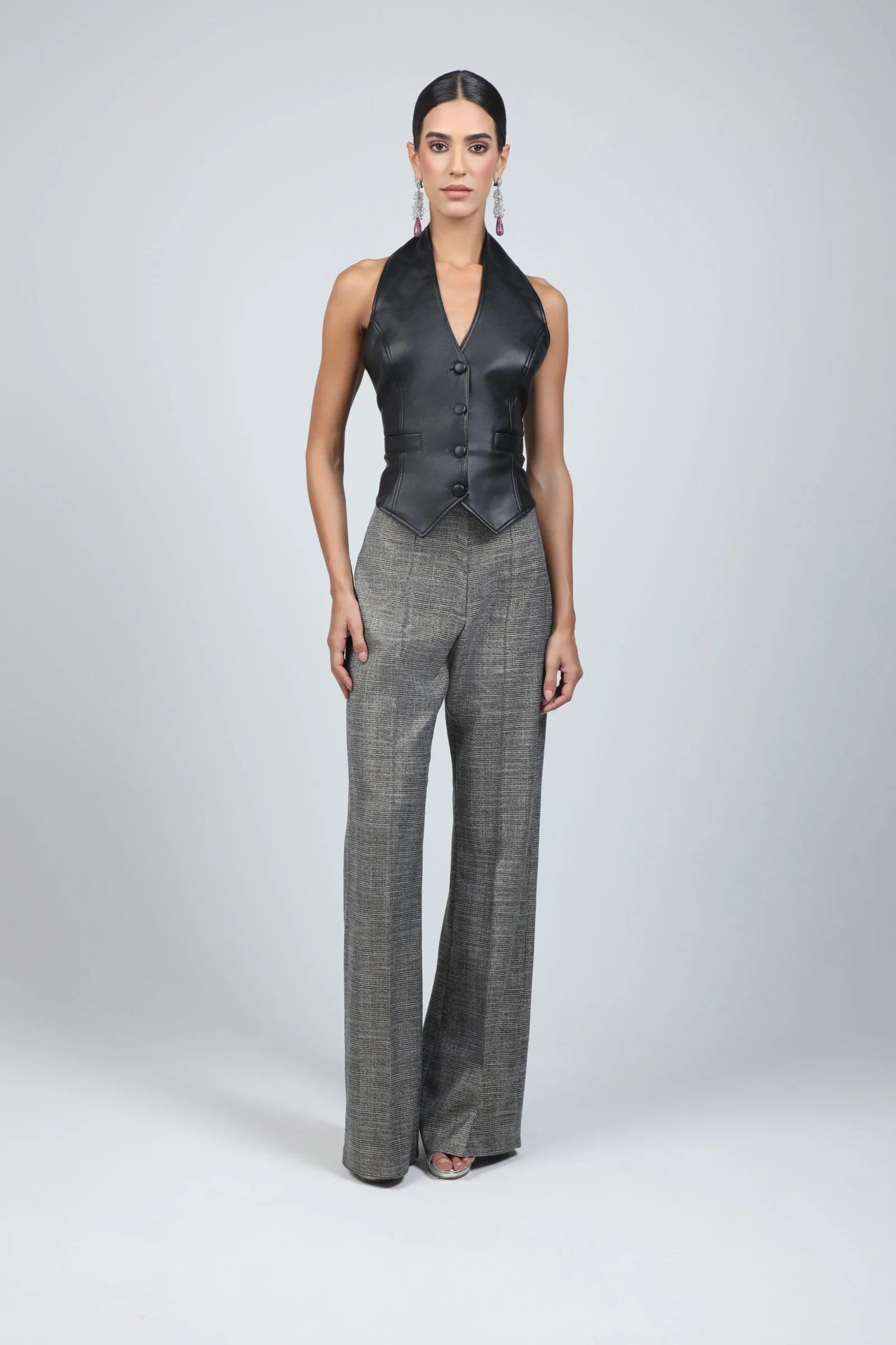 A sleek leather halter-neck vest designed with a sculpted fit that contours the body beautifully. The open half-back design adds a touch of bold sensuality, while covered buttons and fine tailoring emphasize refined craftsmanship. The sharp neckline and waist-defining cut merge modern edge with timeless allure—an empowering piece that exudes confidence and sophistication.