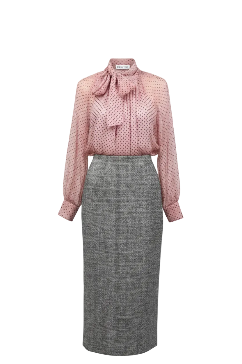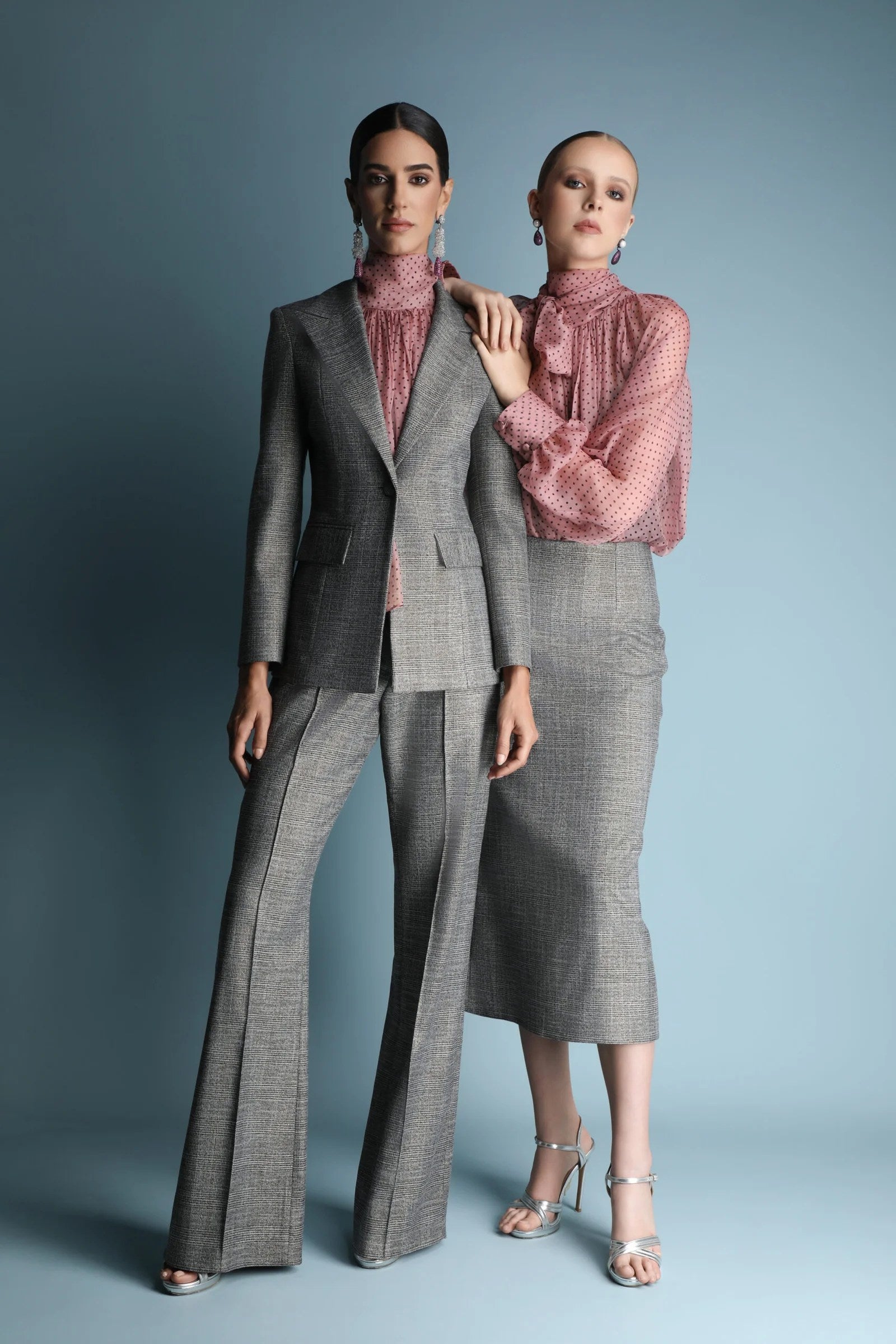 A refined high-waisted pencil skirt tailored from luxurious Joukh Cashmere fabric in a soft grey check pattern. The structured silhouette contours the body with clean precision, offering a flattering, elongating line. Sophisticated and versatile, it seamlessly transitions from daytime elegance to evening polish an essential wardrobe piece that embodies timeless tailoring and modern femininity.