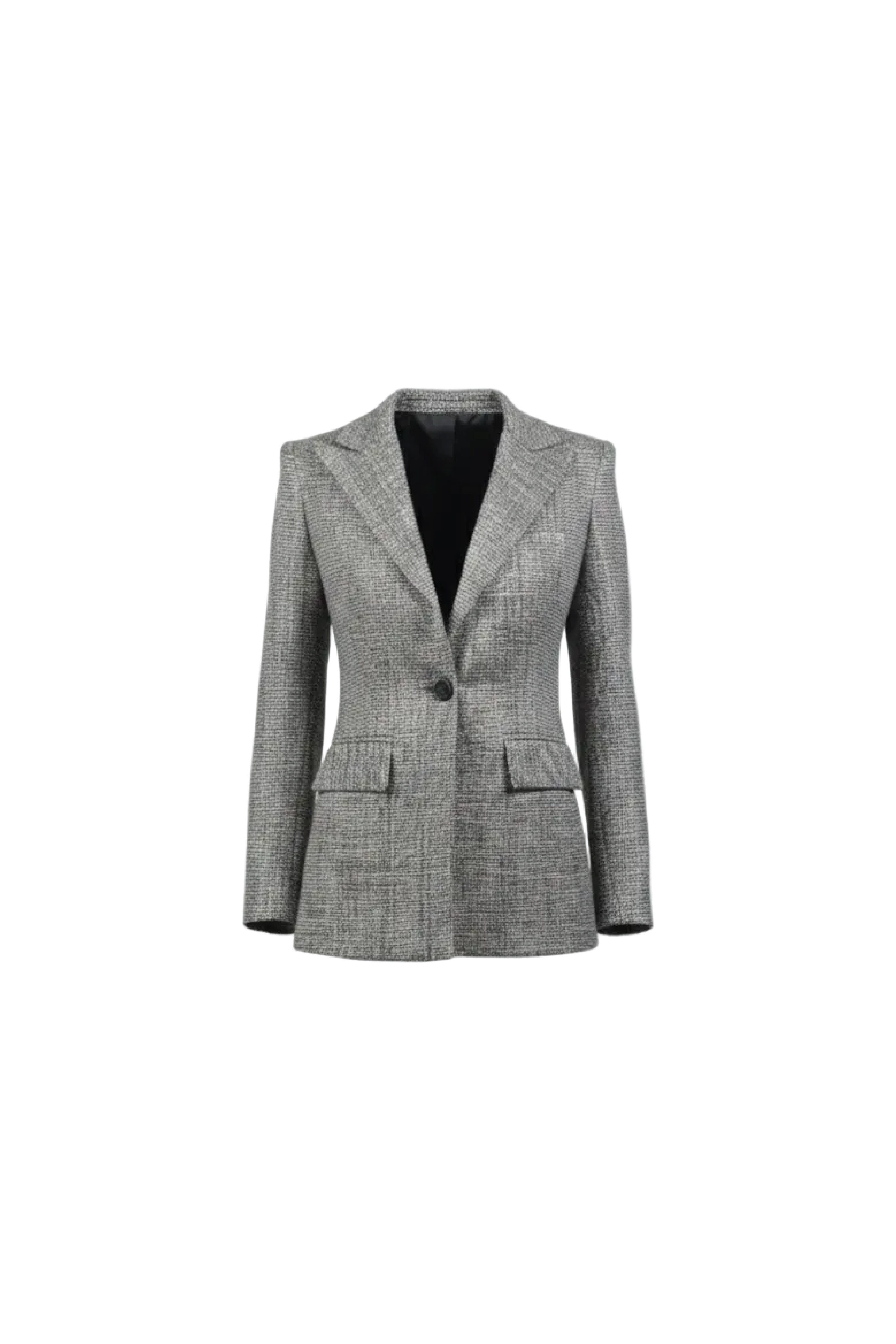 A structured blazer tailored in fine grey Joukh - Cashmere with a delicate check pattern. It features defined shoulders, a nipped-in waist, and peak lapels outlined in sleek satin for a touch of contrast. The single-breasted silhouette and precise darting create a sharp yet feminine shape, making it a timeless piece that merges classic tailoring with understated luxury.