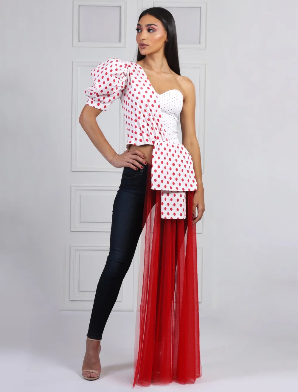 Embrace playful sophistication with our polka red dots top, featuring a captivating asymmetrical design. On one side, a sleeveless silhouette flows elegantly, adorned with a charming red tulle train. On the opposite side, a puffy sleeve adds vintage-inspired flair. This unique blend of modern and classic elements ensures a standout look for any occasion.