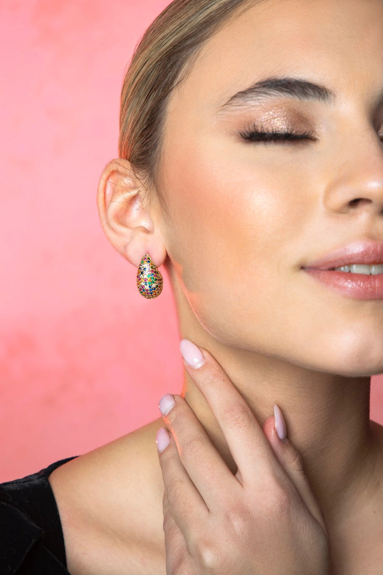This drop-shaped earring is fully encrusted with multicolored crystals, creating a sparkling, joyful effect. Its compact size and vibrant palette make it a playful yet elegant piece that catches the light with every movement — perfect for adding a pop of color to any look.