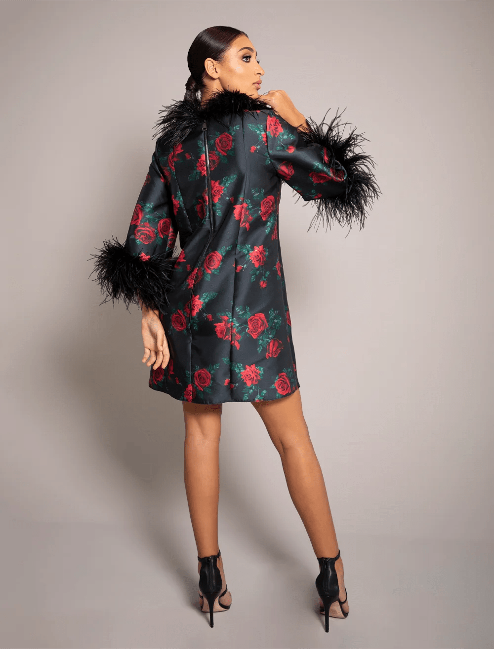 Superimposed into silk faille with real ostrich feathers.