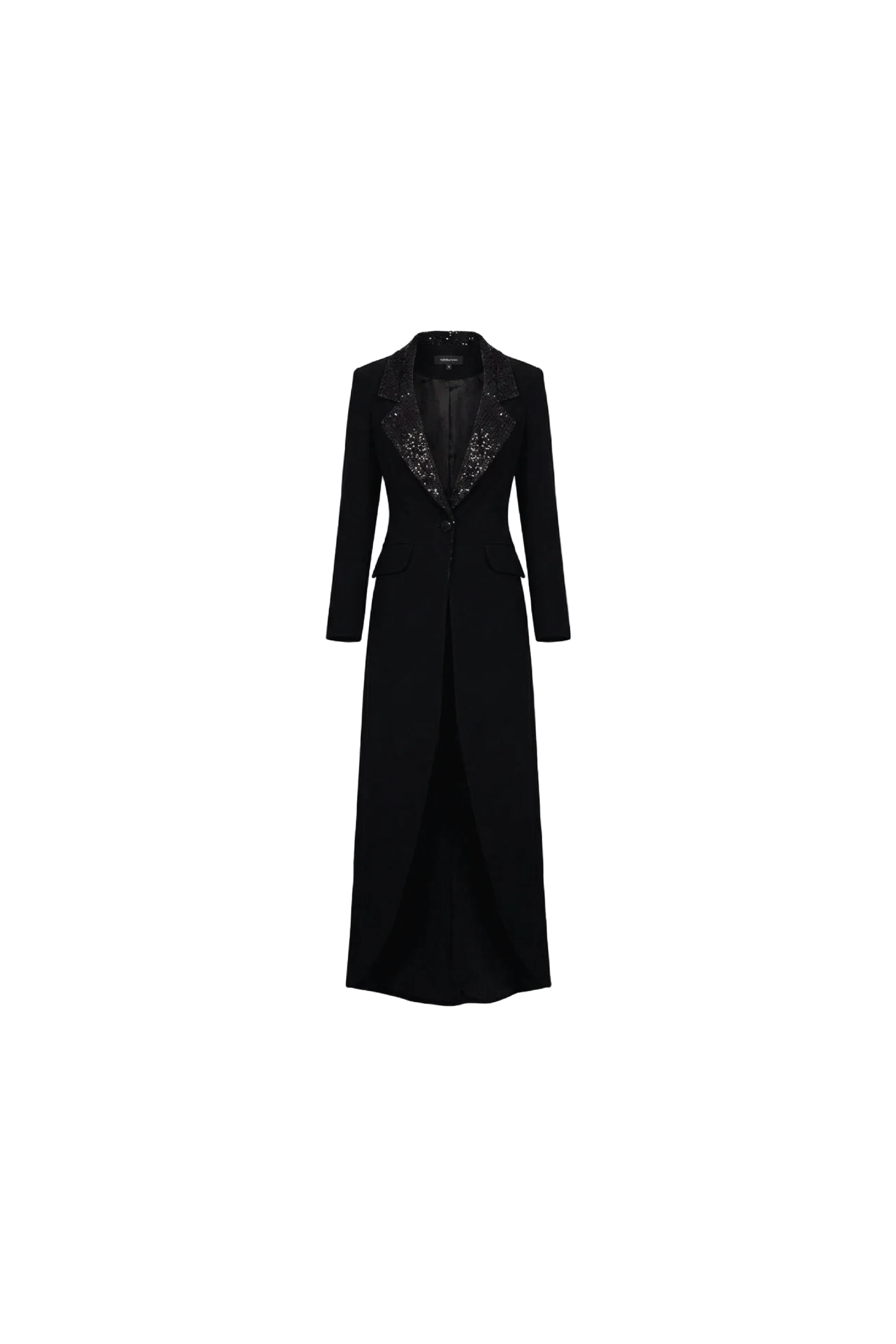 This Classic silhouette with chic modern details and handmade sequins beads Crafted from luxurious garment, this design can be worn as jacket and tuxedo with pant.
