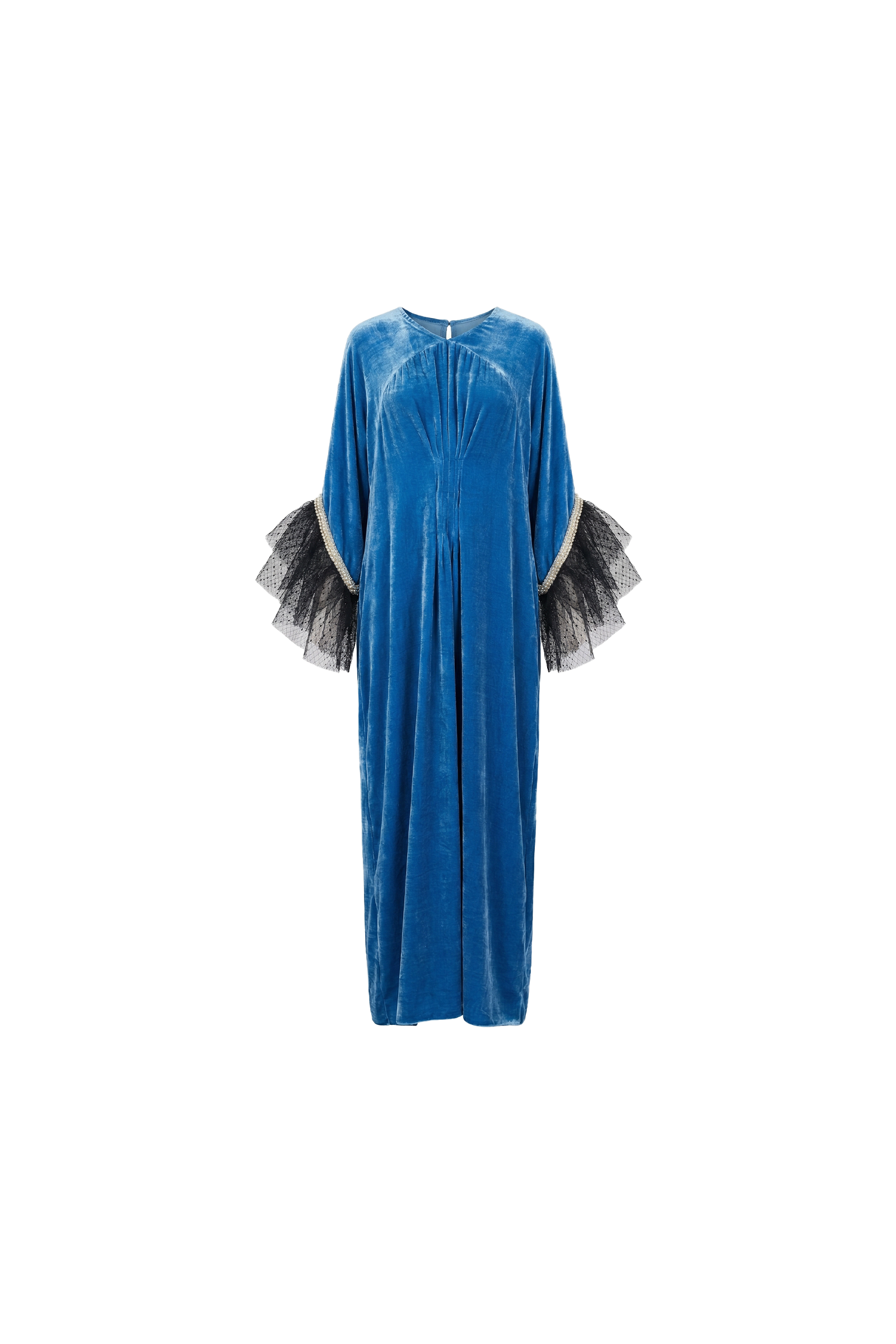 A fluid velvet kaftan in radiant ocean blue, sculpted with soft pleating along the front to elongate the silhouette. The relaxed cut flows effortlessly, while the round neckline keeps it refined and modern.