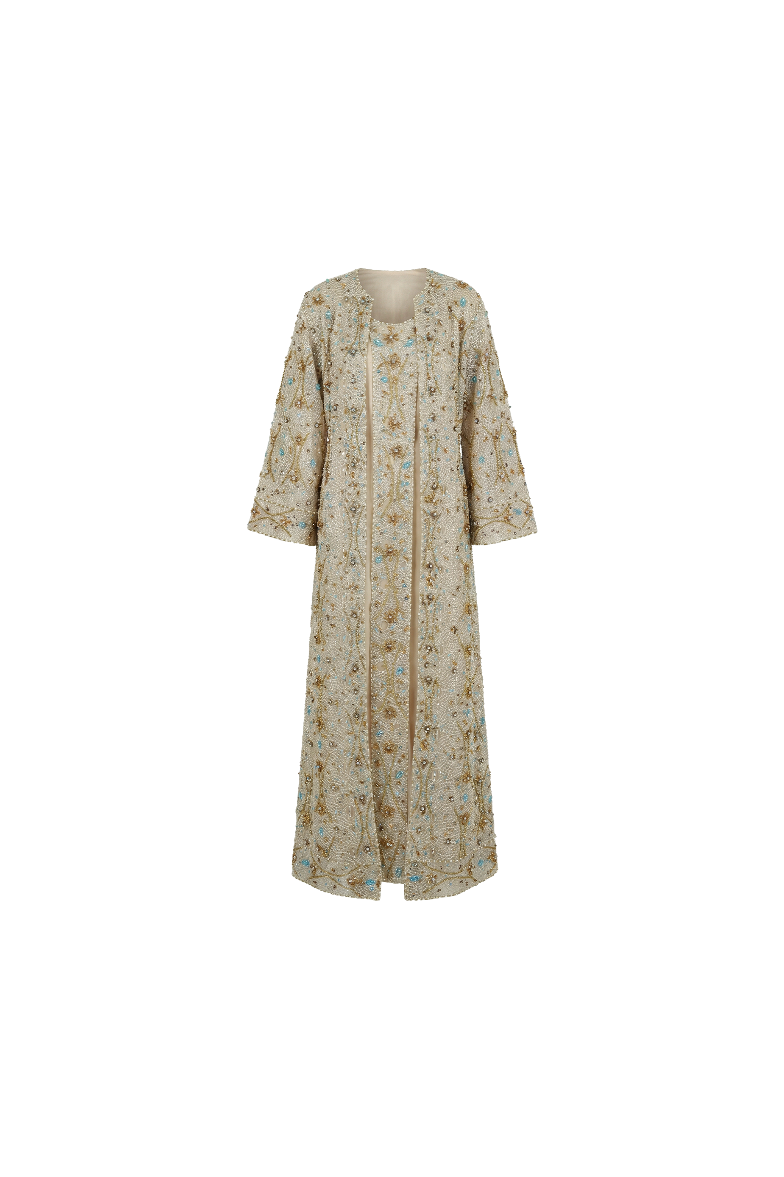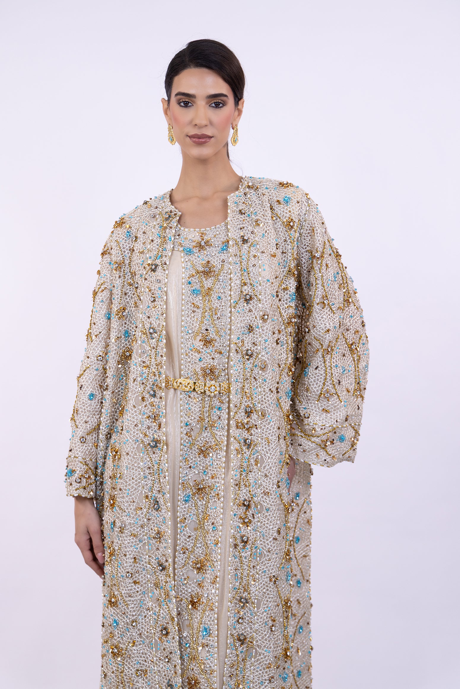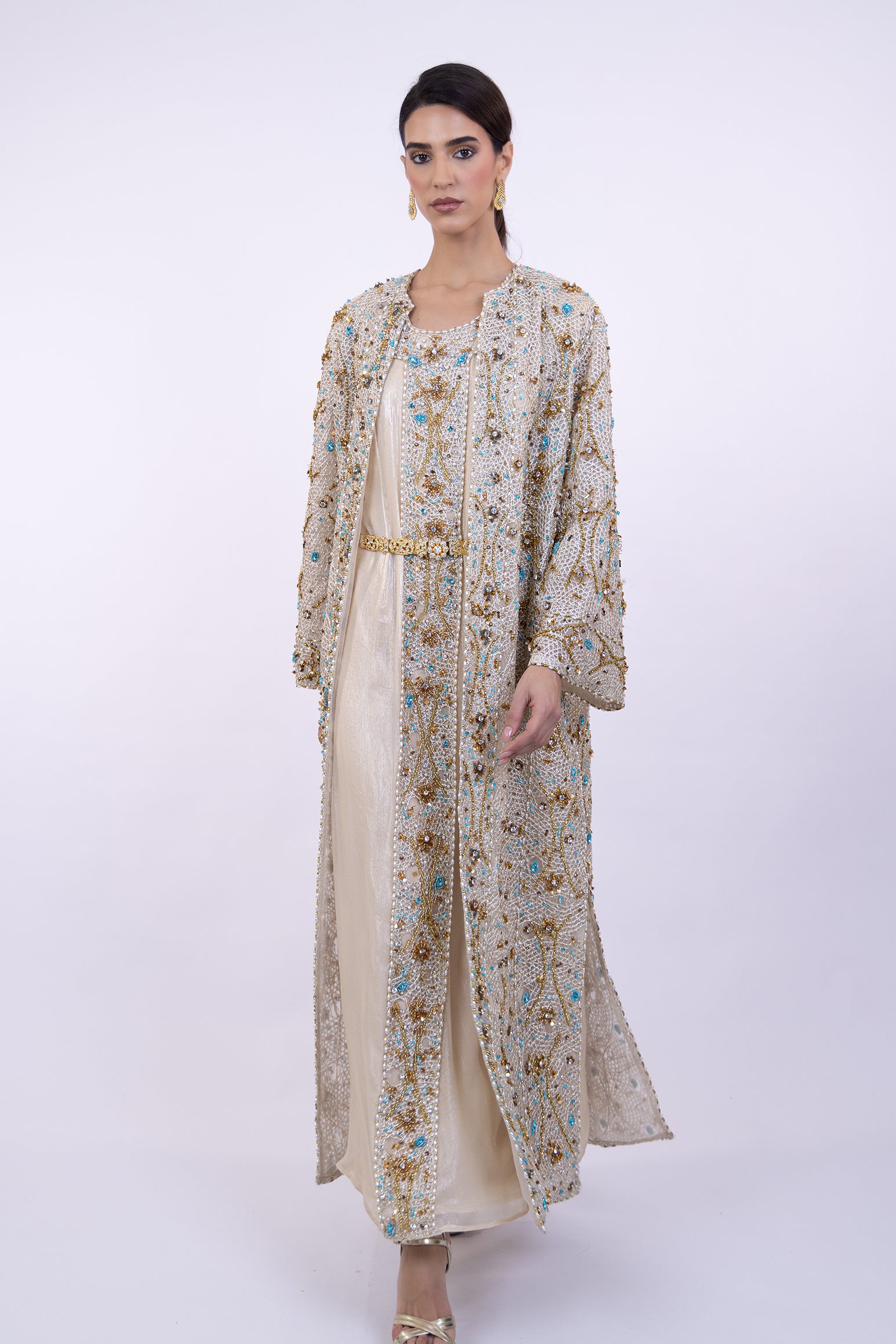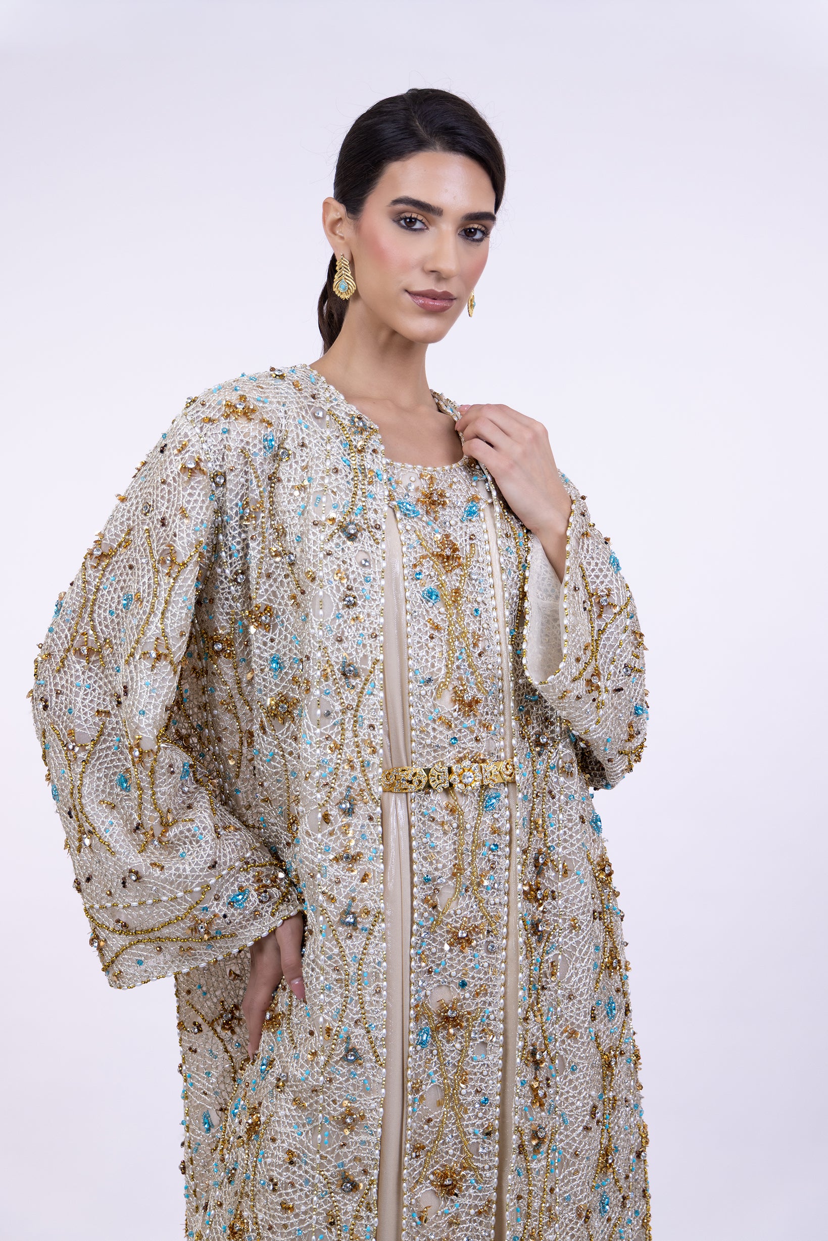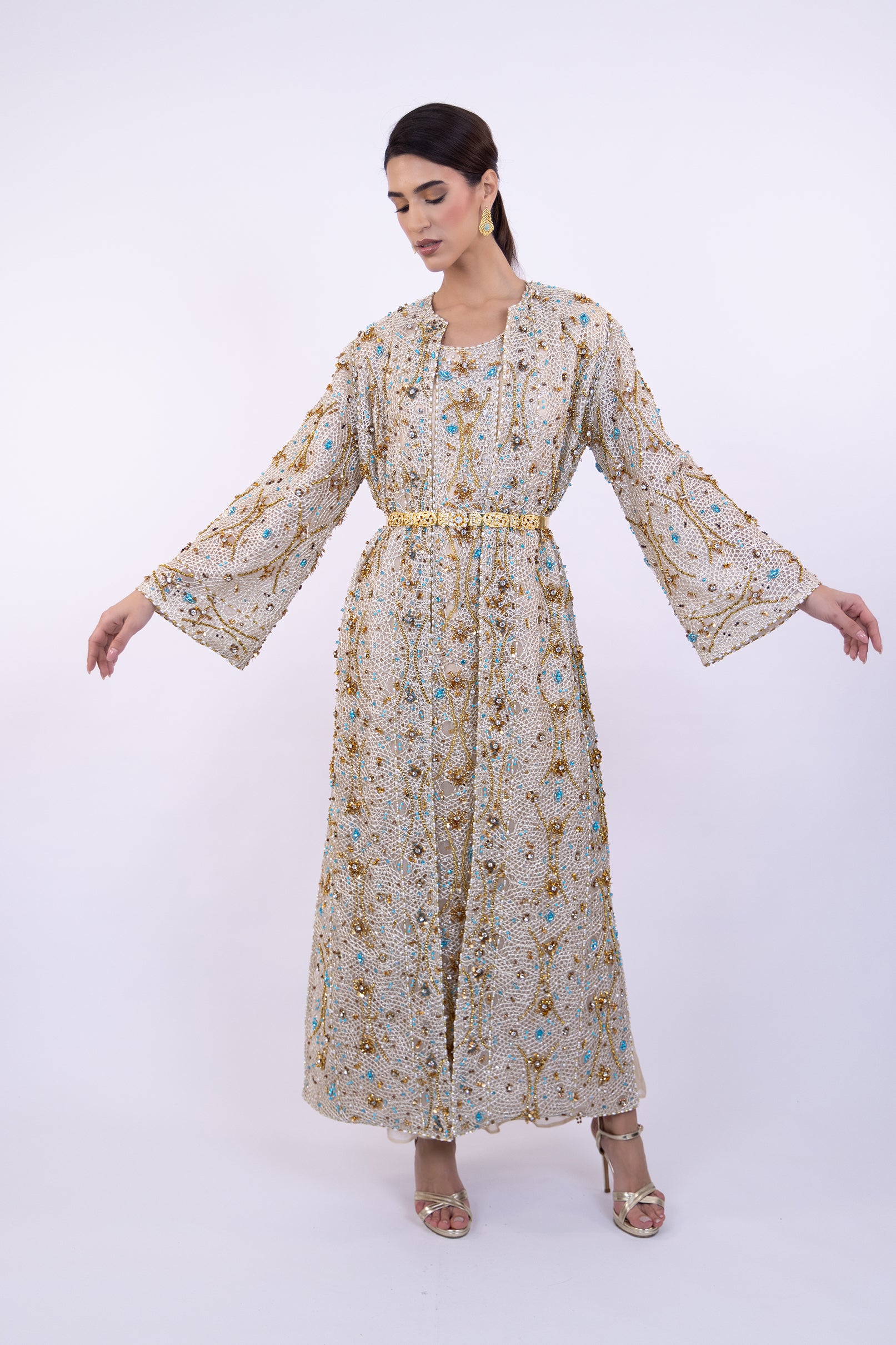 A radiant couture abaya crafted from hand-embroidered net, delicately woven with gold threads, luminous crystals, pearls, and striking turquoise accents.