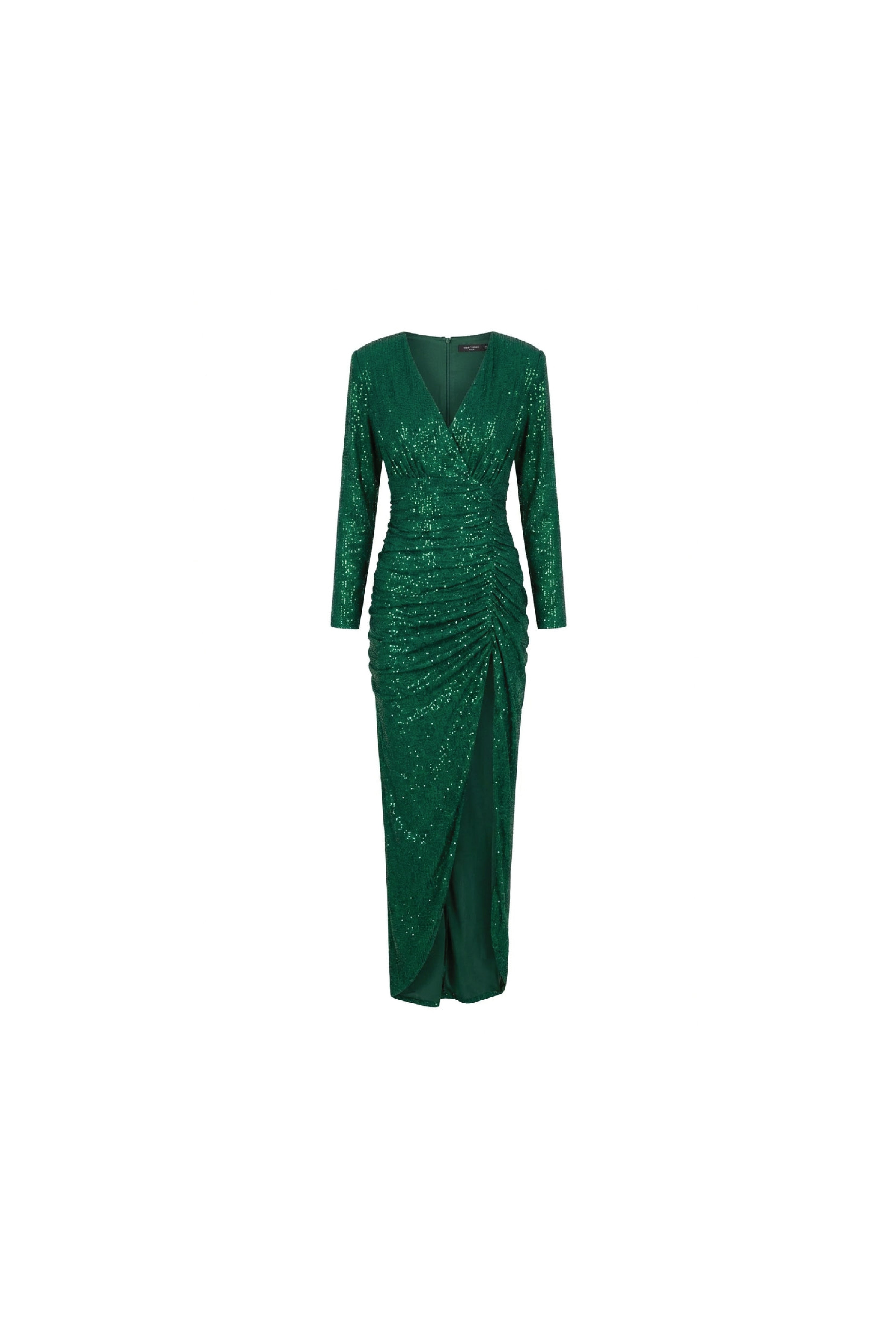 This Long Green Swarovski dress with a V-neck and bodycon silhouette features a front drape detail with a slit for maximum impact. show off yours with heels for a chic cocktail look.