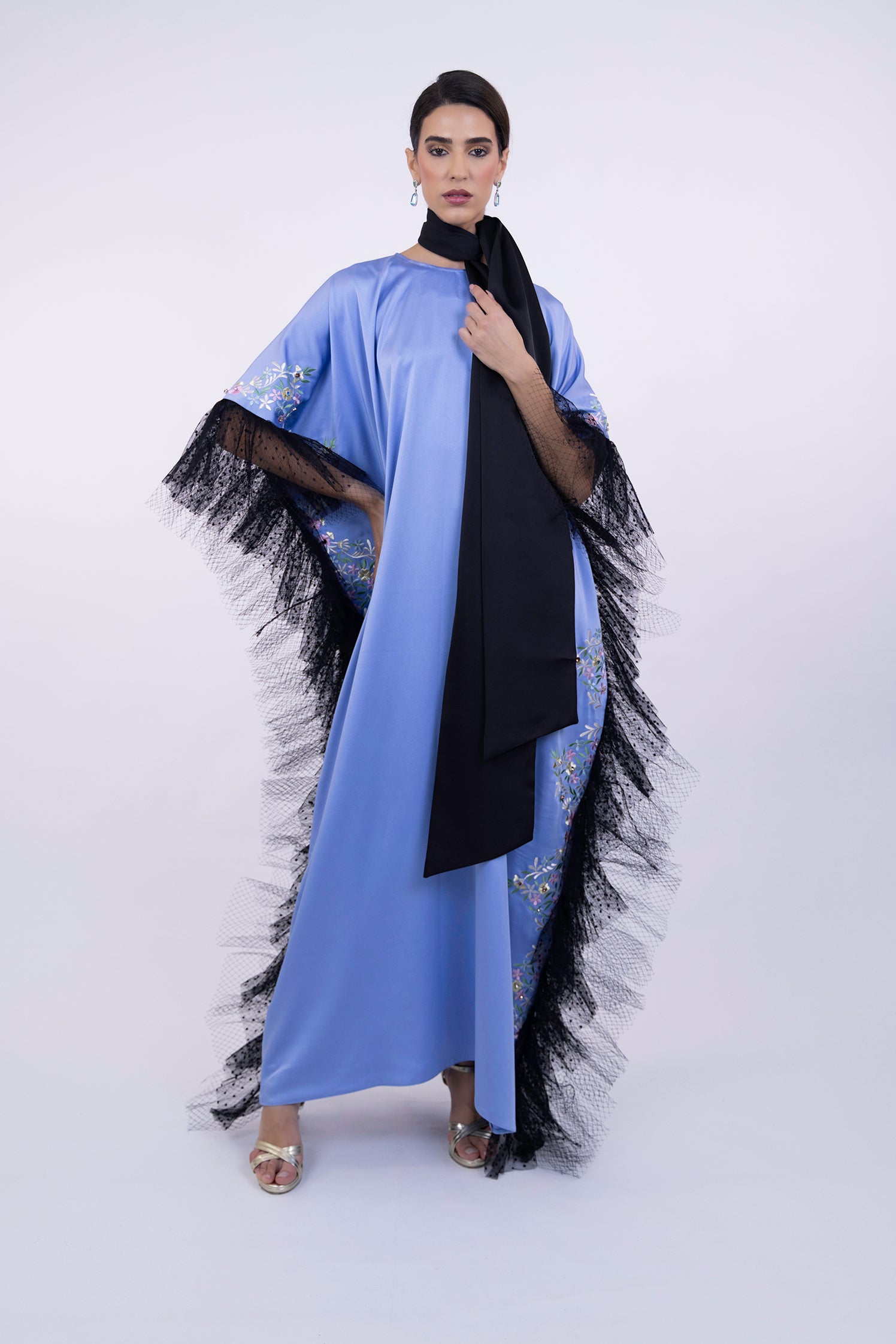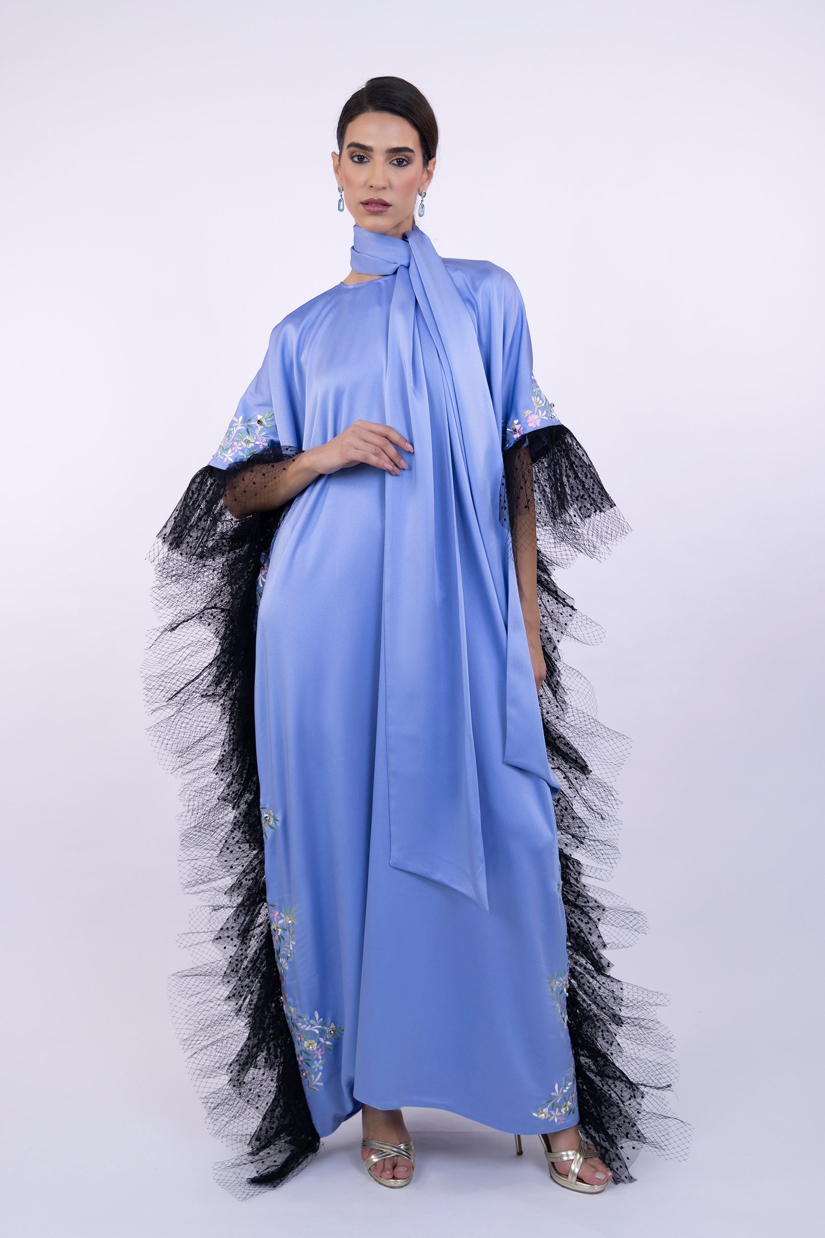 A fluid satin abaya designed with a soft, luminous drape that moves effortlessly with the body.