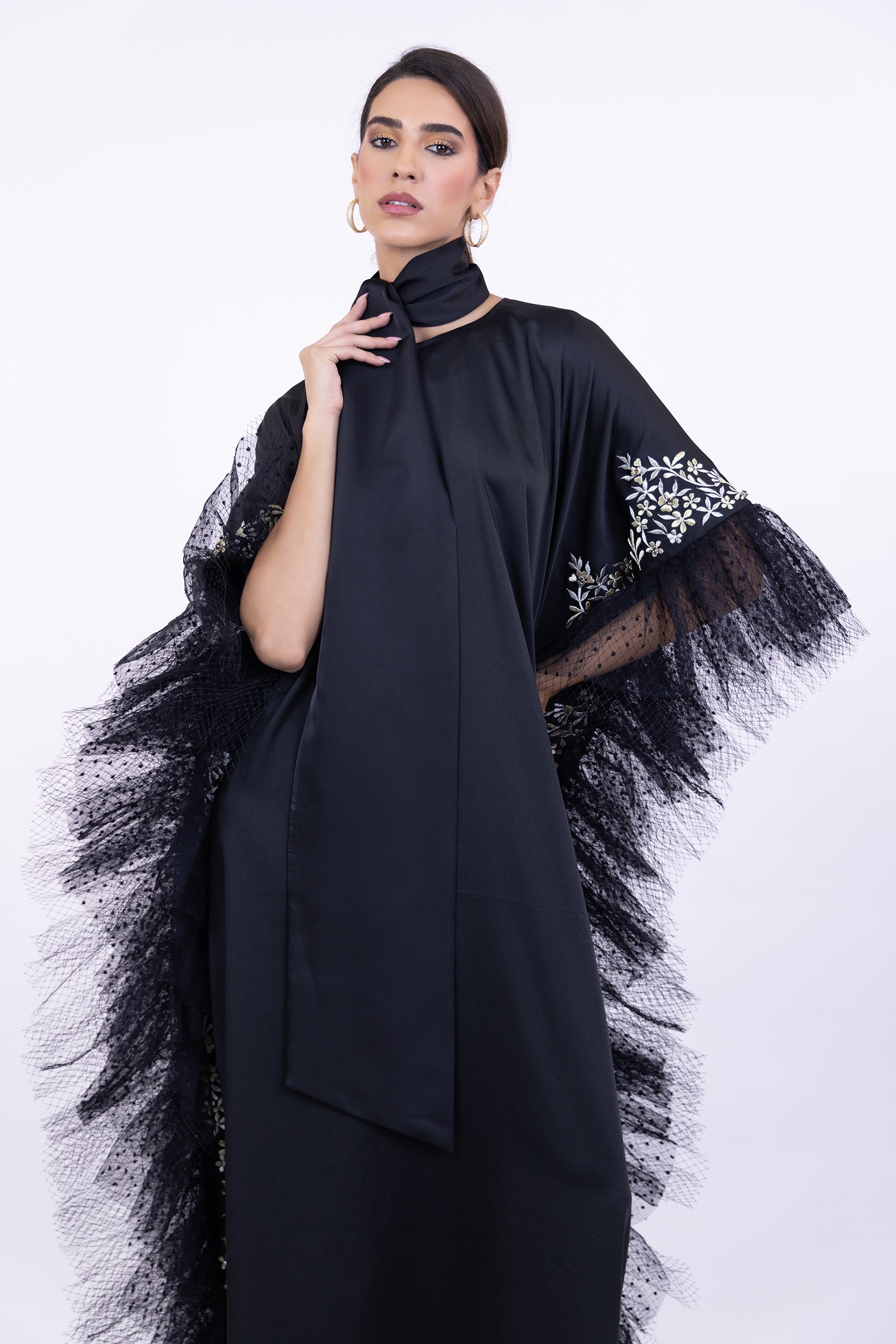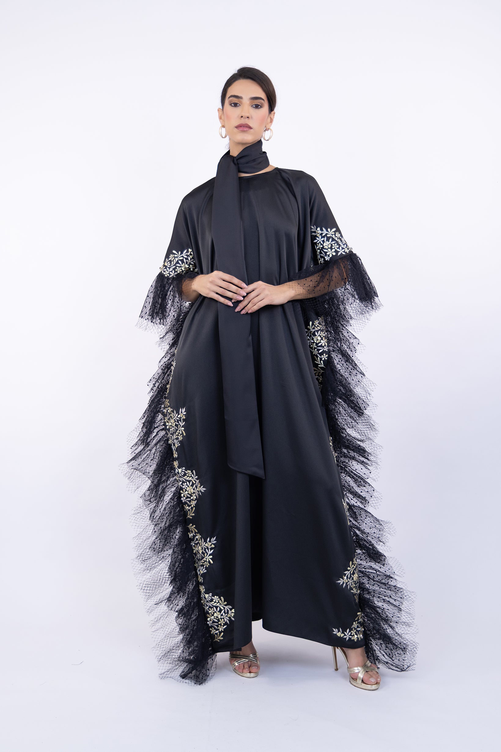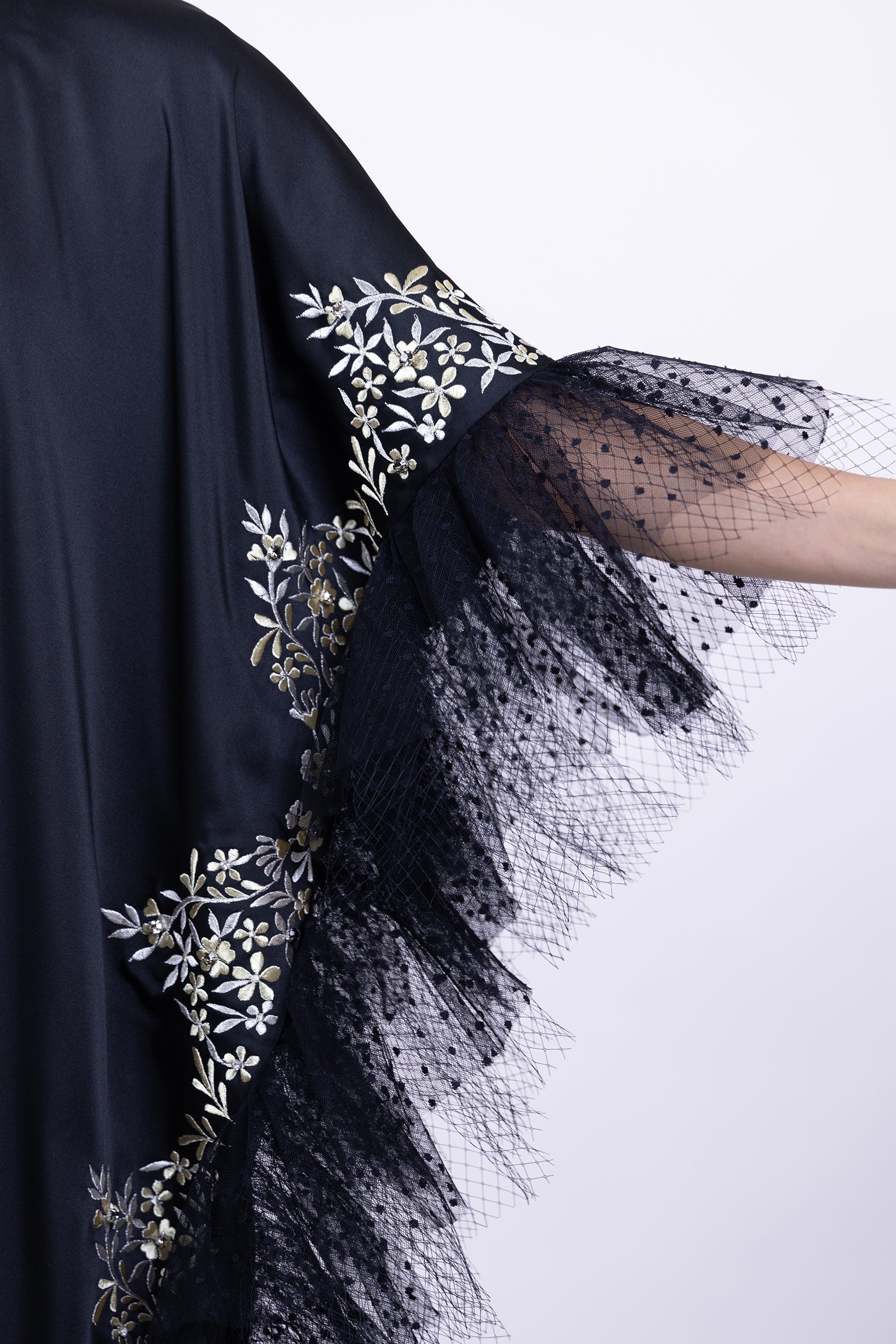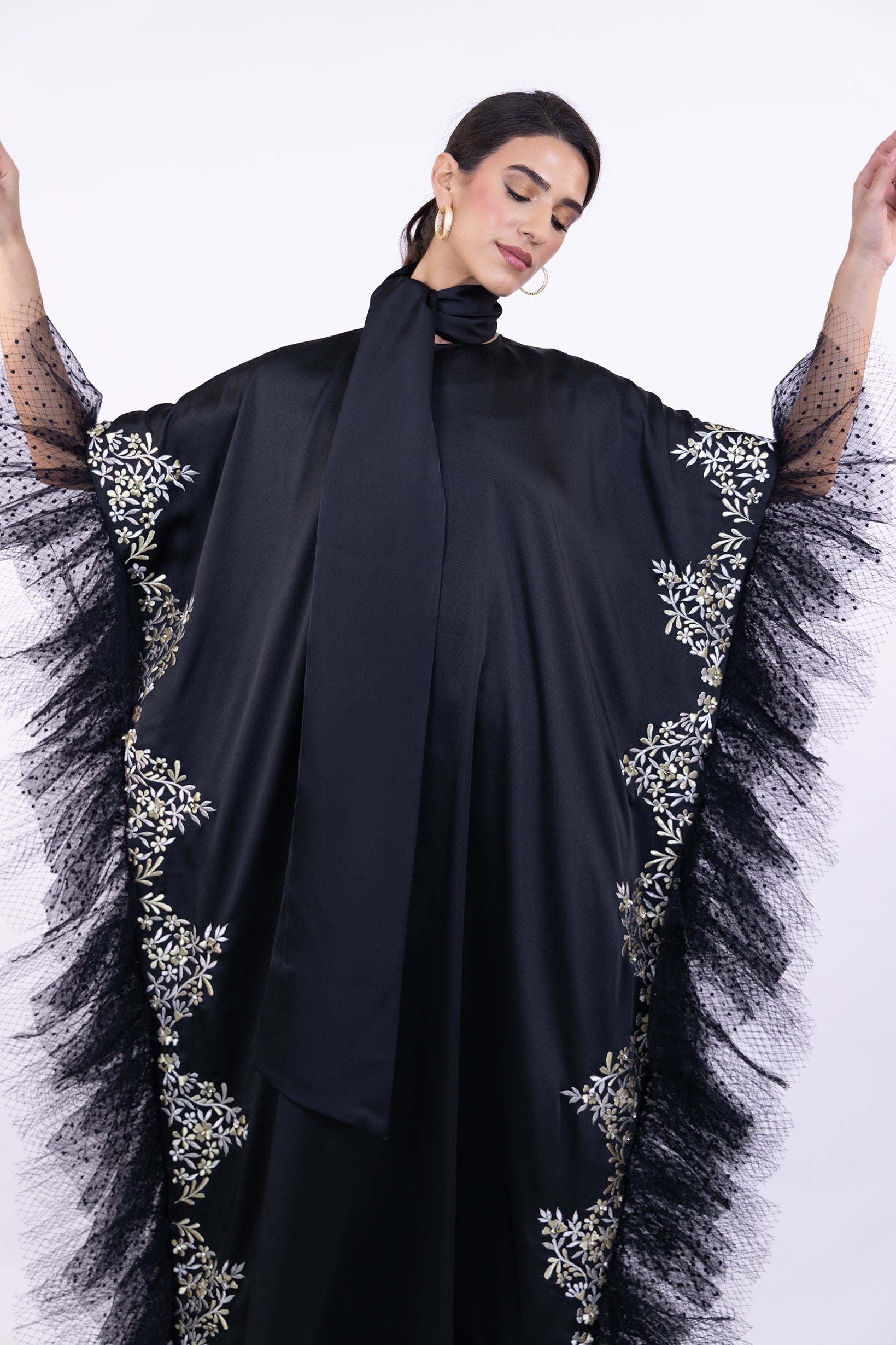 Each piece is elevated with delicate floral embroidery along the sides and sleeves, contrasted by dramatic black tulle ruffle panels that add texture, depth, and couture movement. Finished with a statement satin bow detail at the neckline, this design blends femininity with bold sophistication.