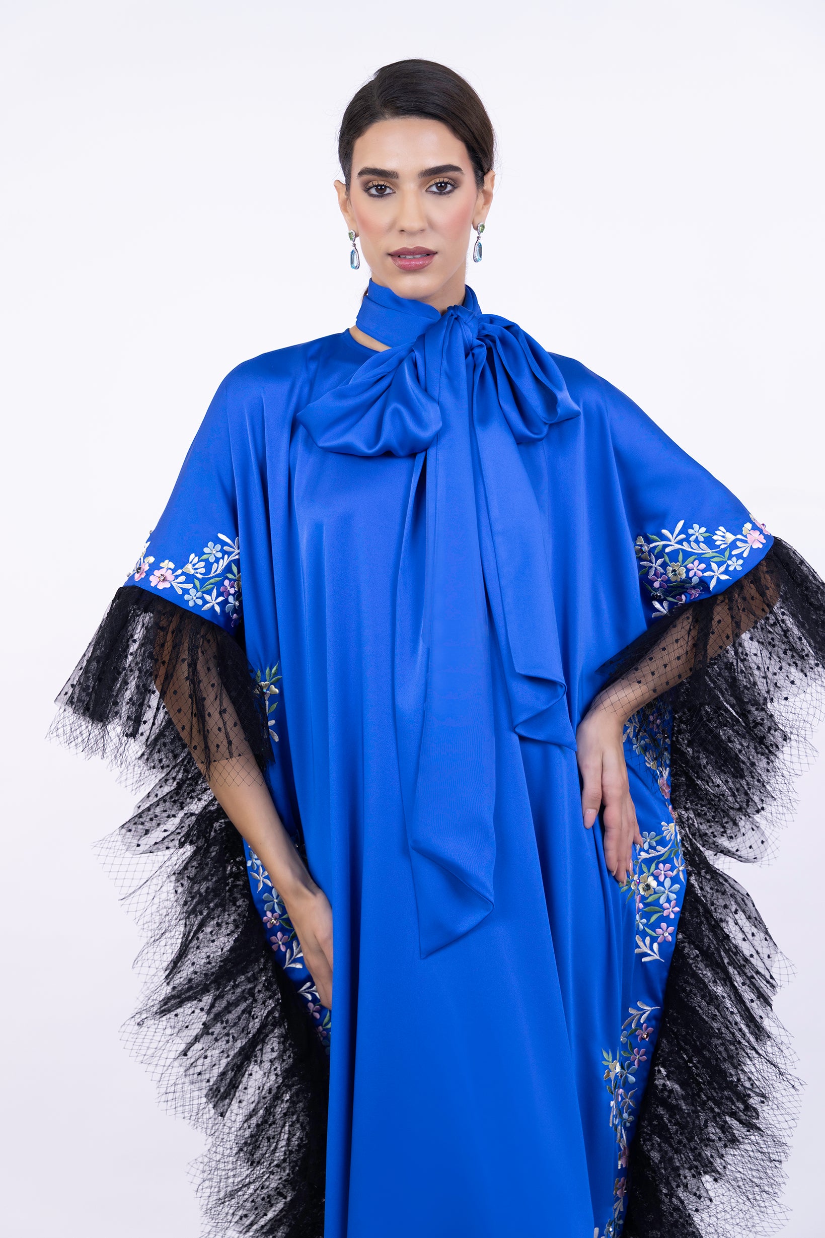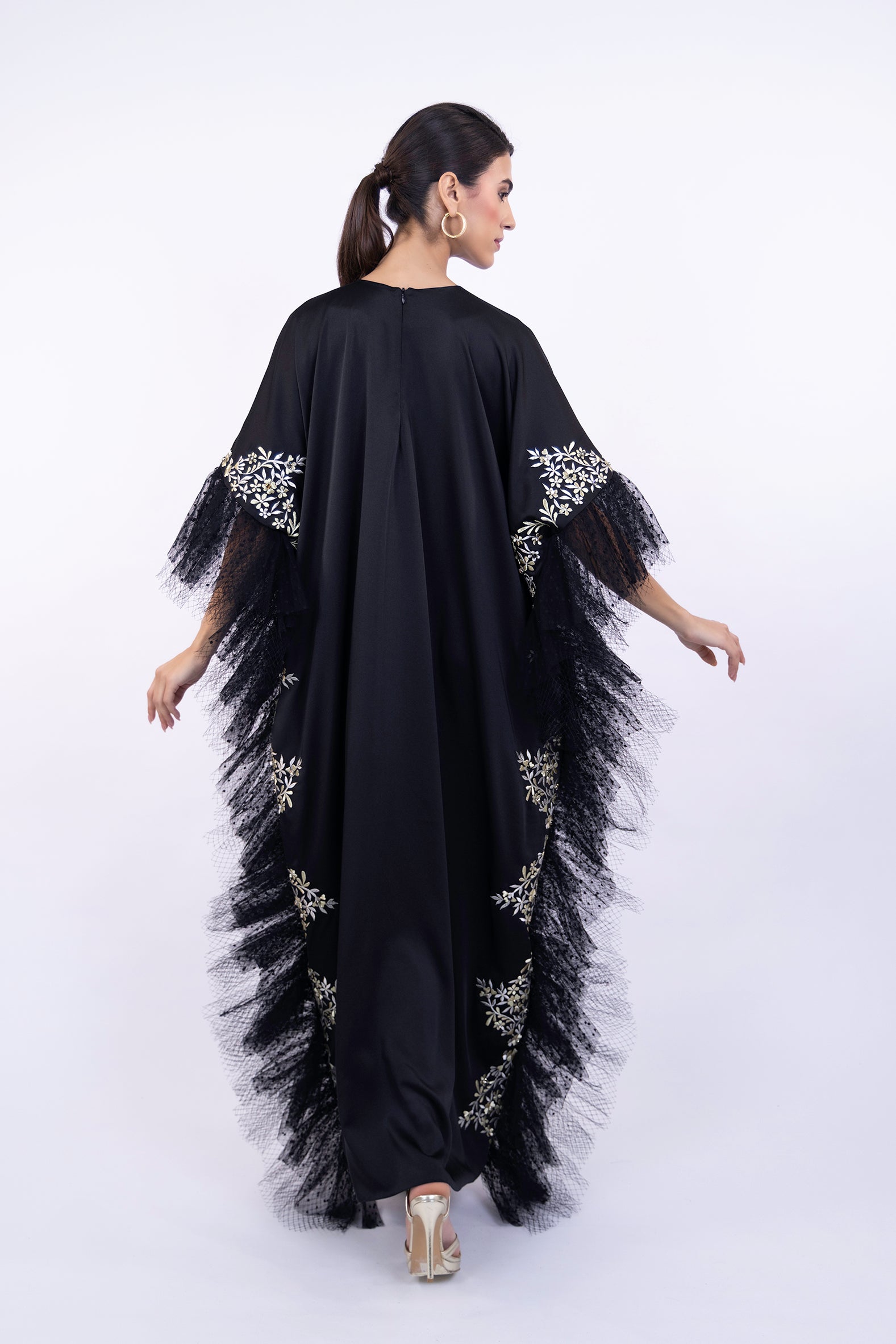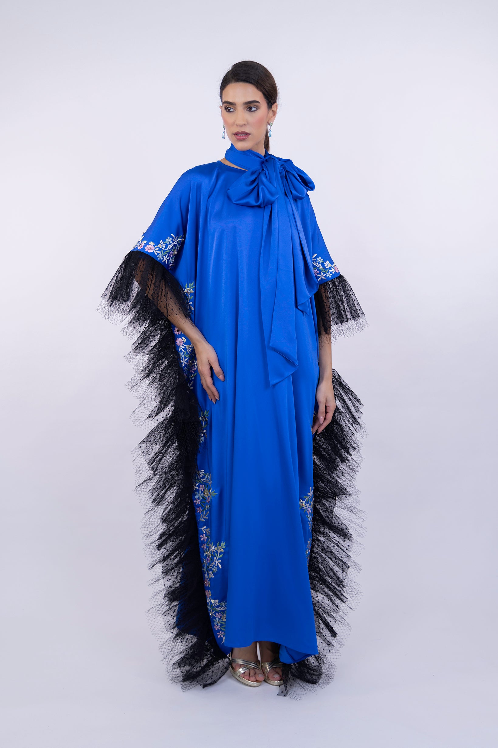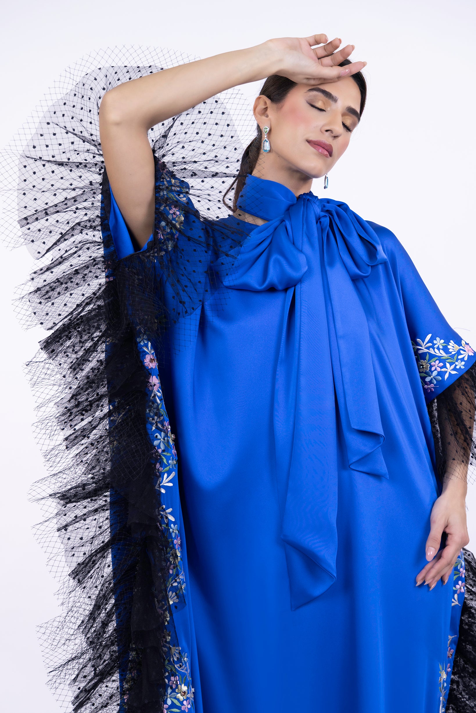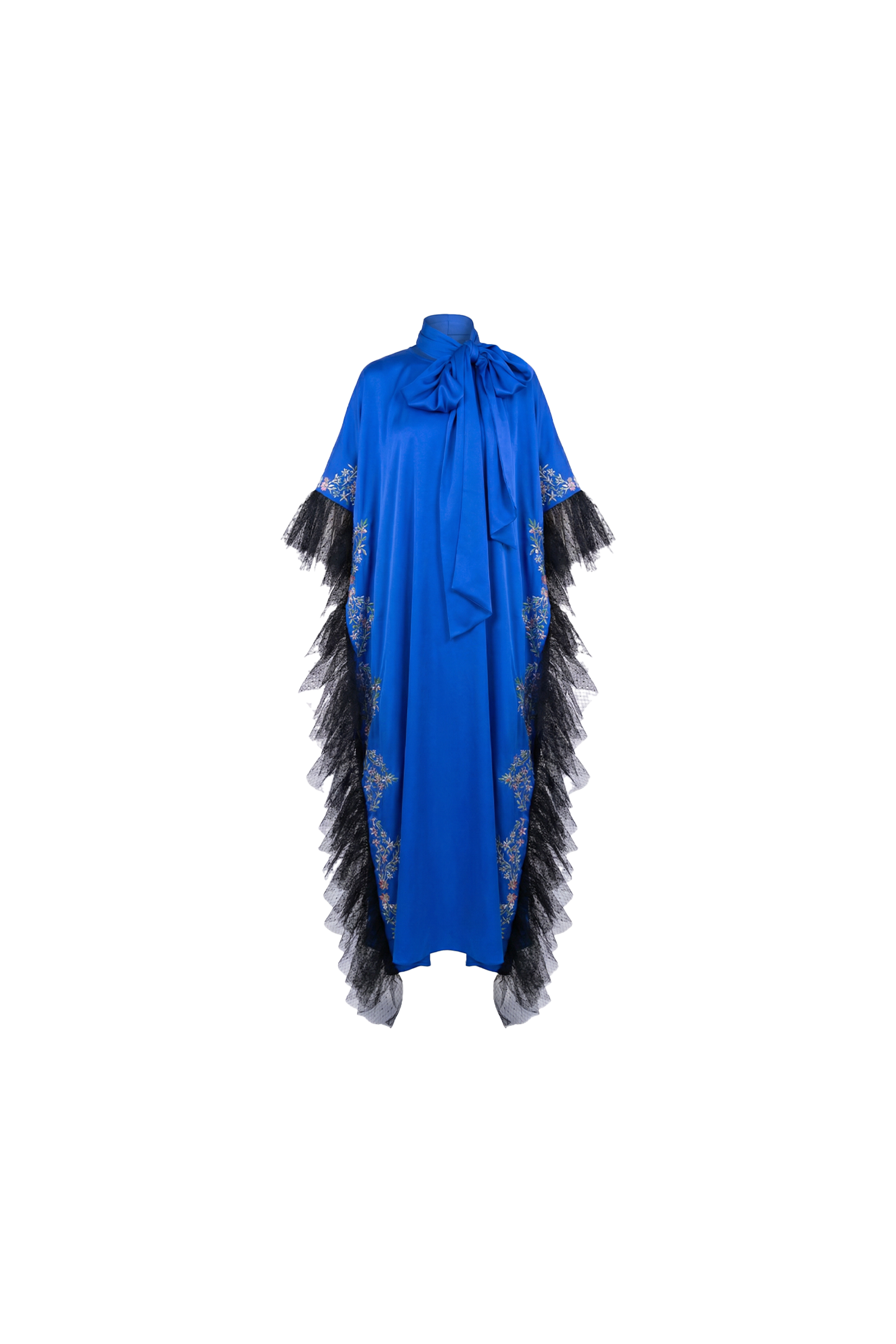 Each piece is elevated with delicate floral embroidery along the sides and sleeves, contrasted by dramatic black tulle ruffle panels that add texture, depth, and couture movement. Finished with a statement satin bow detail at the neckline, this design blends femininity with bold sophistication.