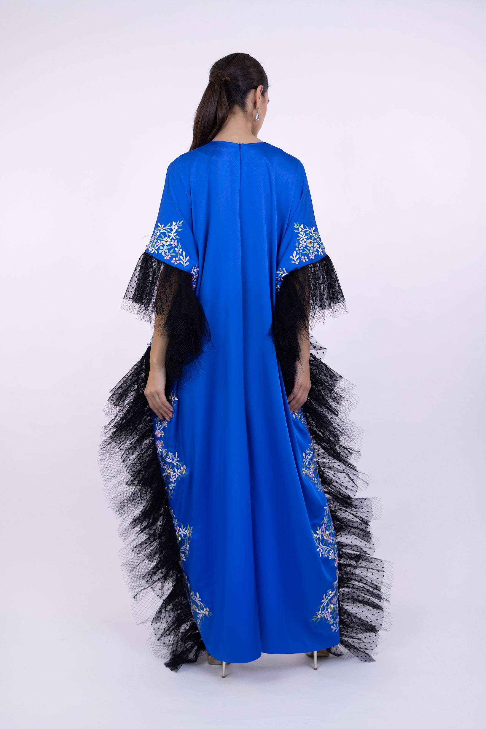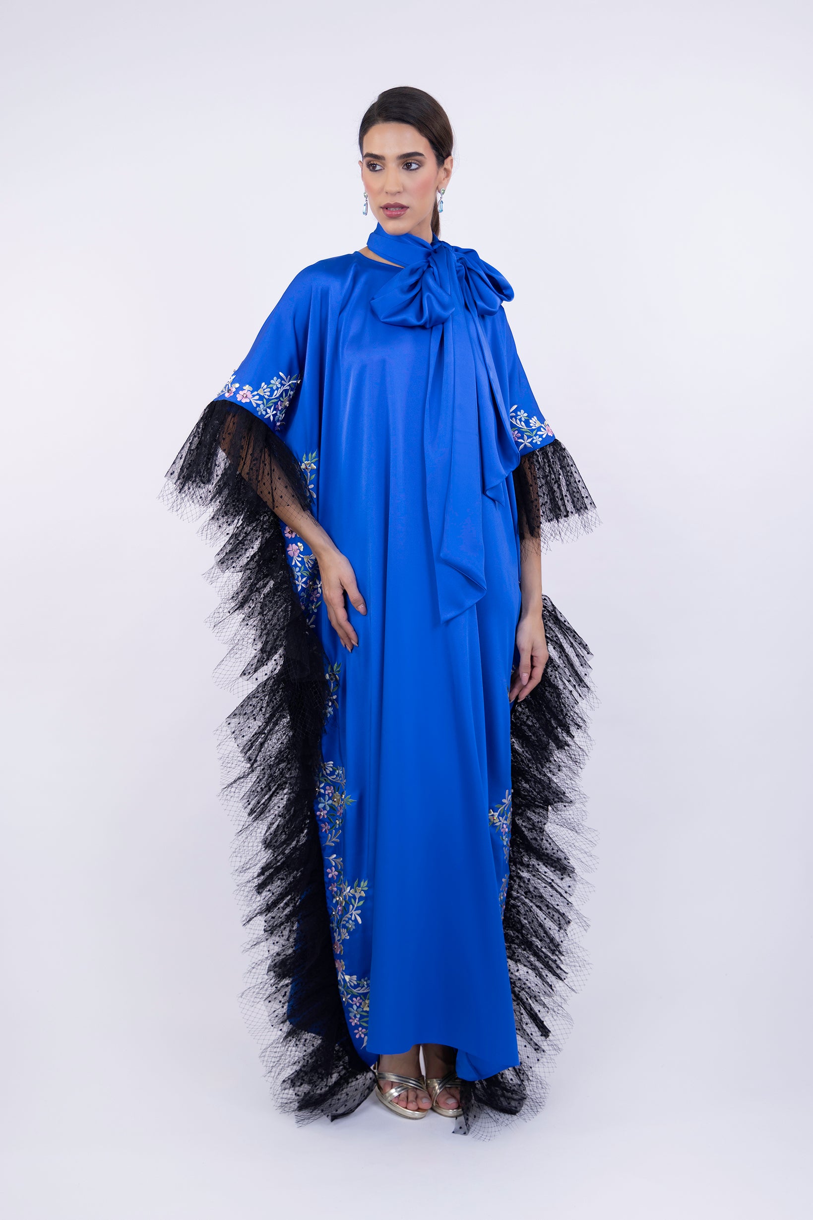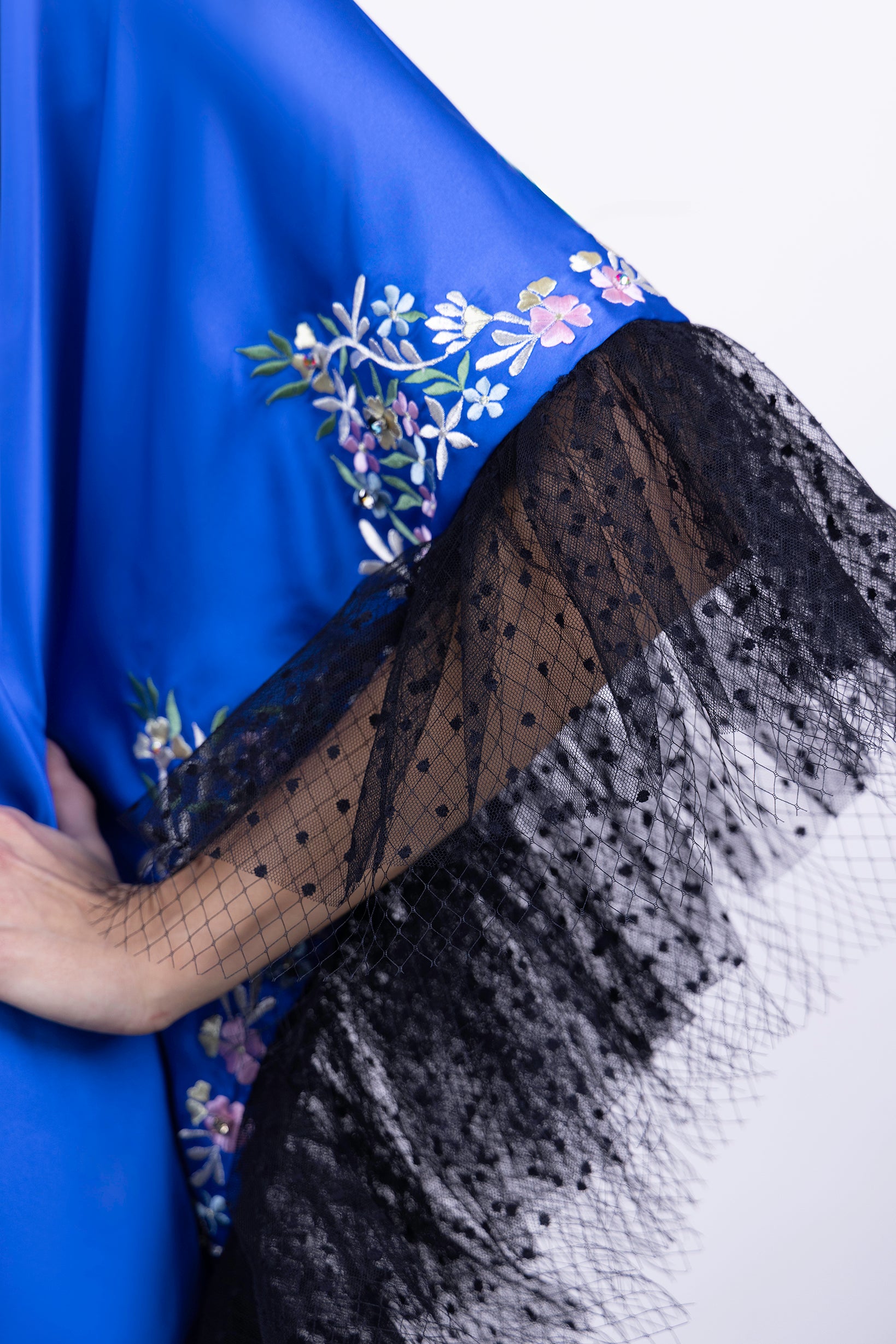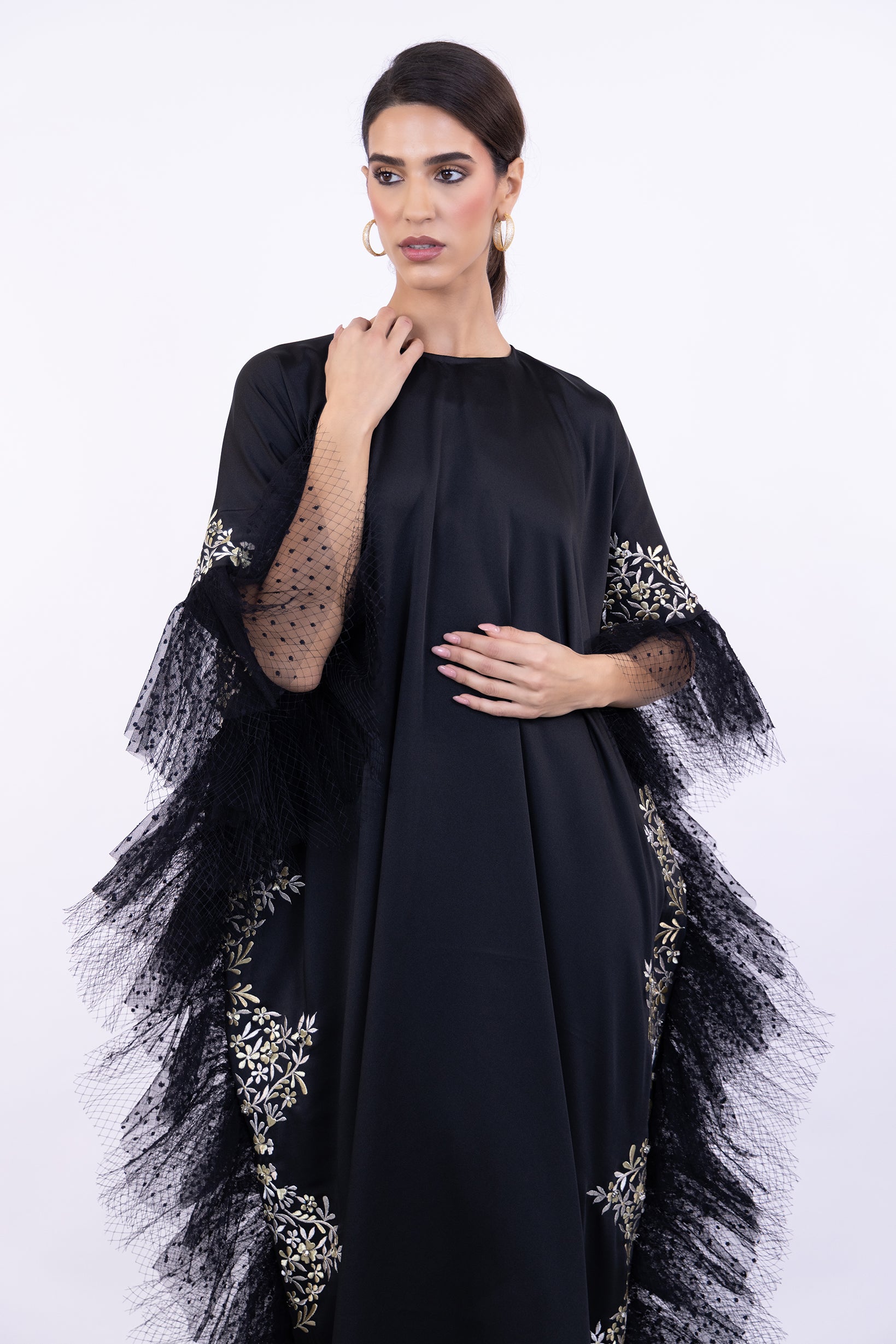 Each piece is elevated with delicate floral embroidery along the sides and sleeves, contrasted by dramatic black tulle ruffle panels that add texture, depth, and couture movement. Finished with a statement satin bow detail at the neckline, this design blends femininity with bold sophistication.