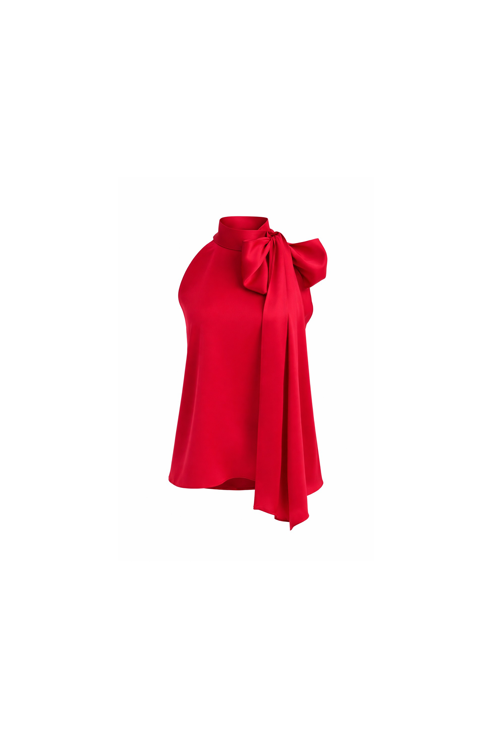 A striking red satin top featuring a sleek, glossy finish and a structured high neckline. The design is elevated by an oversized satin red bow that drapes elegantly down one side, creating a refined contrast in texture. Feminine yet bold, it blends softness and structure in a timeless, statement silhouette.