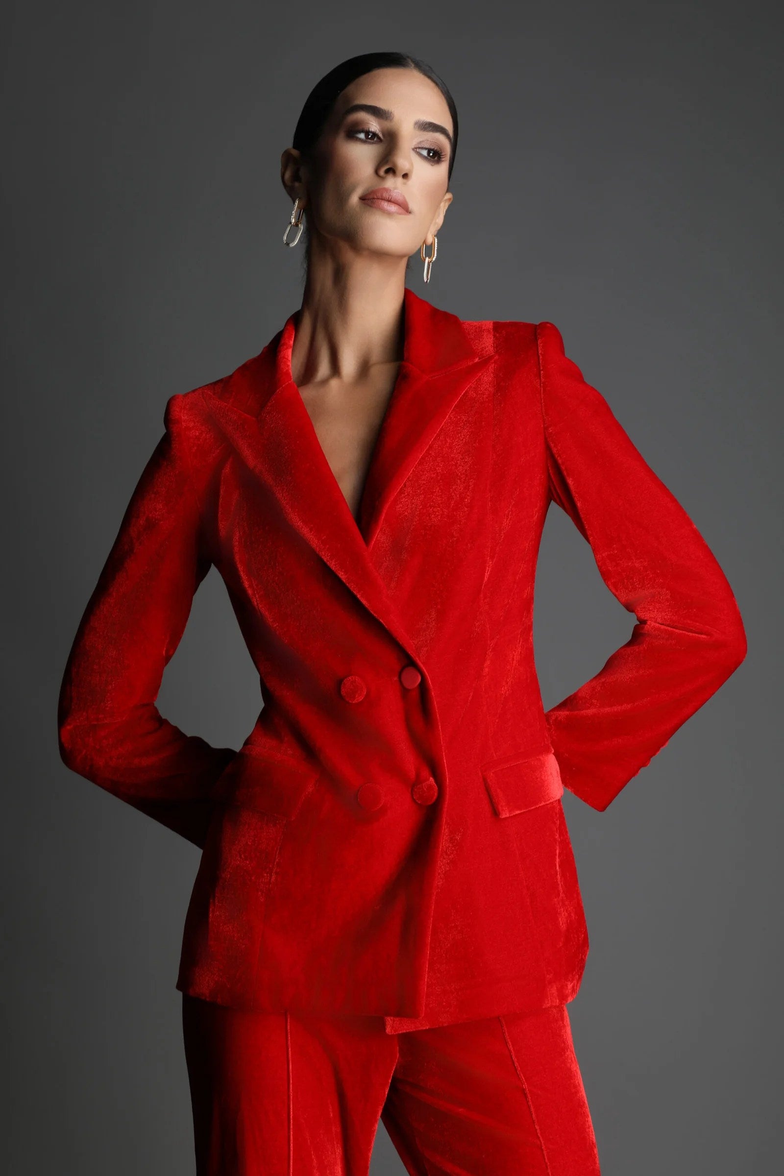 A striking tailored suit crafted from luxurious red velvet, embodying confidence and allure. The structured blazer features sharp lapels, tonal covered buttons, and precise tailoring that defines the waist. Paired with wide-leg trousers for fluid movement, the ensemble balances power and sensuality a modern statement of feminine strength wrapped in timeless sophistication.