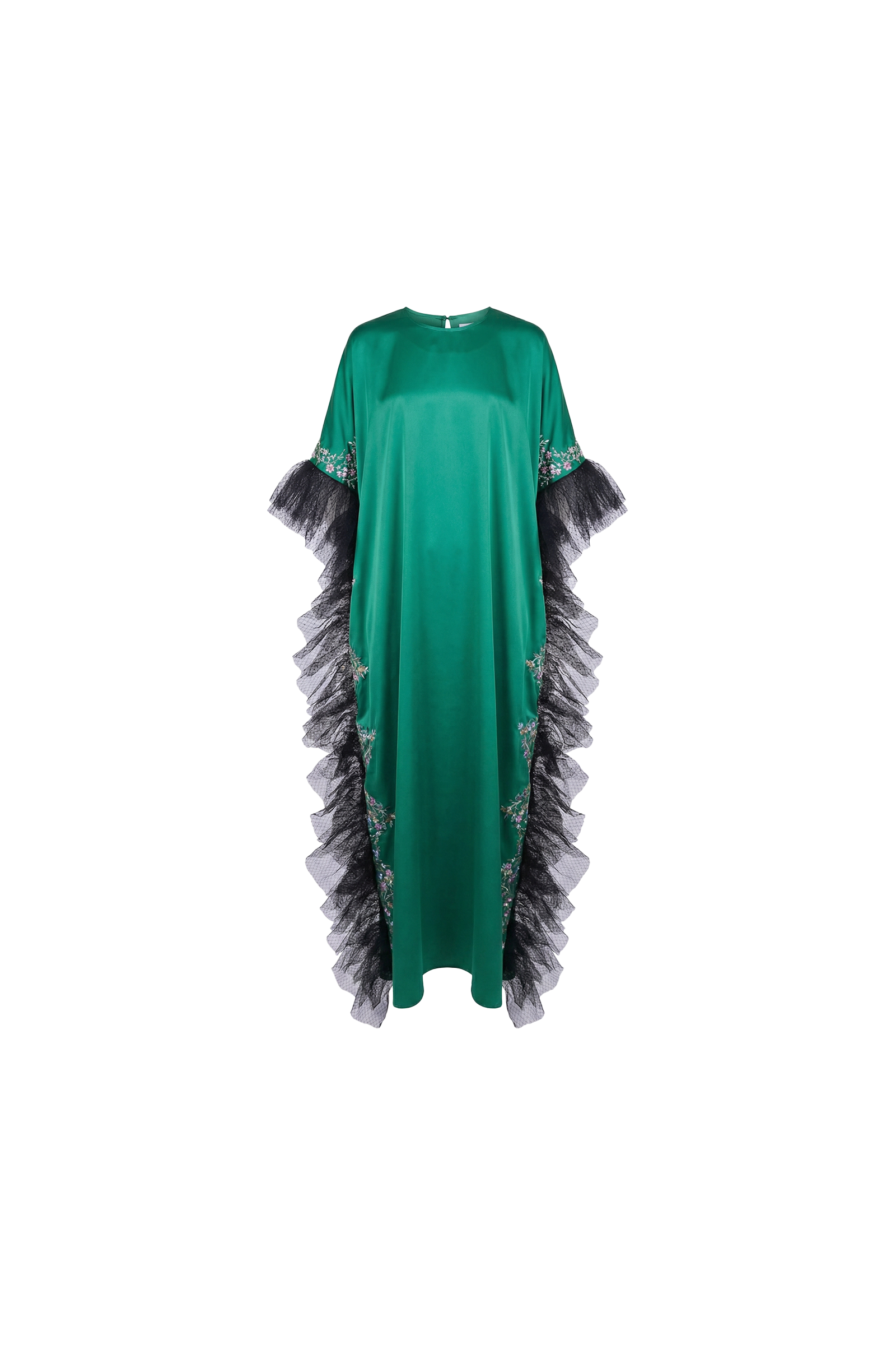 Each piece is elevated with delicate floral embroidery along the sides and sleeves, contrasted by dramatic black tulle ruffle panels that add texture, depth, and couture movement. Finished with a statement satin bow detail at the neckline, this design blends femininity with bold sophistication.