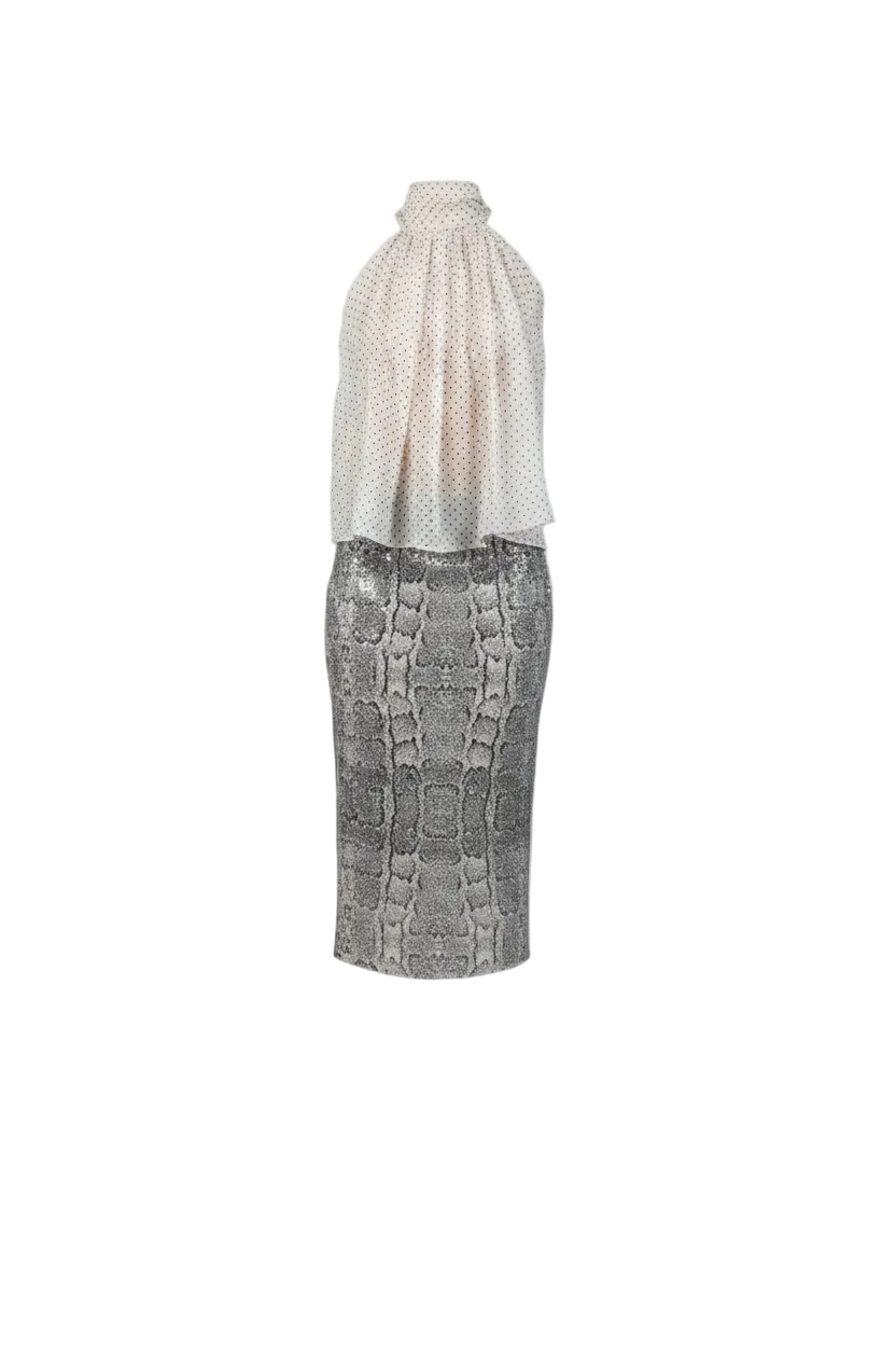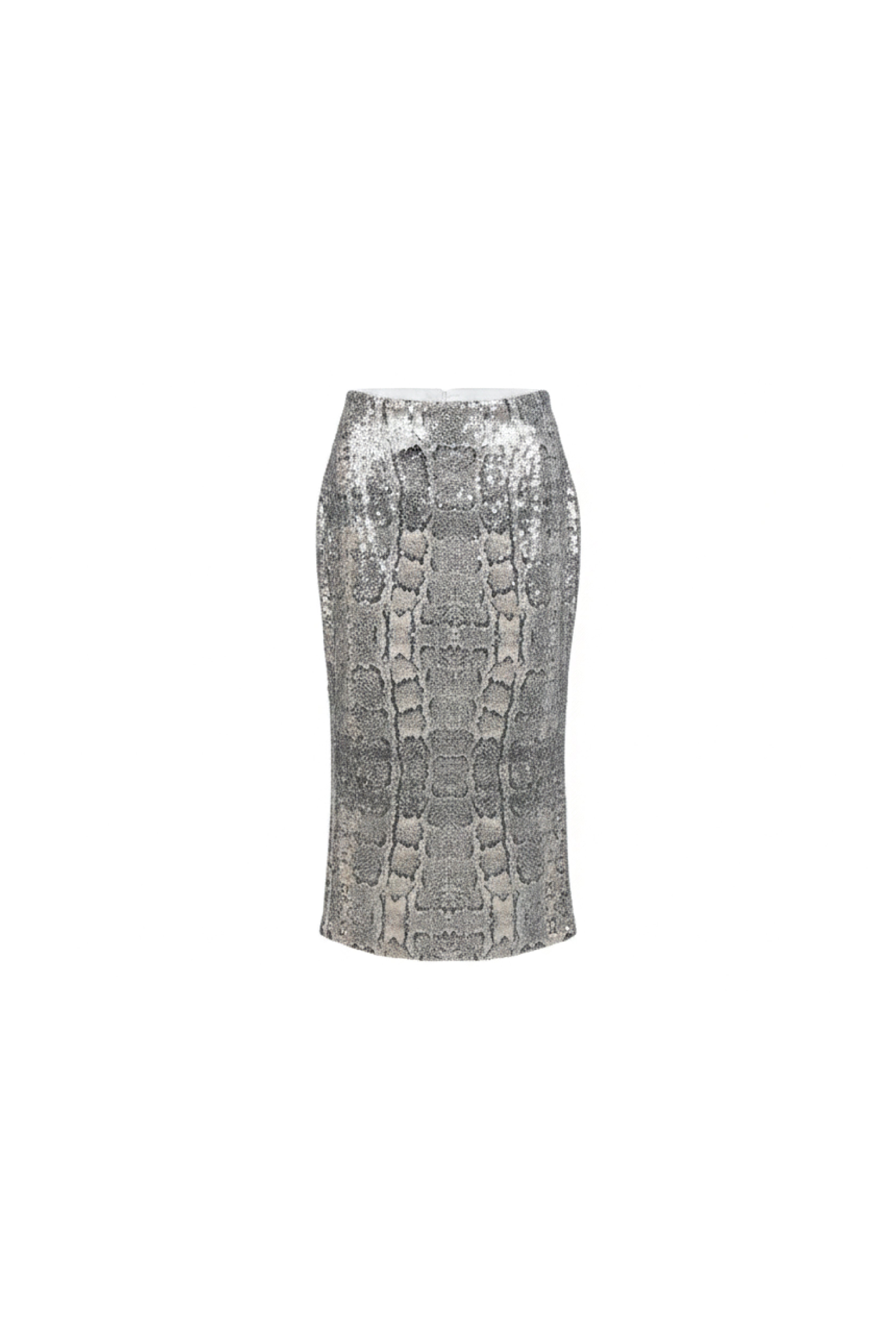 A high-waisted midi pencil skirt tailored from shimmering lizard-pattern payette, sculpting the body with a sleek, elongated silhouette. The fabric catches the light with every step, creating a metallic, reptile-inspired texture that feels both bold and refined. A statement piece that pairs effortlessly with soft chiffons or structured tailoring.
