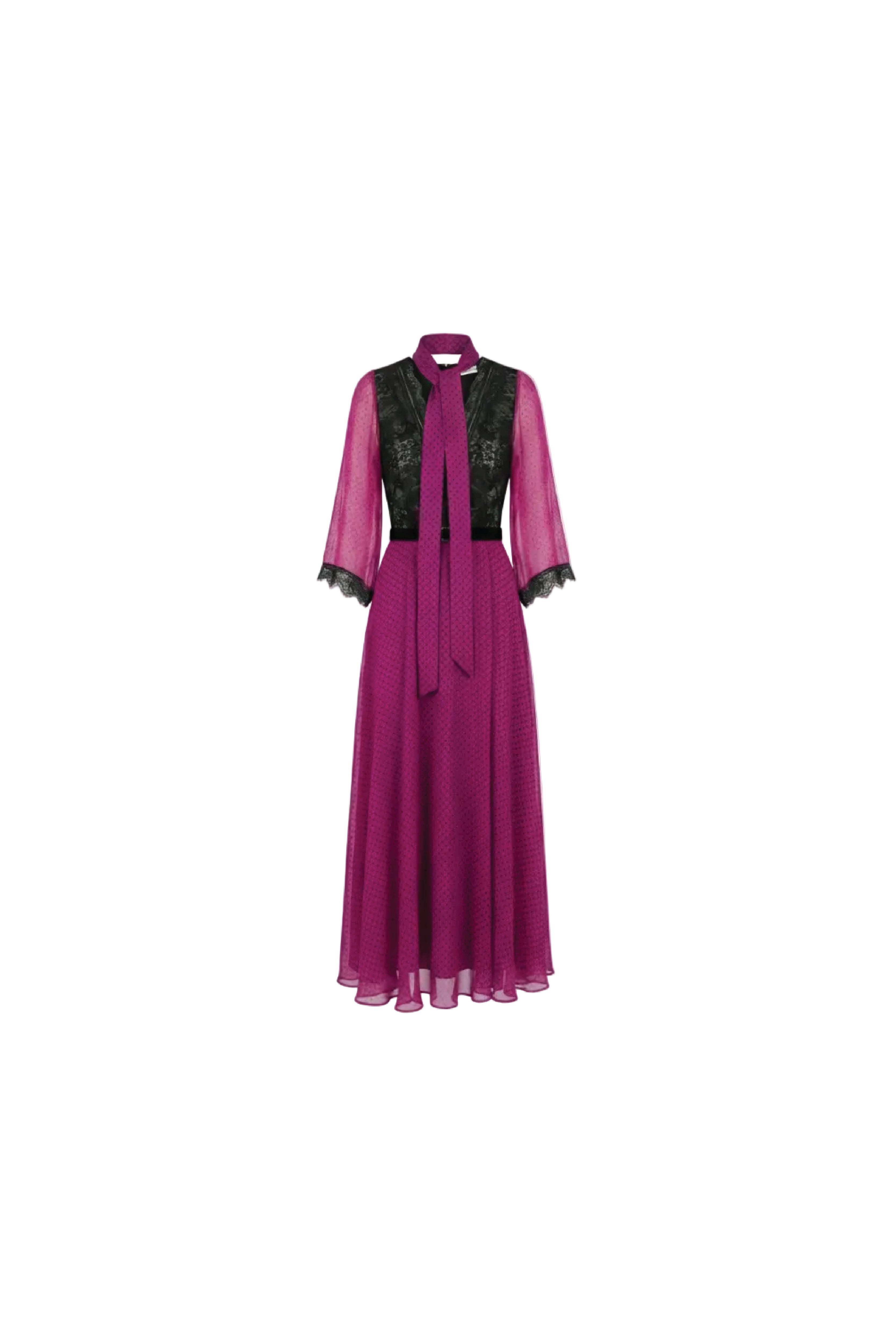 A striking piece combining bold fuchsia chiffon with delicate black lace detailing. The bodice features a deep V-neck in semi-sheer lace, framed by transparent dotted sleeves finished with soft lace cuffs. A long, flowing fuchsia dotted maxi skirt adds movement and volume, while the coordinating self-tie neck scarf completes the look with sophisticated drama. Feminine, airy, and irresistibly elegant.