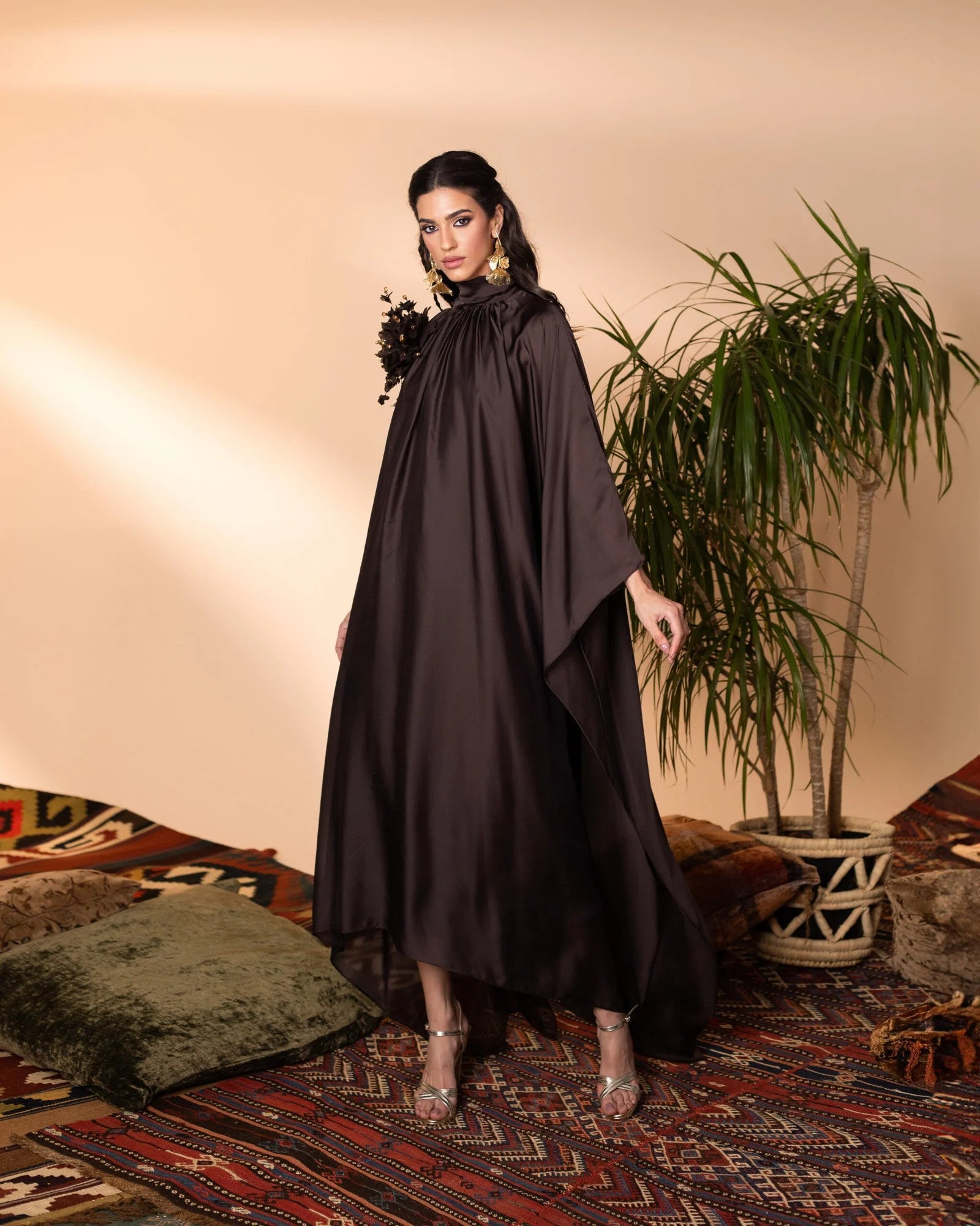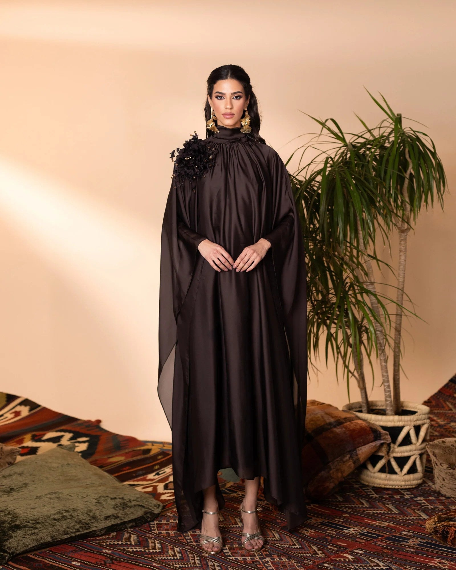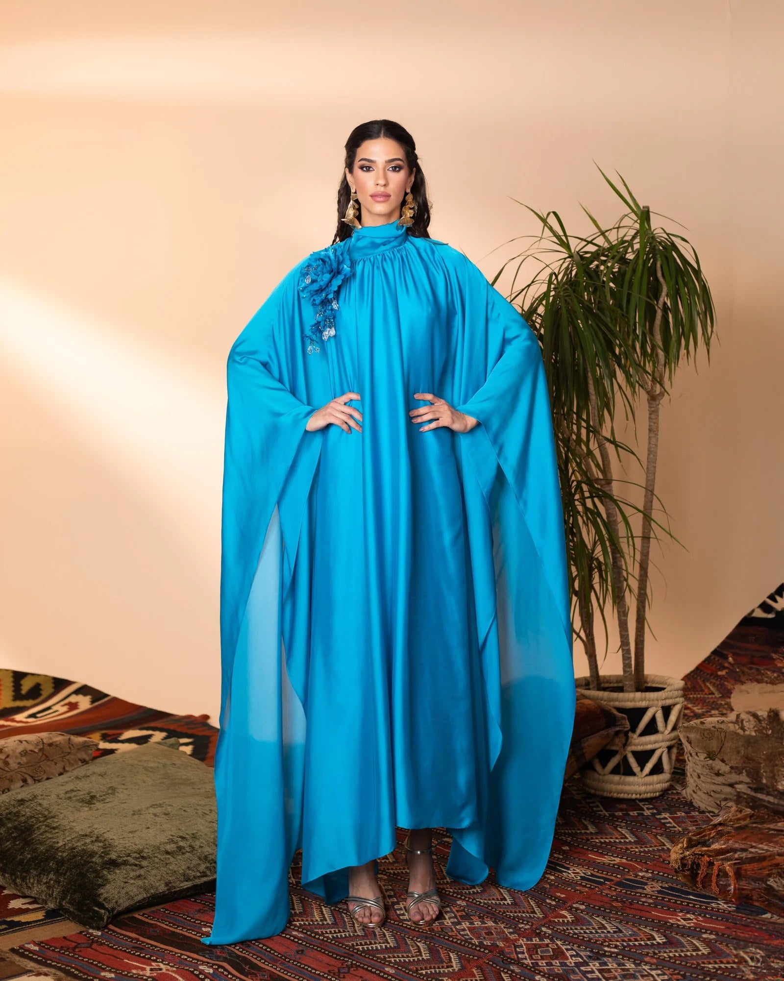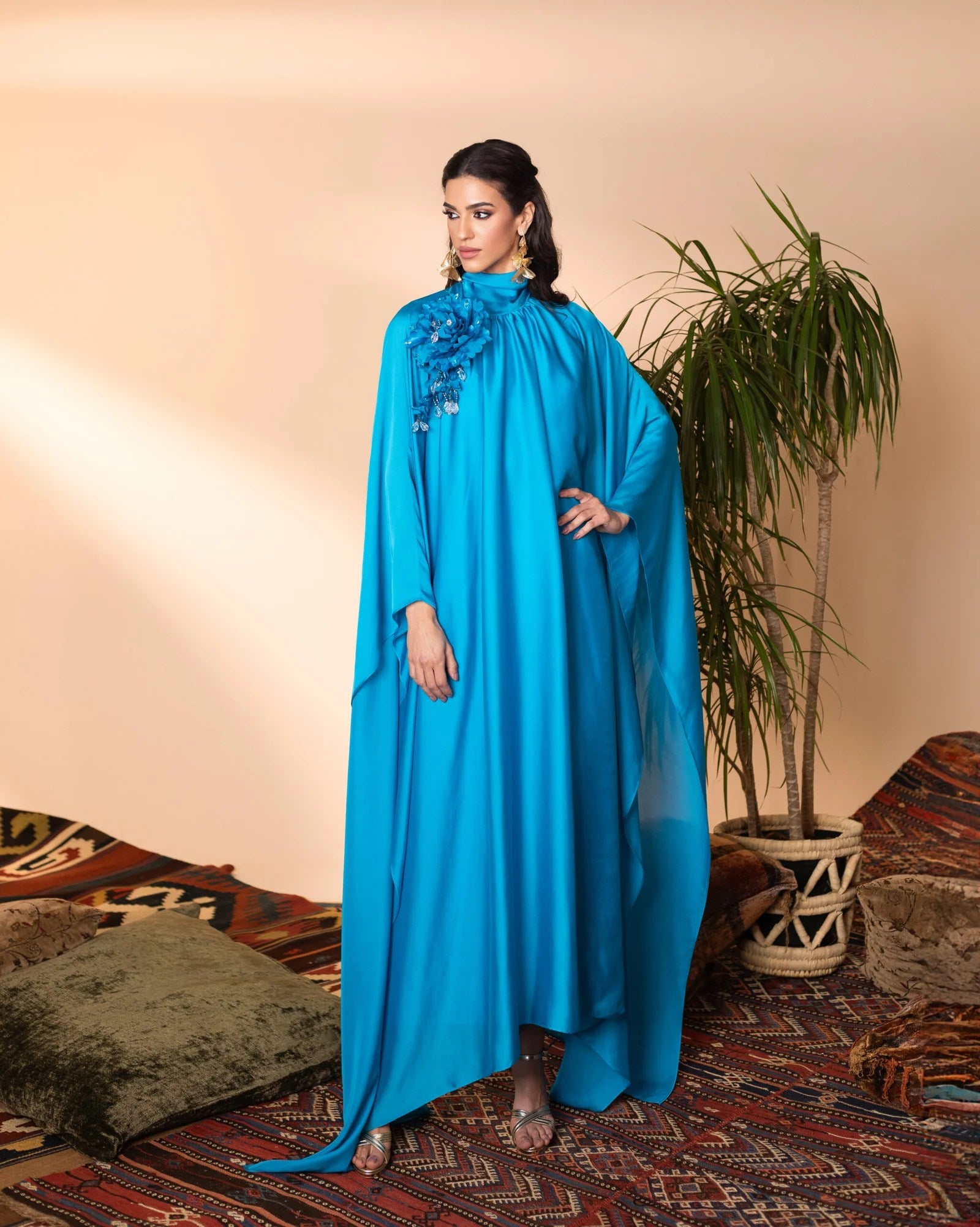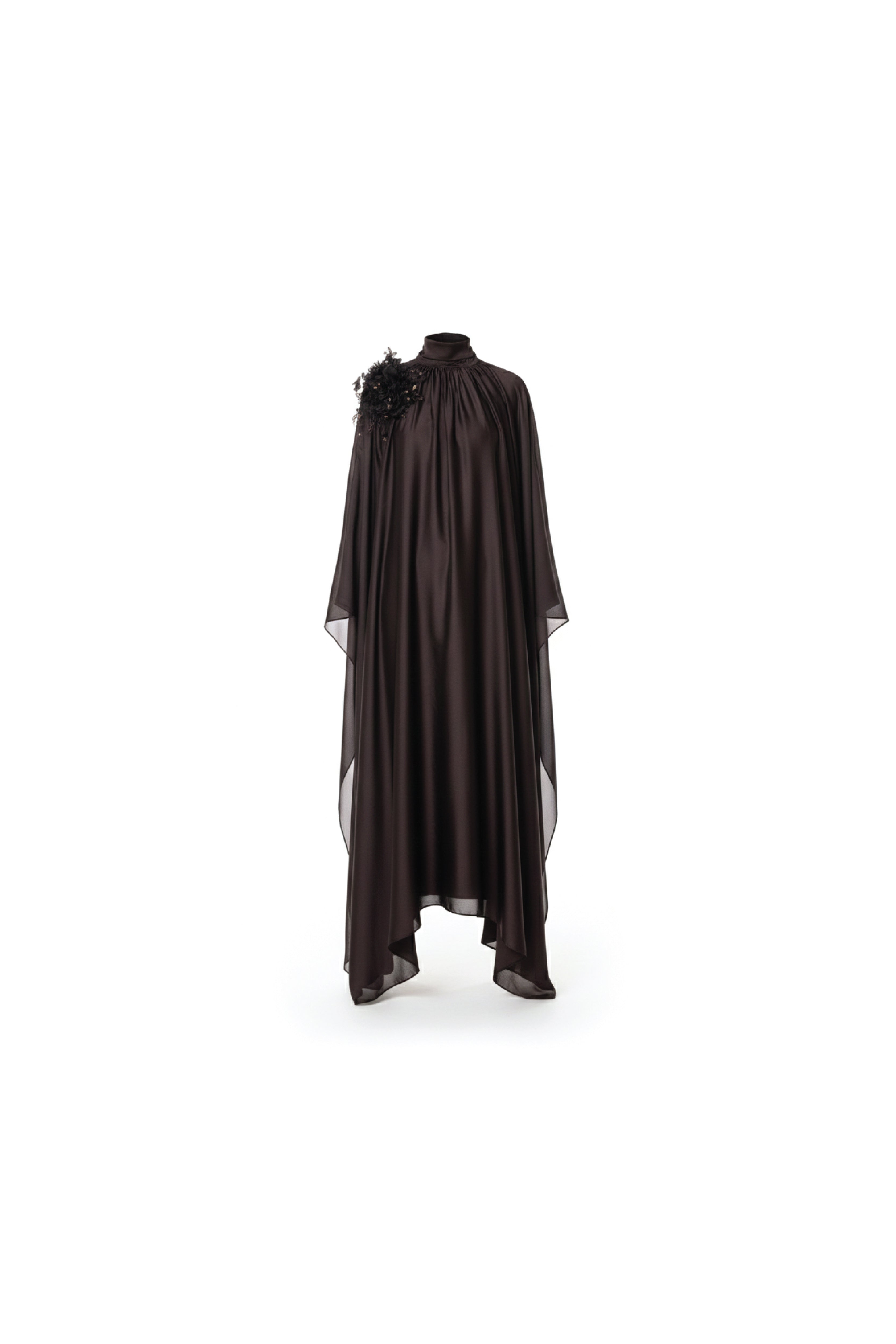 This elegant silk kaftan exudes sophistication with its flowing silhouette and ethereal charm. Adorned with a handcrafted, removable floral embellishment on the shoulder, it adds a touch of delicate artistry. The fluid drape and subtle sheen of the fabric create a mesmerizing effect, making this piece a timeless statement of refined grace.