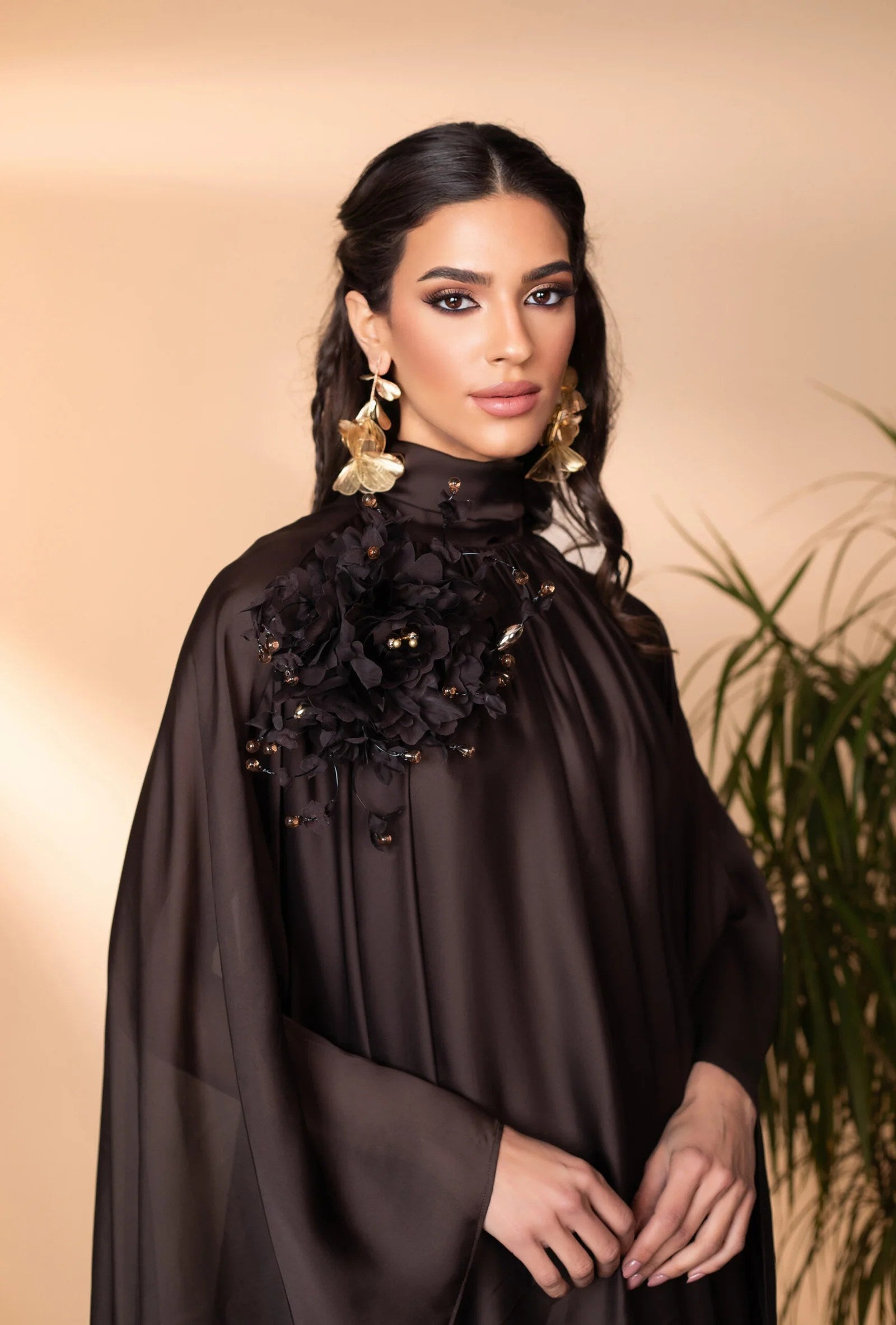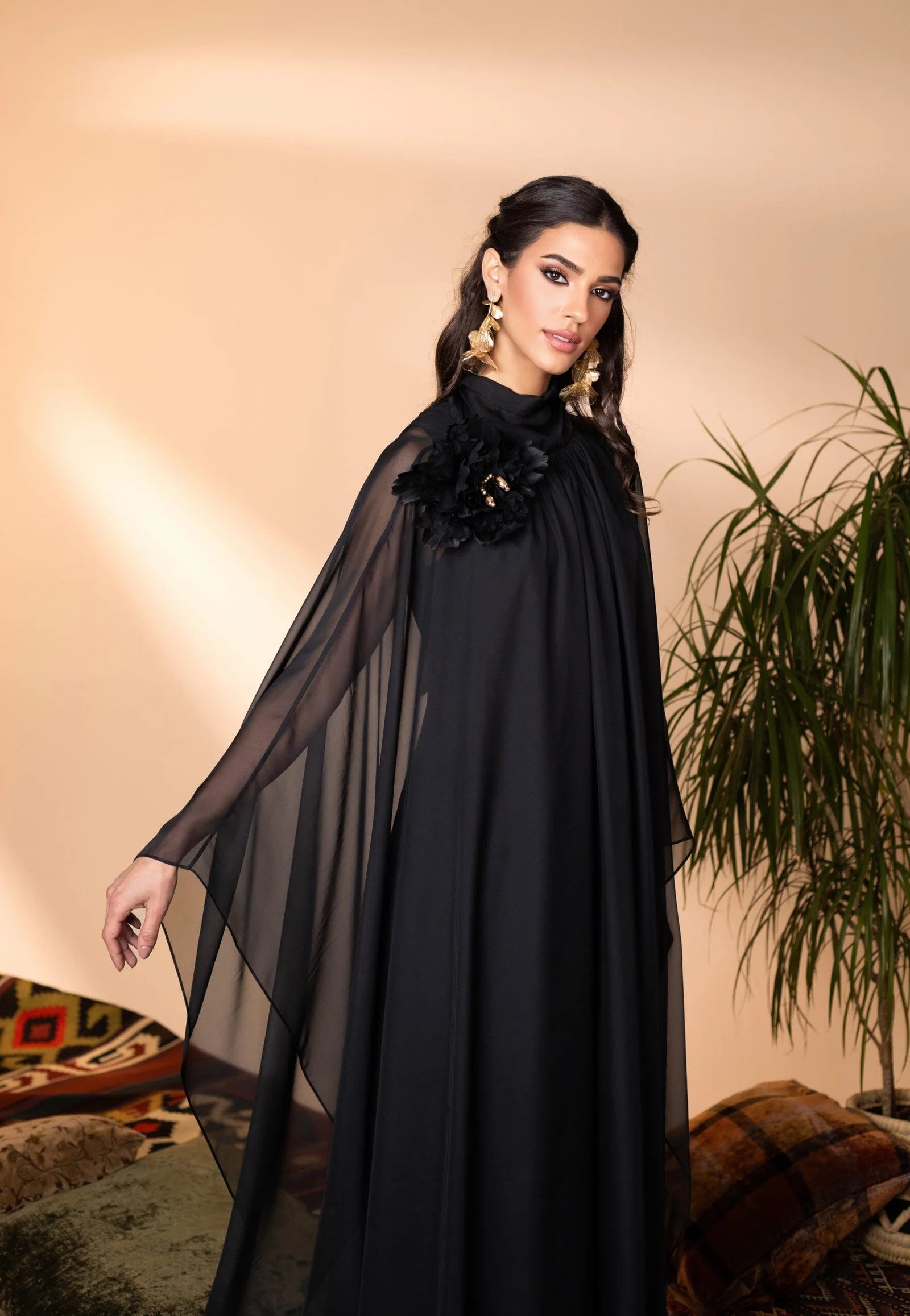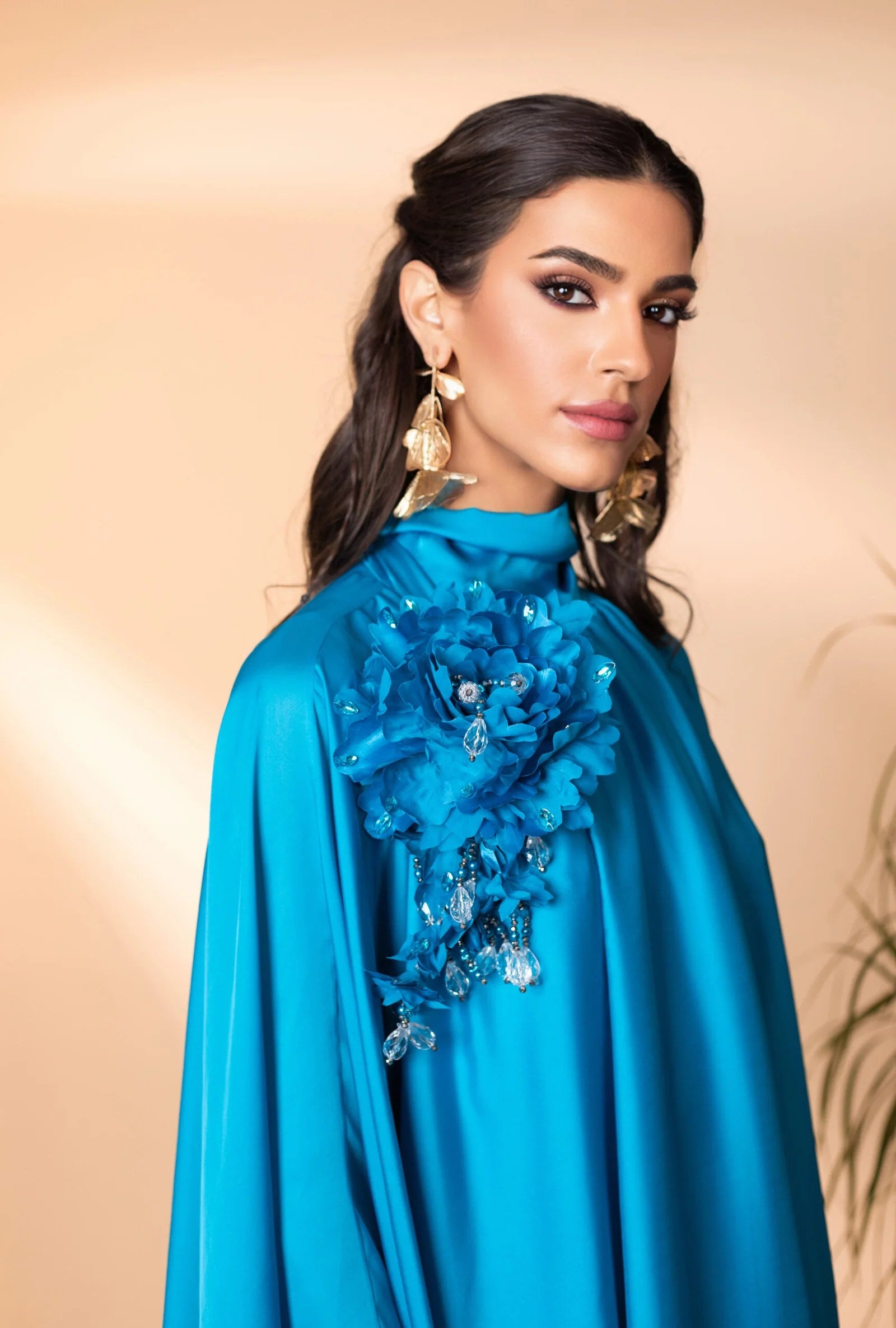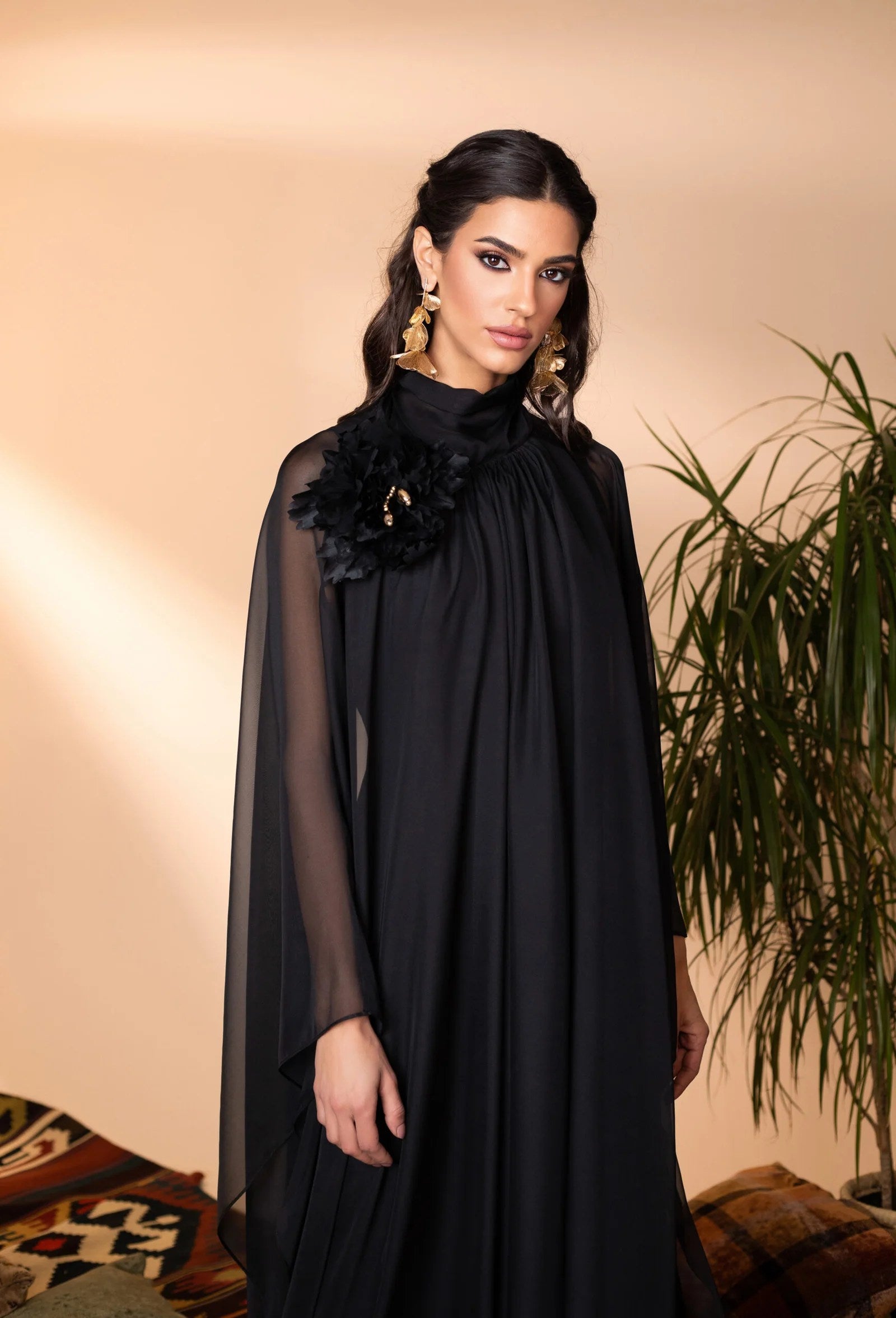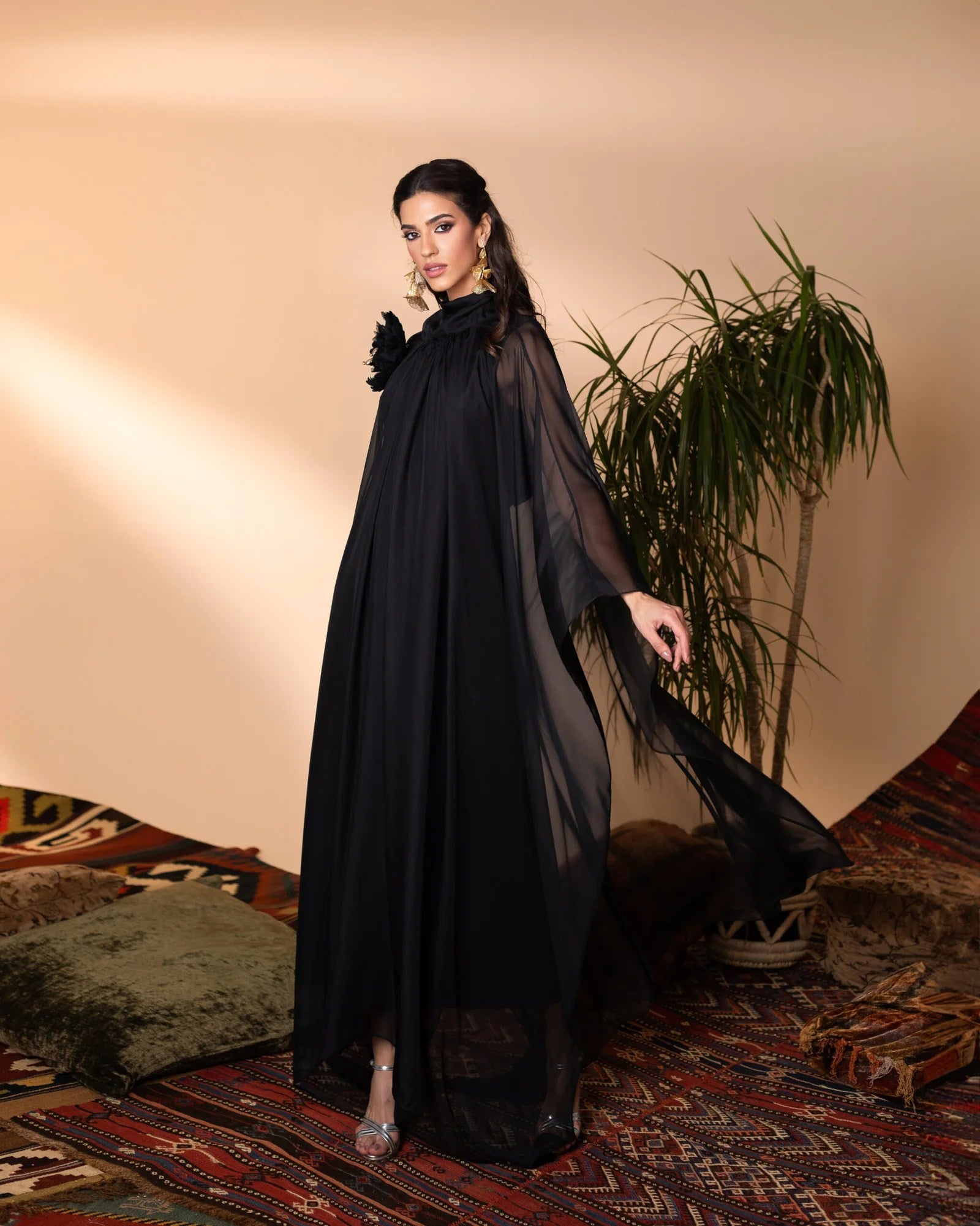 This elegant silk kaftan exudes sophistication with its flowing silhouette and ethereal charm. Adorned with a handcrafted, removable floral embellishment on the shoulder, it adds a touch of delicate artistry. The fluid drape and subtle sheen of the fabric create a mesmerizing effect, making this piece a timeless statement of refined grace.