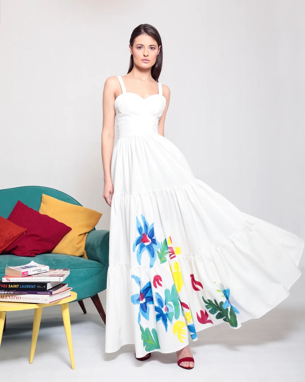 superimposed into cotton silk. This dress has a special silhouette, fits all body shape. Handmade painting. You can match it with high heels for a cocktail look.